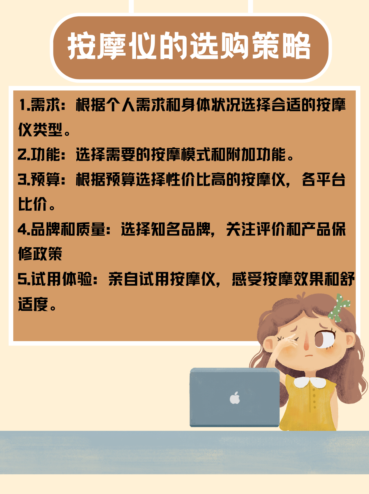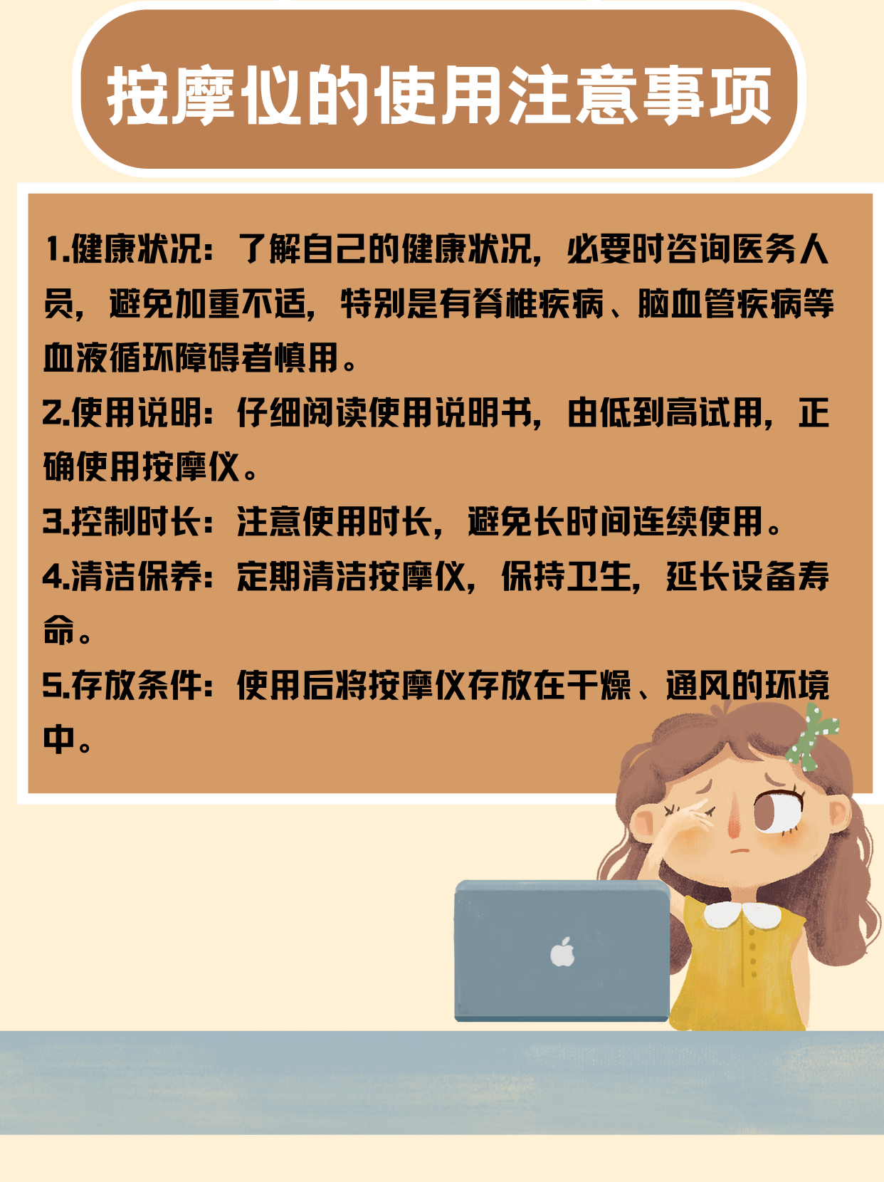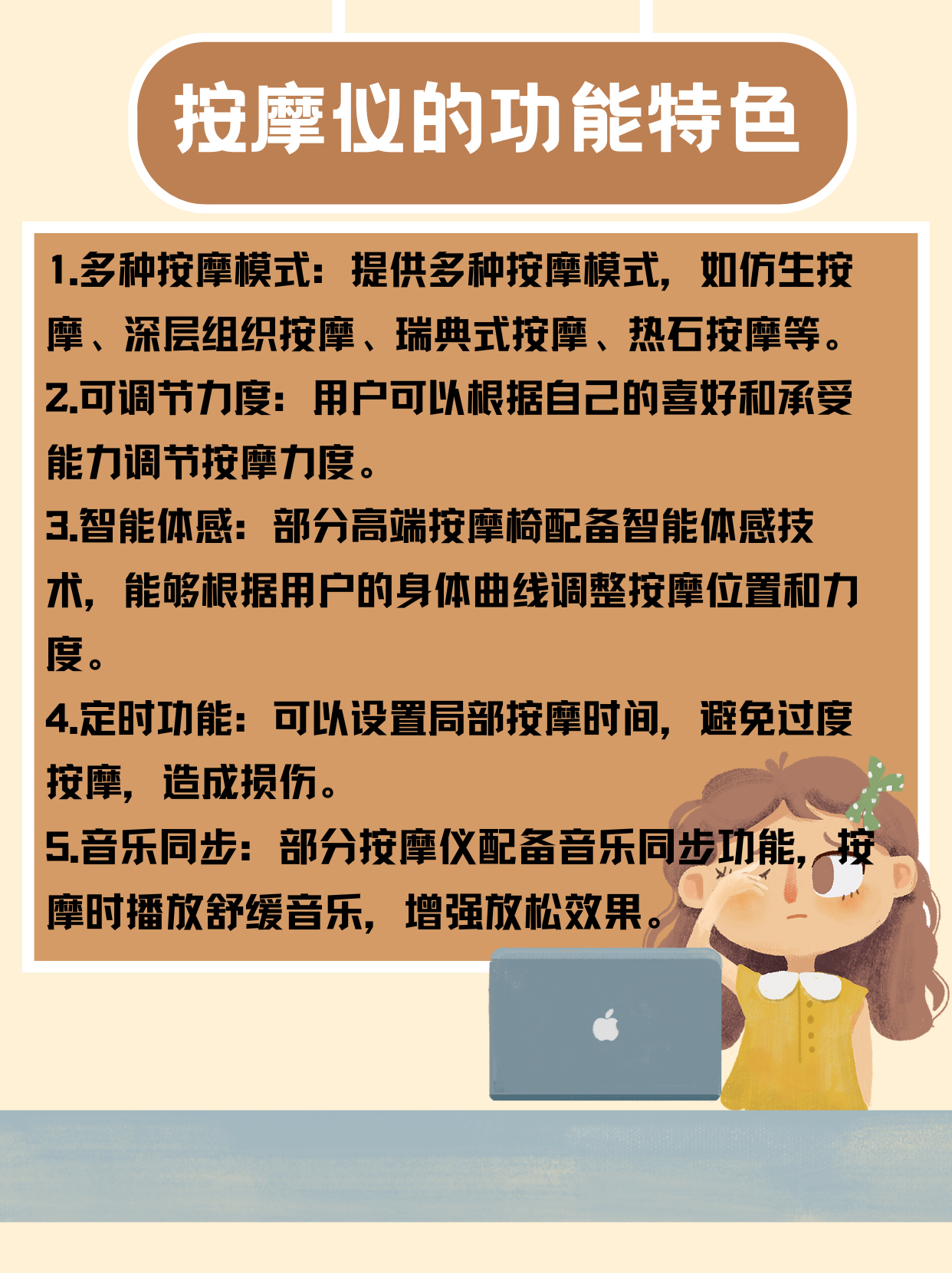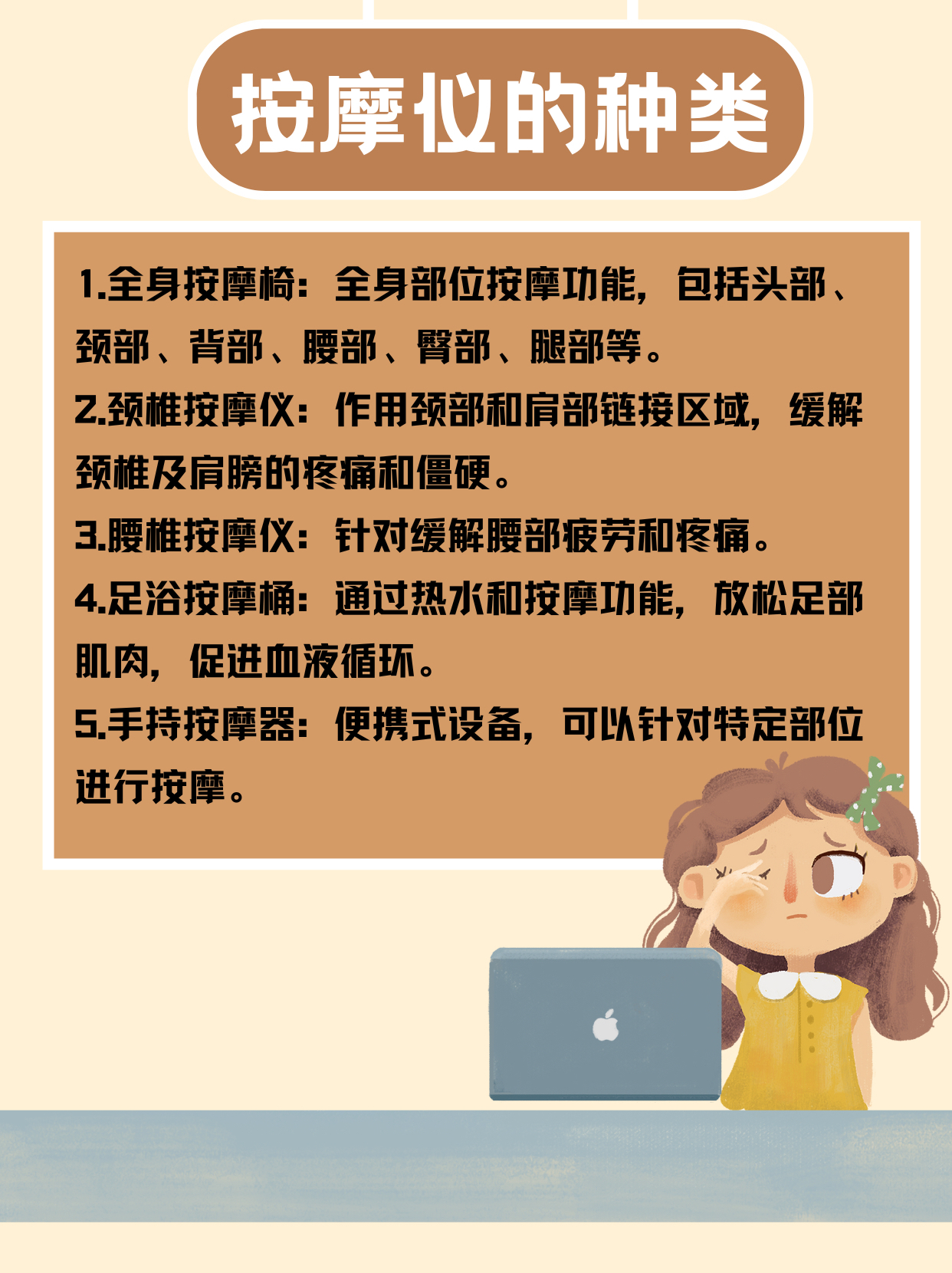 👉🏻按摩仪的种类 1.全身按摩椅:全身部位按摩功能,包括头部、颈部、背部、腰部、臀部、腿部等。 2.颈椎按摩仪:作用颈部和肩部链接区域,缓解颈椎及肩膀的疼痛和僵硬。 3.腰椎按摩仪:针对缓解腰部疲劳和疼痛。 4.足浴按摩桶:通过热水和按摩功能,放松足部肌肉,促进血液循环。 5.手持按摩器:便携式设备,可以针对特定部位进行按摩。 👉🏻 按摩仪的运作原理 1.物理按摩:通过内置的机械手臂模拟人手按摩手...