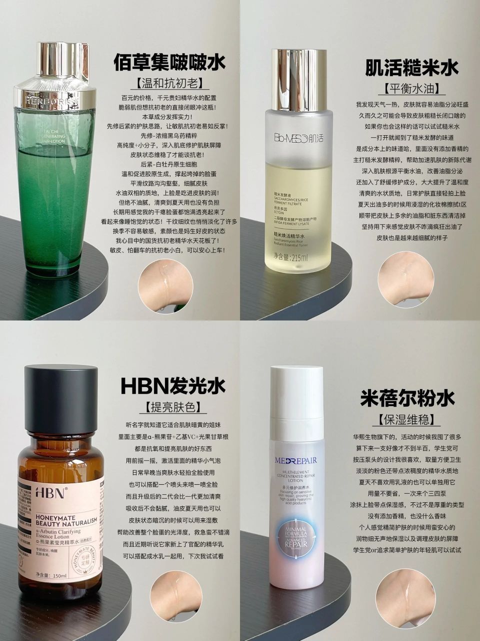 现在的国货真的越来越给力了 成分、使用感和效果都嘎嘎在线,而且性价比也敲高 今天分享分享几瓶我喜欢用的国货精华水们 不管是化妆前还是洗完脸后,甚至是懒得护肤时 先用一层水,给肌肤打好底子,而且精华水买对堪比精华啊! 有想要入手的姐妹可以先来做功课📝 - 佰草集啵啵水-温和抗初老 肌活糙米水-平衡水油 HBN发光水-提亮肤色 米蓓尔粉水-保湿维稳 - 护肤品千人千面,效果因人而异 姐妹们做好功课,理...