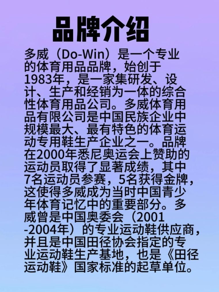 ☘️品牌介绍 多威(Do-Win)是一个专业的体育用品品牌,始创于1983年,是一家集研发、设计、生产和经销为一体的综合性体育用品公司。多威体育用品有限公司是中国民族企业中规模最大、最有特色的体育运动专用鞋生产企业之一。 ☘️品牌赞助 品牌在2000年悉尼奥运会上赞助的运动员取得了显著成绩,其中7名运动员参赛,5名获得金牌,这使得多威成为当时中国青少年体育记忆中的重要部分。 多威曾是中国奥委会(...