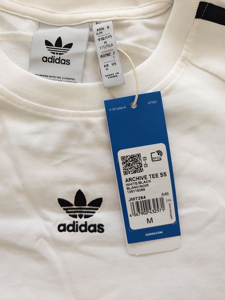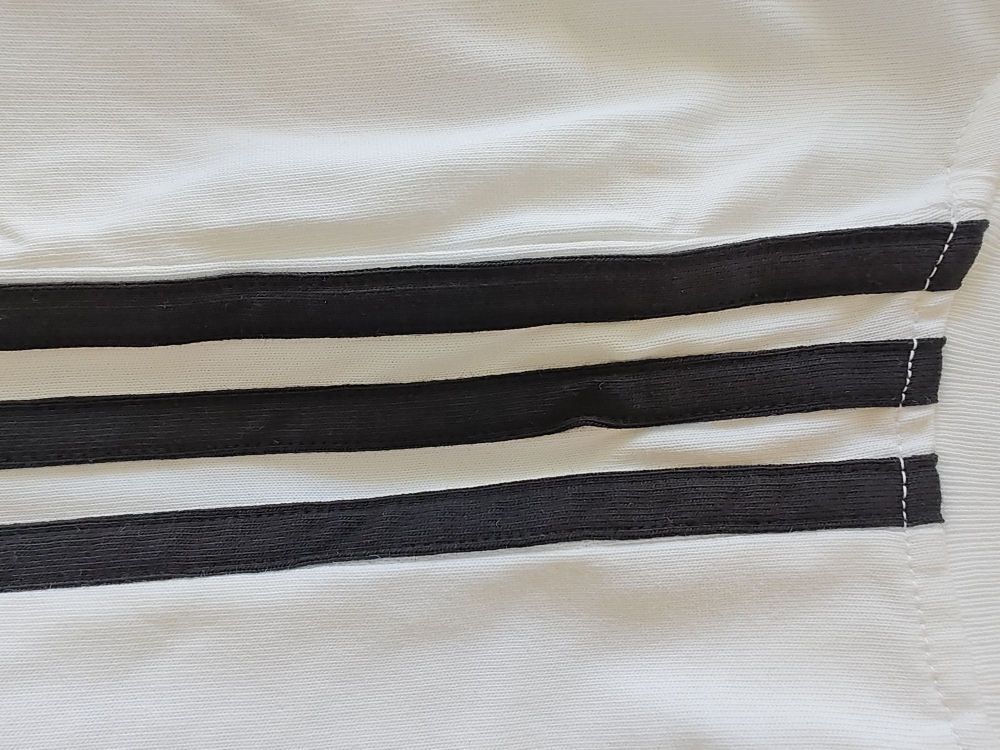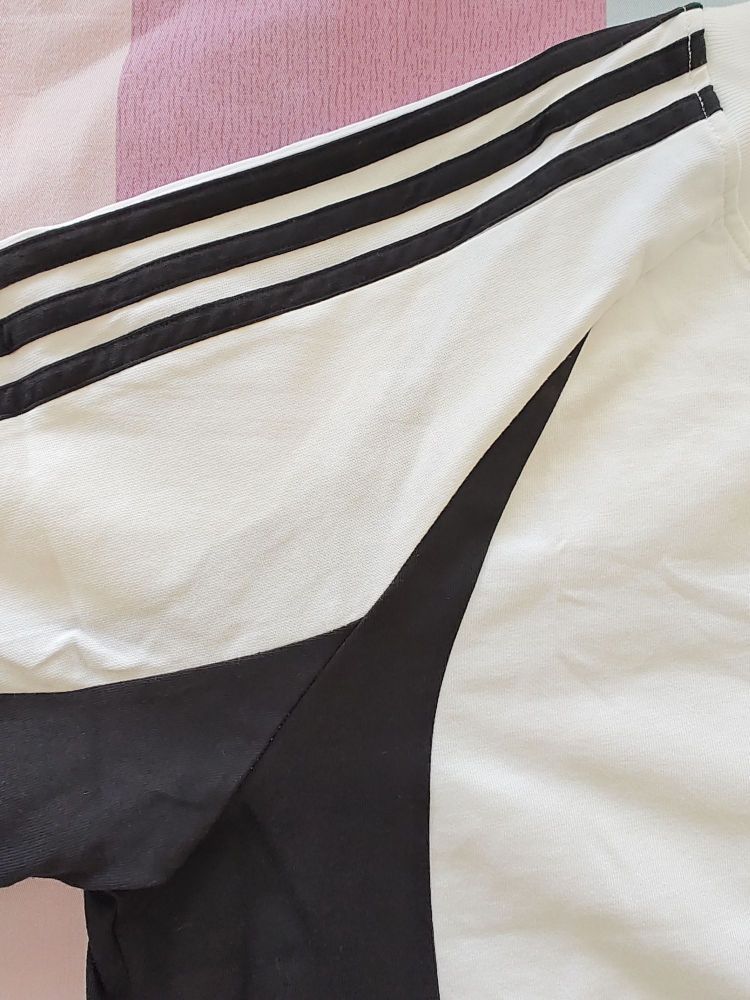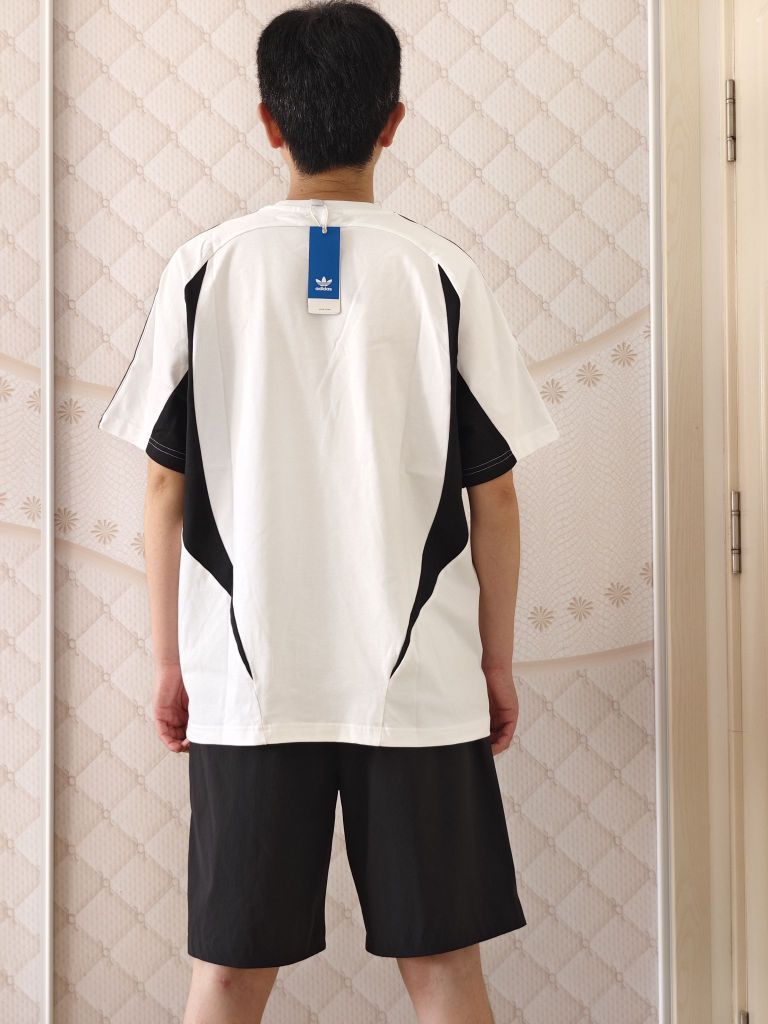 6月最后一天收到了6月刚出厂的一件短袖, 简约不简单的款式, 黑白拼接,100%纯棉面料,胸前刺绣标 黑色三条纹点缀的恰到好处。 宽松版型,面料摸起来挺厚的, 比较有质感,属于高织高密那种。 穿上身洋溢着一种青春活力的感觉啊。 当时一看到这款立马就迷上了,必须拿下!