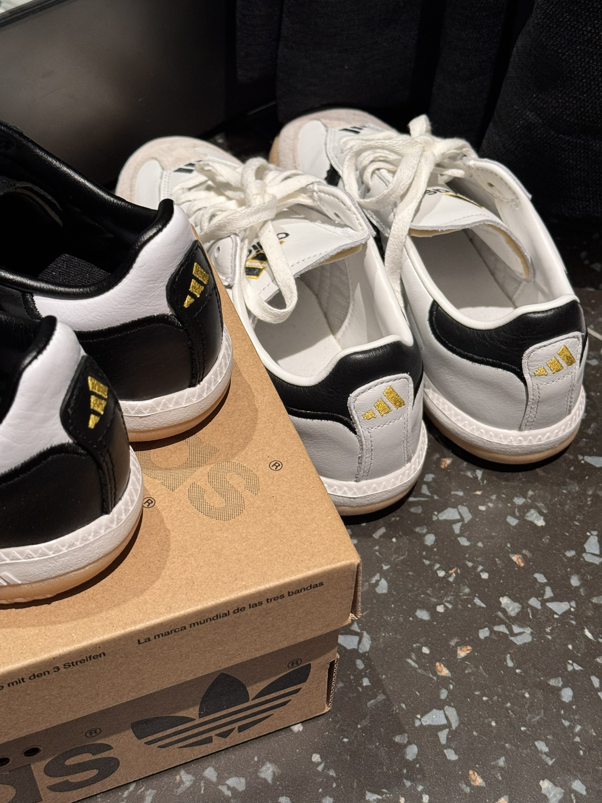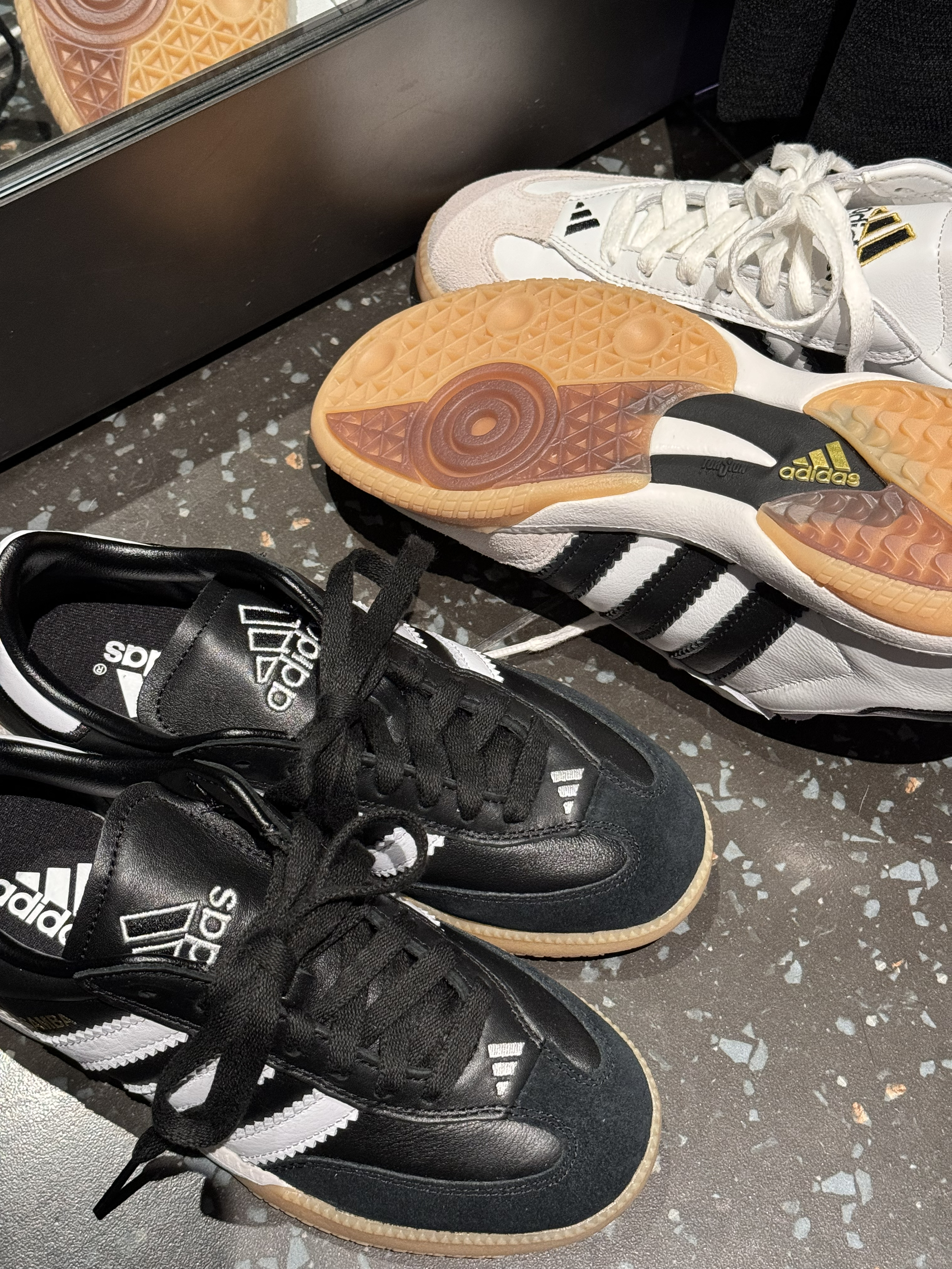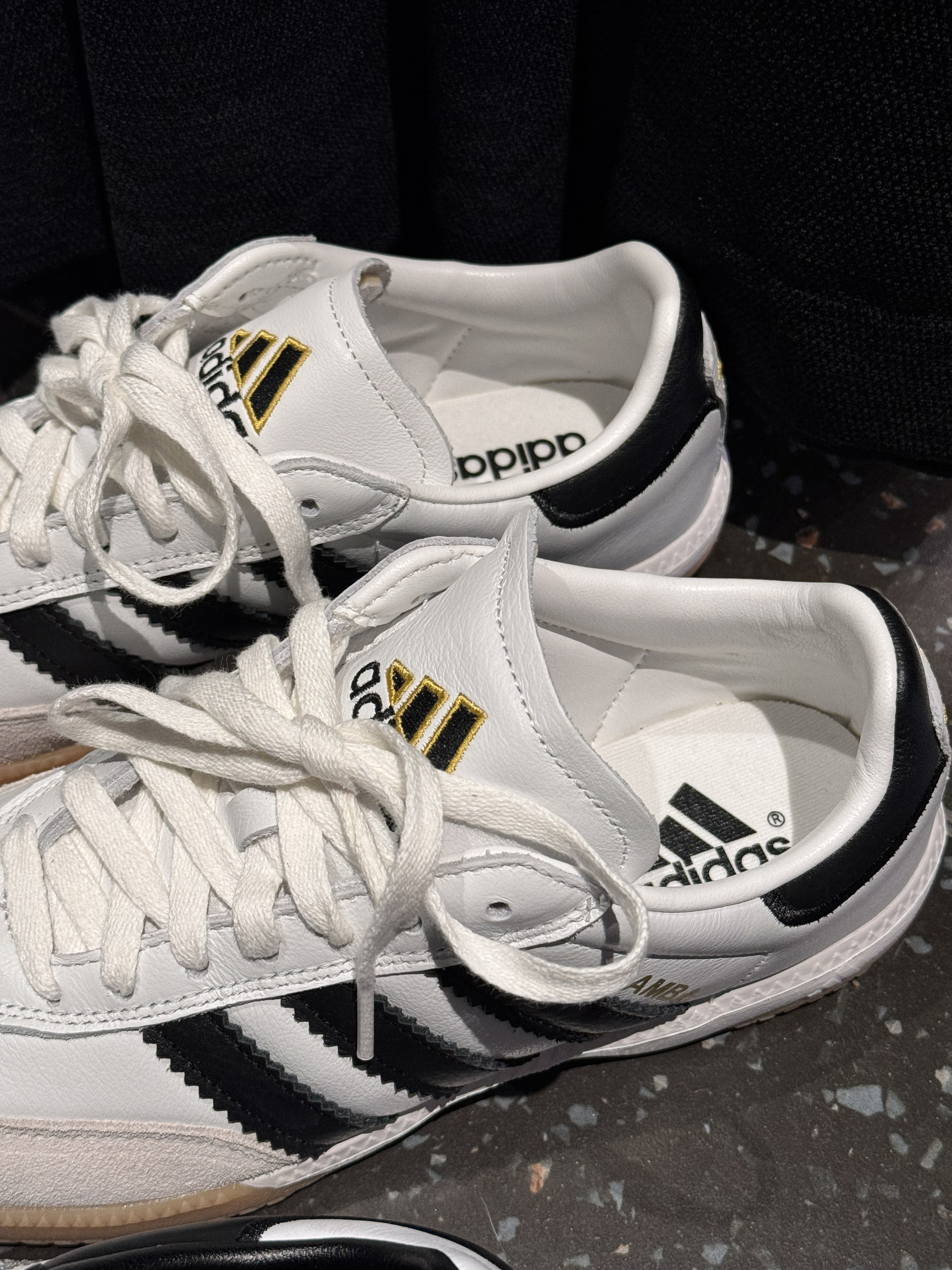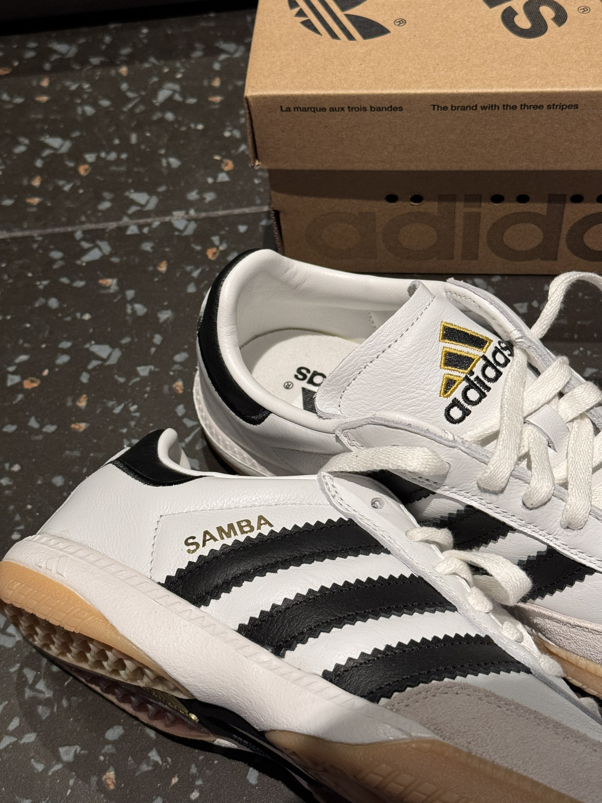 是一双更复古更足球文化的samba就诞生了 鞋身更宽 更适合大部分人的脚型 皮质也更软 后跟和鞋舌舒适度更高咯 鞋子是山形logo 鞋底显示增加了抗扭转的 Torsion科技这对samba的实穿性又多了几分