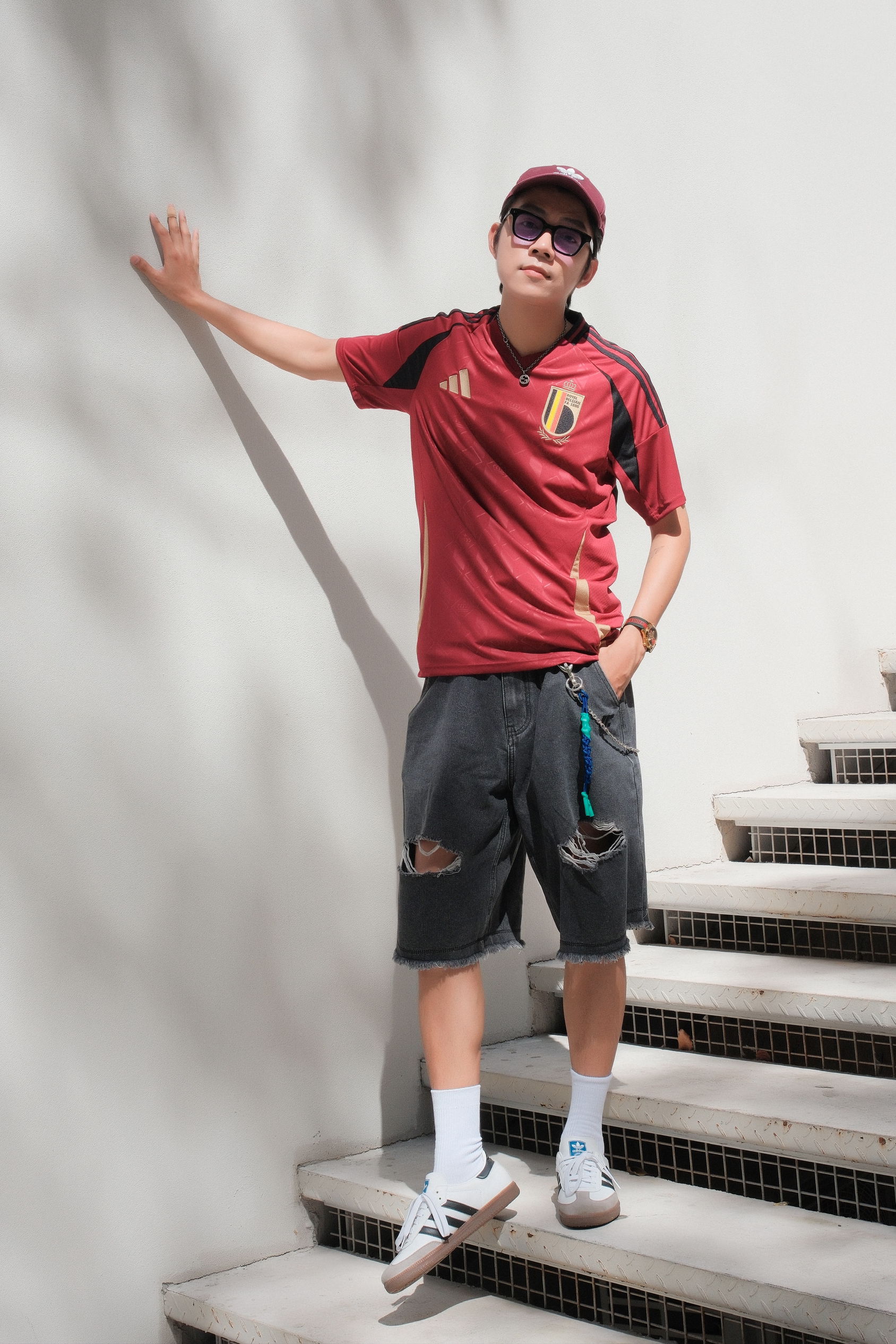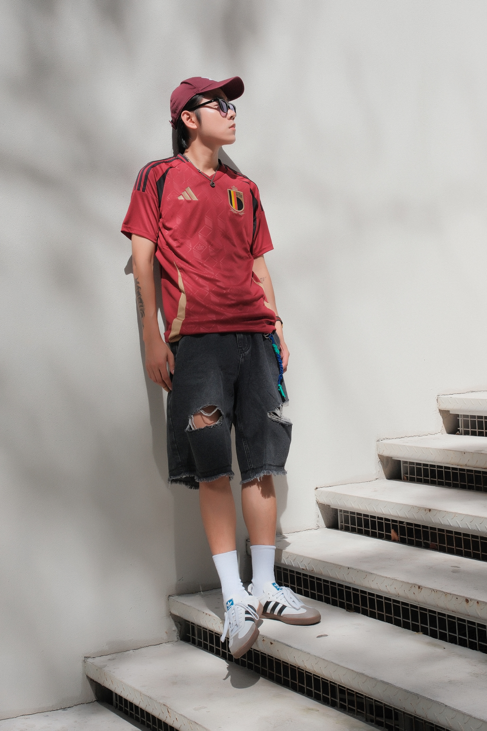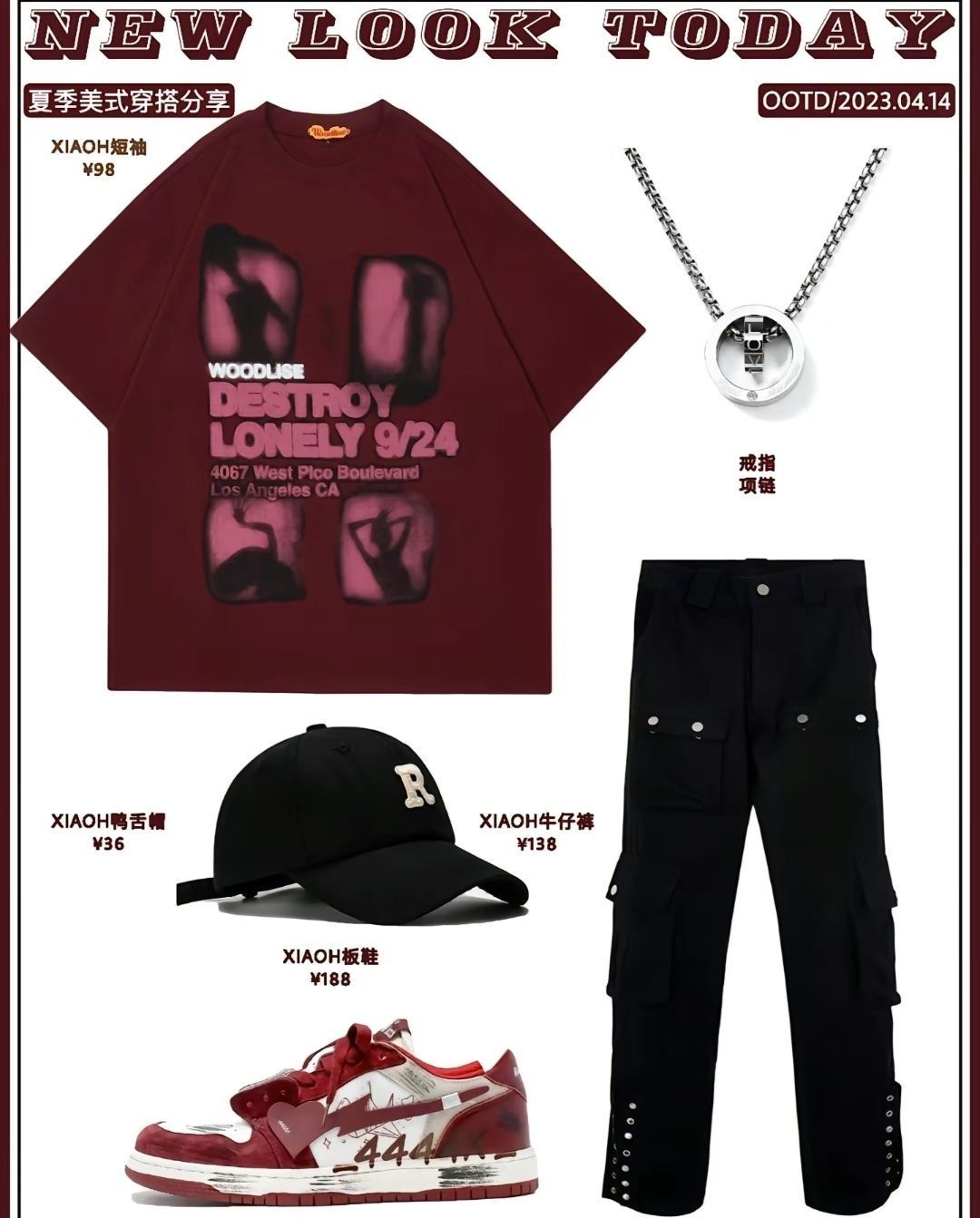 男生夏日chill穿搭 这套撞色街潮复古风格ootd可以说是我的首选了 - 潮流运动T恤的复古设计 上身街头感很足 而且还能给夏日出行带来一抹吸睛色彩 - 夏天闷热 选择黑色牛仔短裤搭配是明智的! 水洗做旧的风格会复古一点 加上破洞毛边增加穿搭的时髦前卫感 今天的ootd就搞定啦~ -