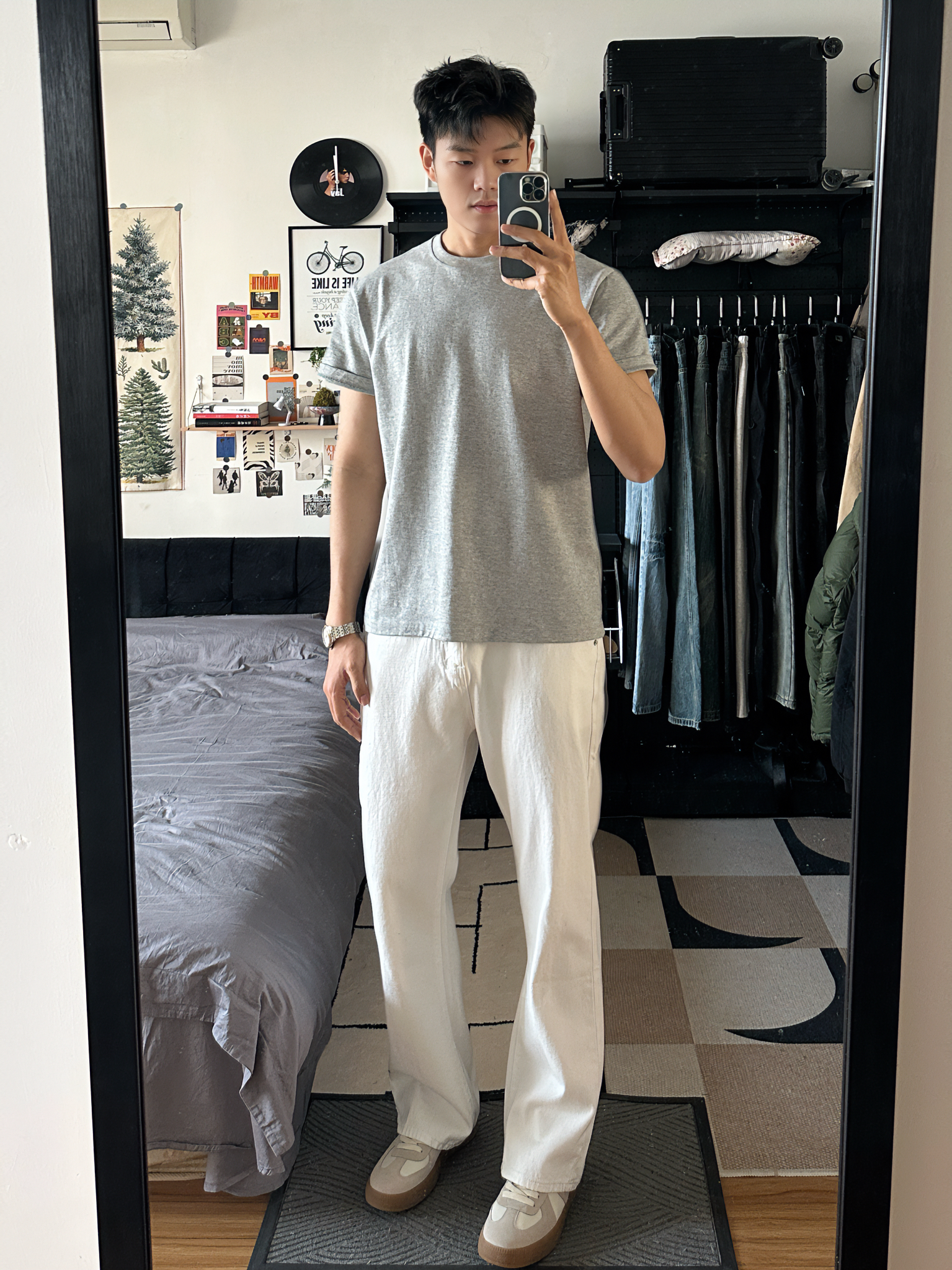 上衣👔:logo标语是发泡设计立体感很强,衣服前后都有竖线条让人看起来穿上这衣服就很板正,衣服面料很柔软,跟云朵一样,贴在肌肤上很舒服。我175 128穿的是x,很合适,根据推荐码数来拍就很准。 裤子👖:深色蓝牛,直筒版型,不挑腿型,垂感很强,穿上很舒服。 鞋子👟:阿迪达斯的板鞋,简约好看易搭配。