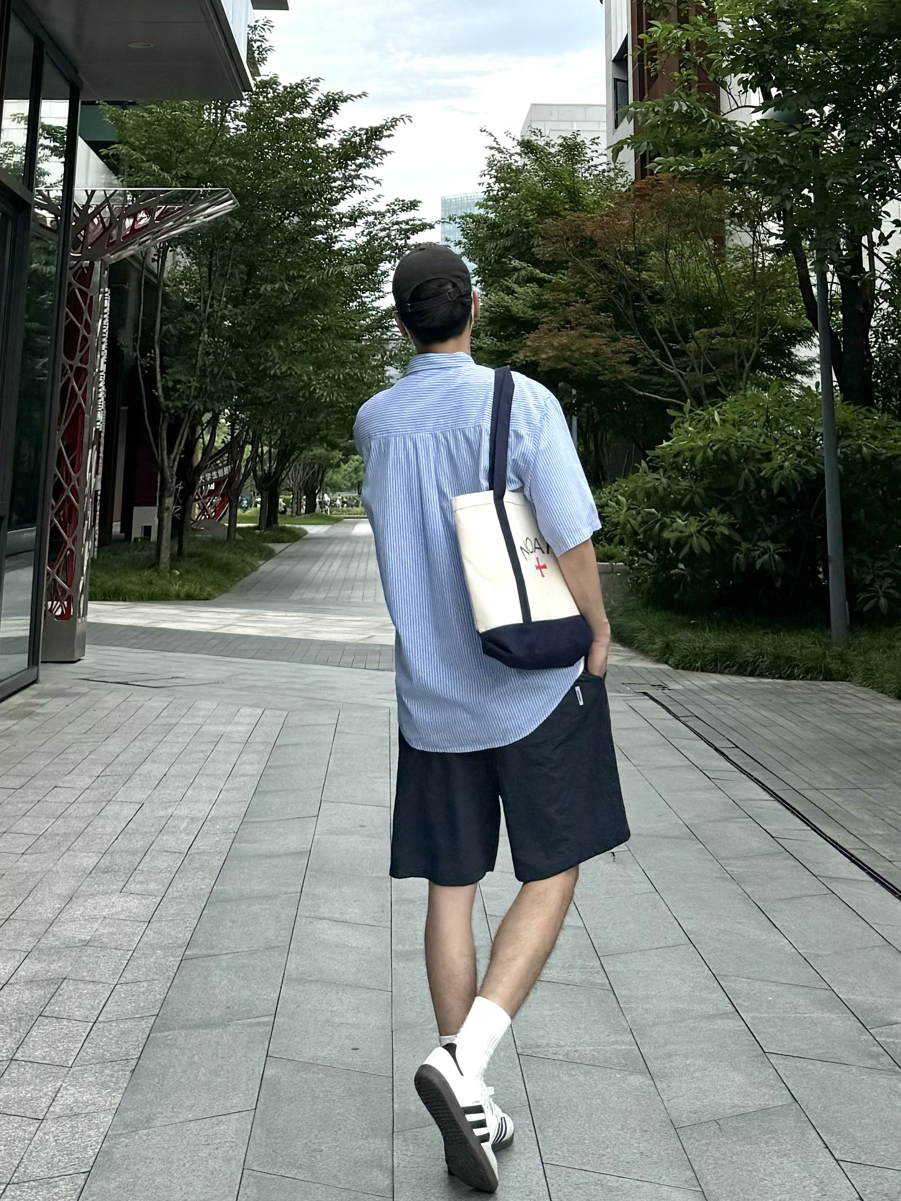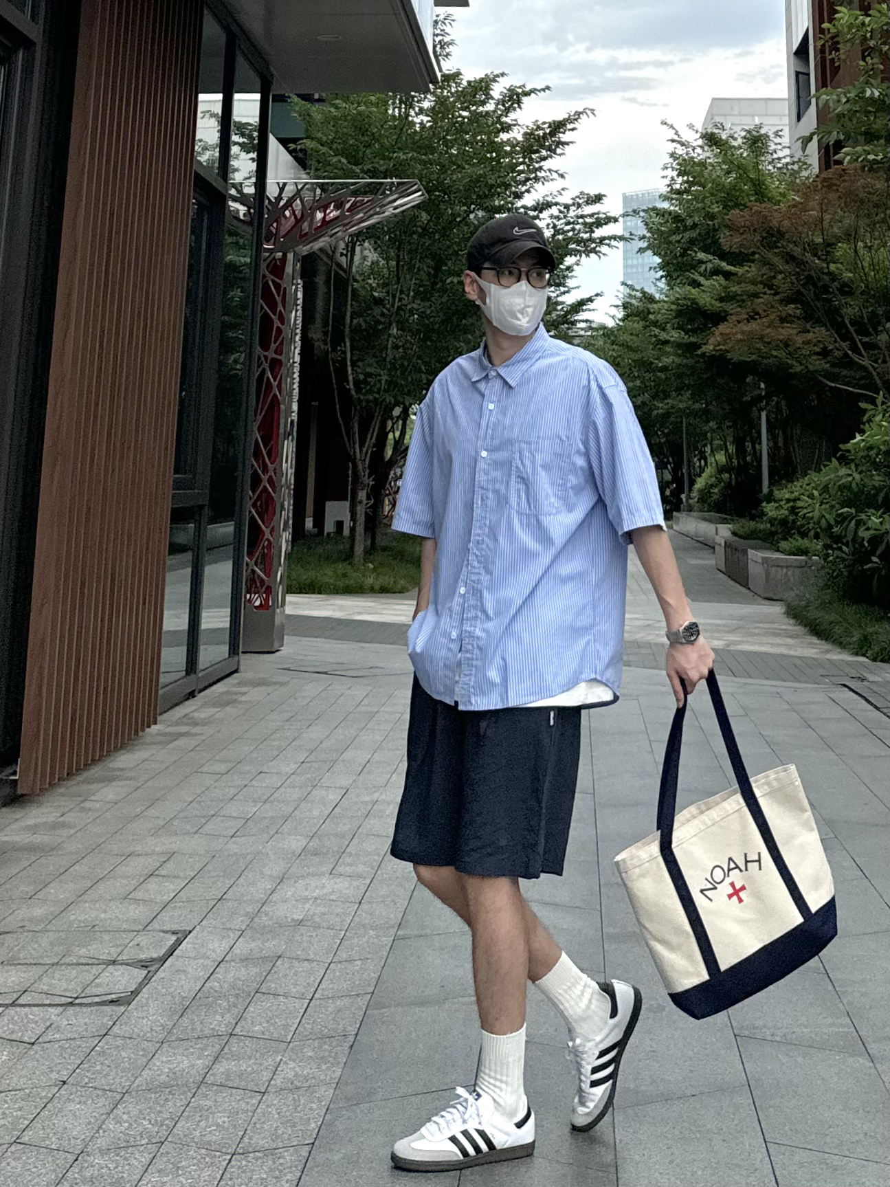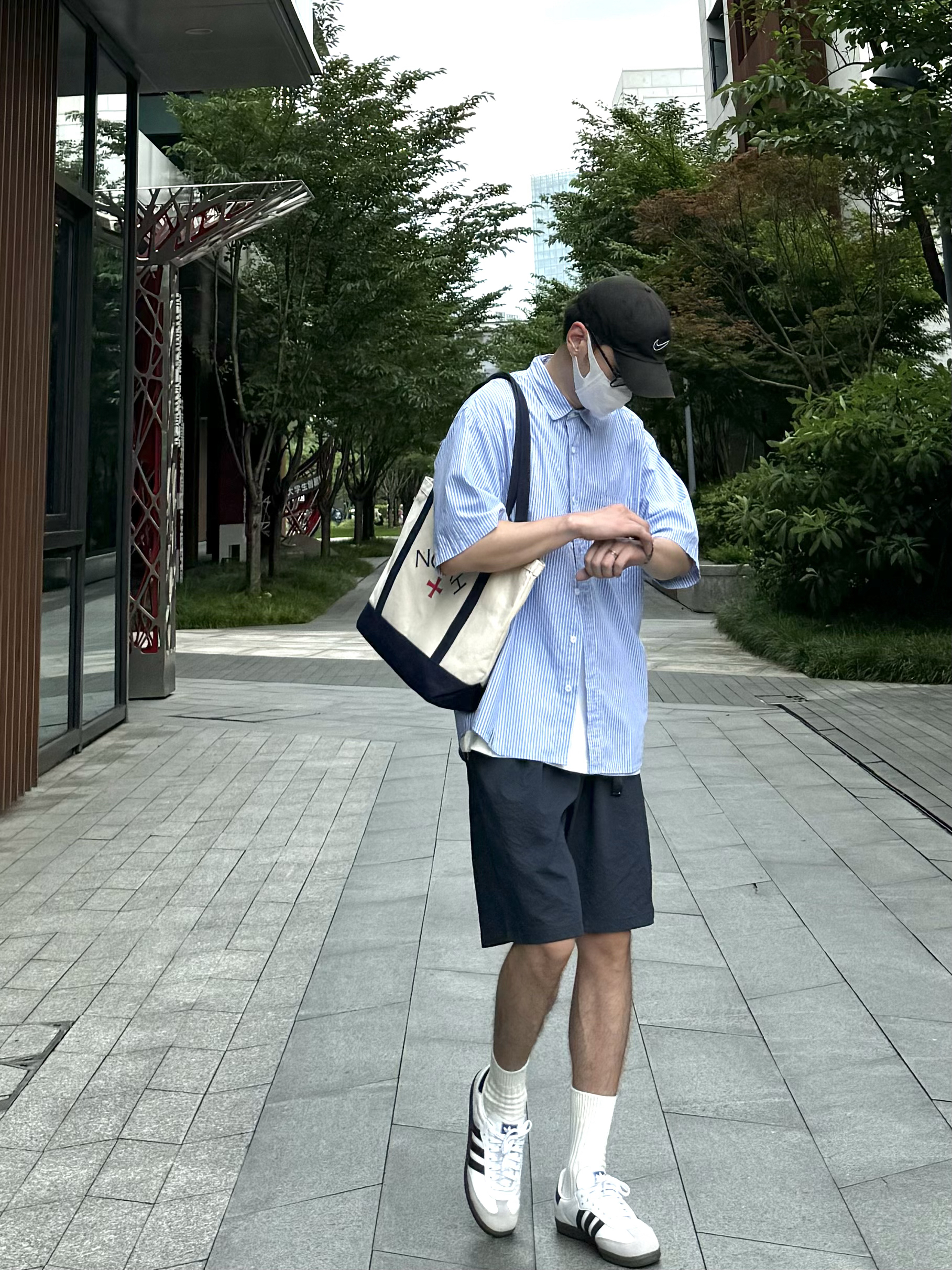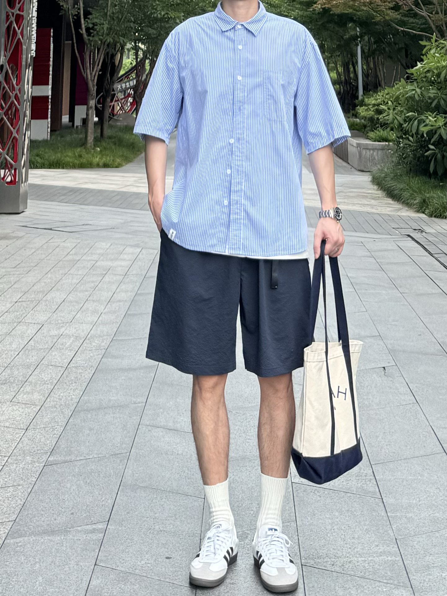 今天这套上衣穿了一件清新干净的蓝色宽松阔版条纹短袖衬衫 ⬇️ 裤子选择轻薄透气的藏青色直筒索罗娜机能工装短裤 ⬇️ 鞋子上脚经典百搭的黑白samba德训鞋 ⬇️ 最后背一个轻便的拼色帆布托特包 - 今日搭配 衣服裤子都来自:NICE LILI 鞋子:adidas samba