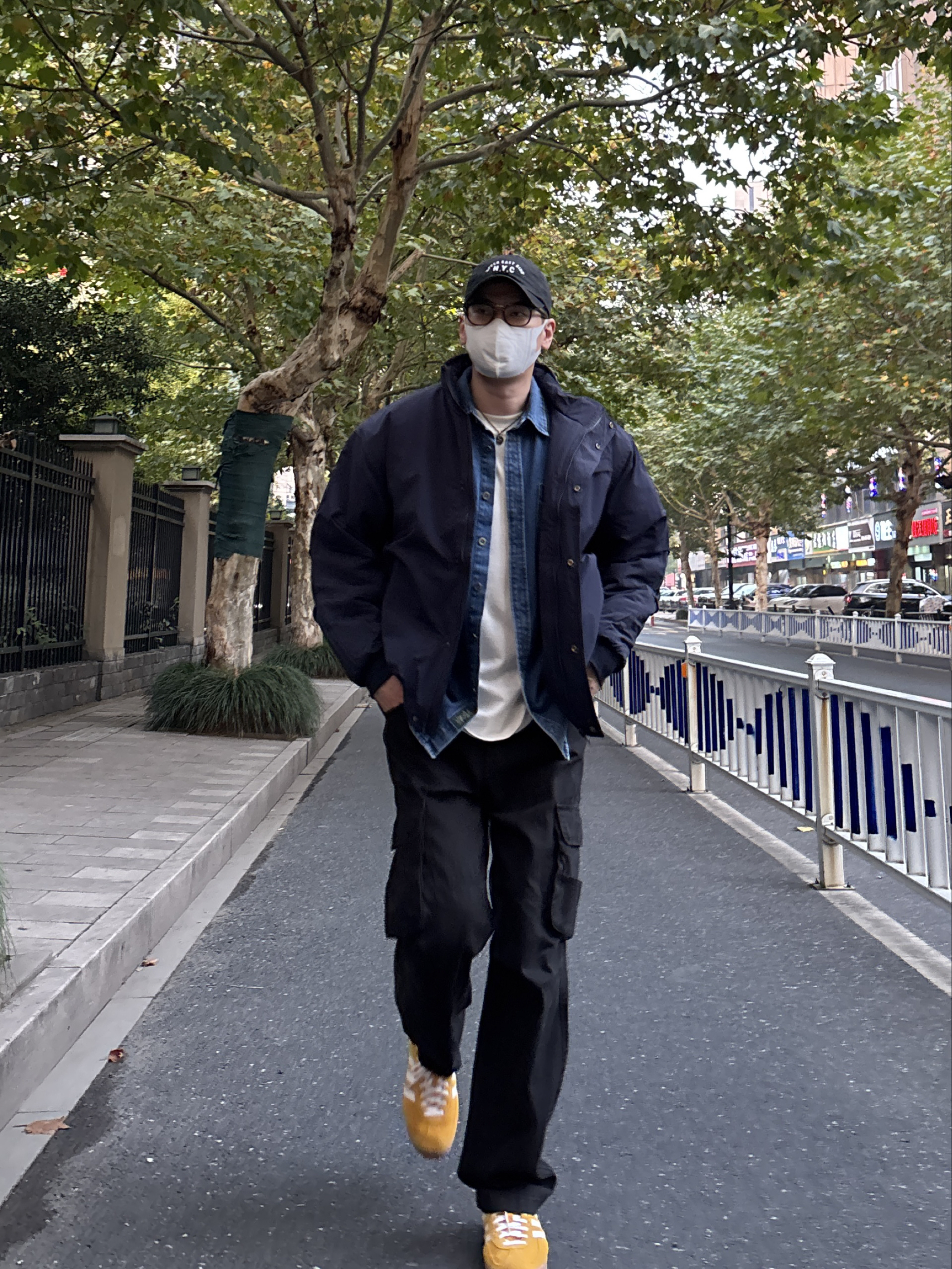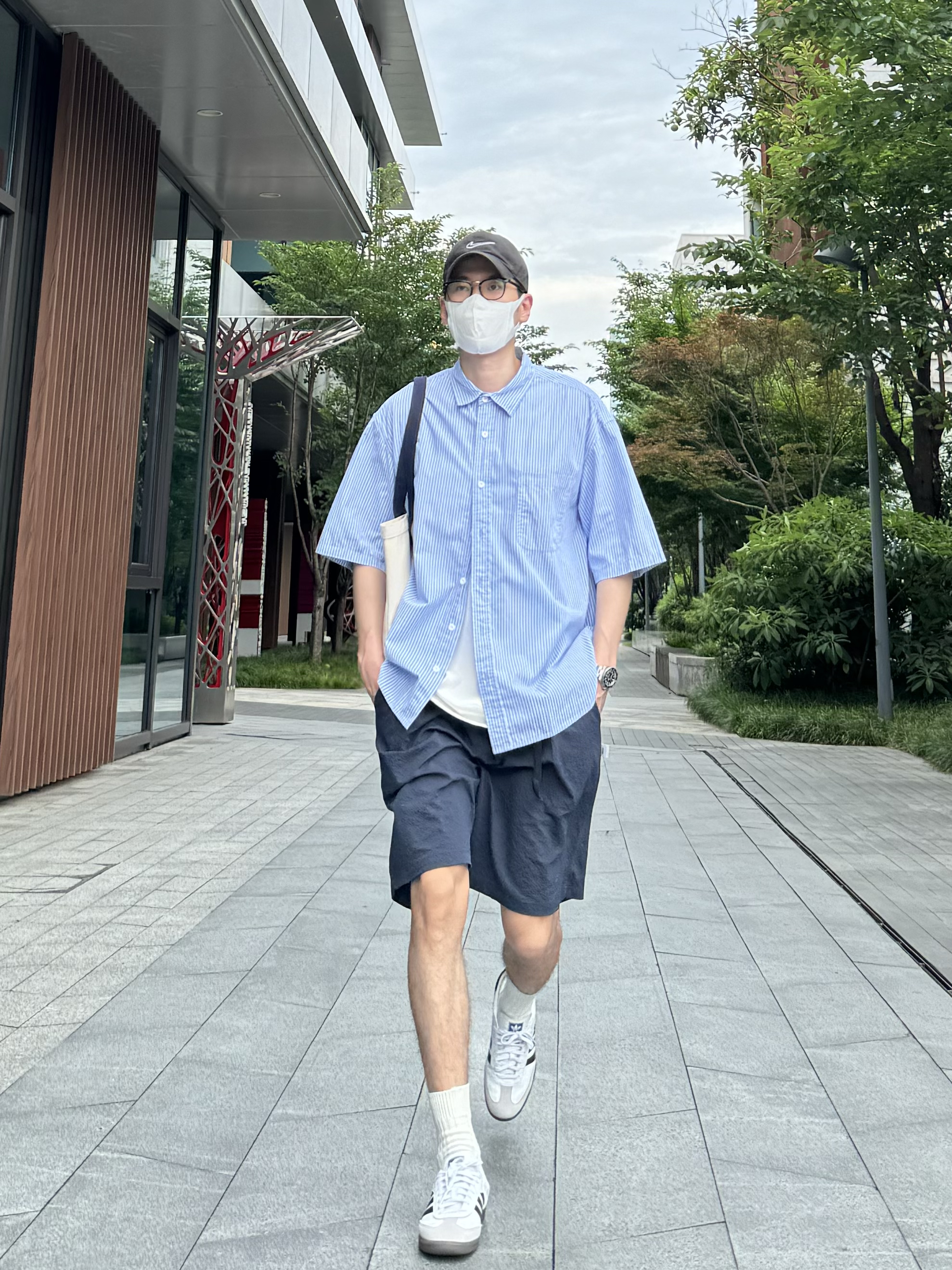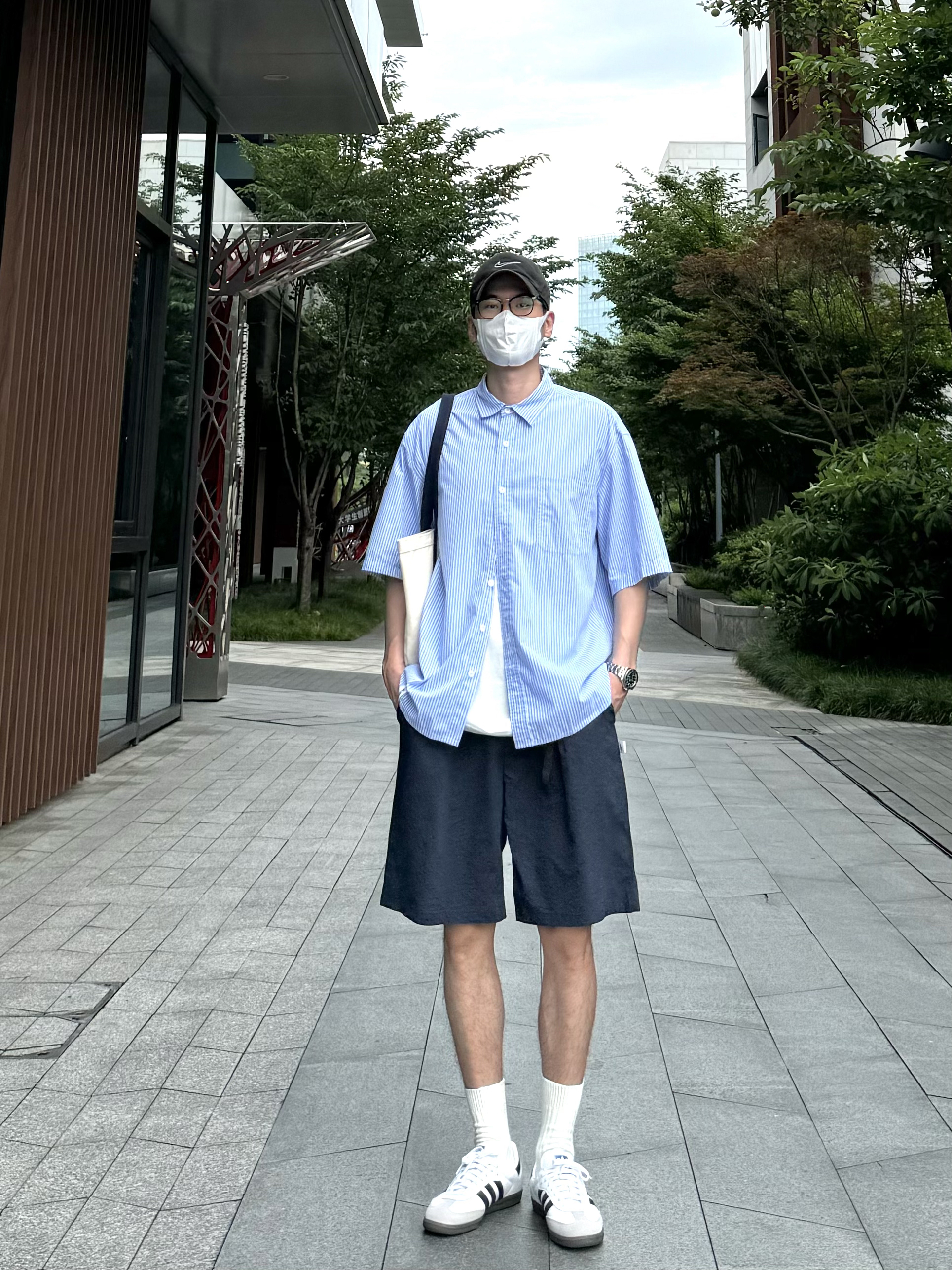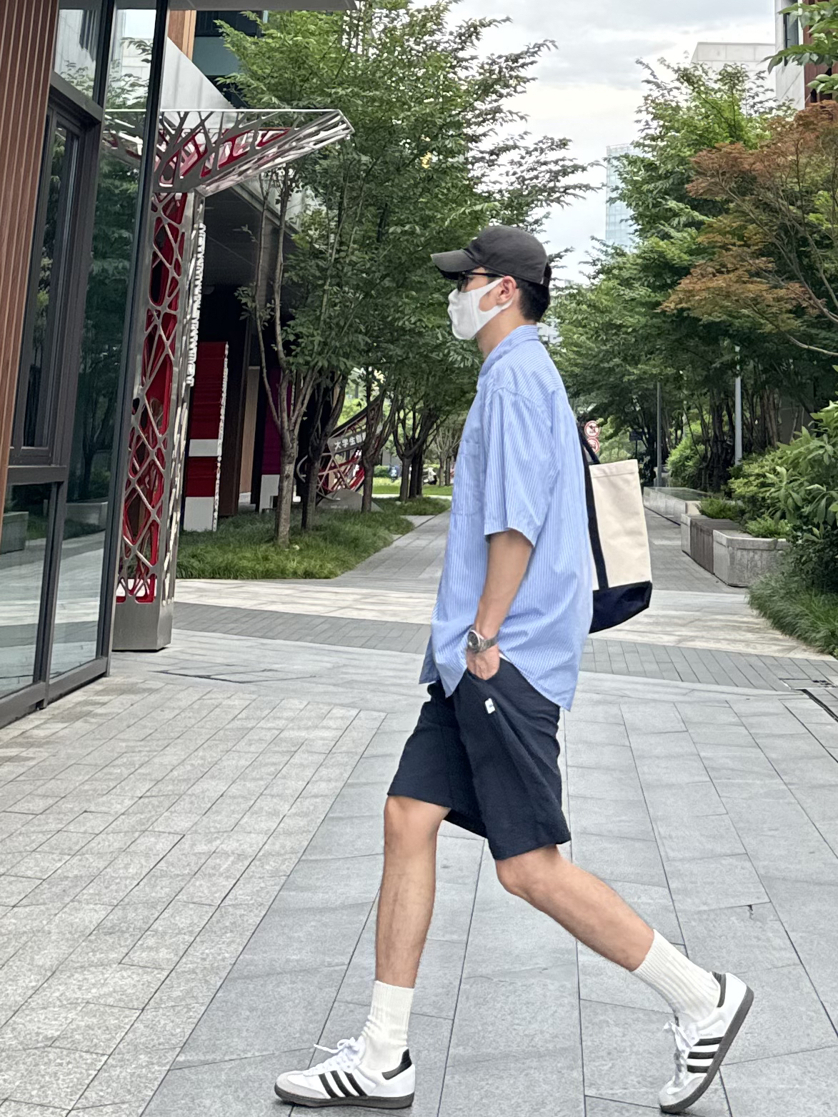 今天这套上衣穿了一件清新干净的蓝色宽松阔版条纹短袖衬衫 ⬇️ 裤子选择轻薄透气的藏青色直筒索罗娜机能工装短裤 ⬇️ 鞋子上脚经典百搭的黑白samba德训鞋 ⬇️ 最后背一个轻便的拼色帆布托特包 - 今日搭配 衣服裤子都来自:NICE LILI 鞋子:adidas samba