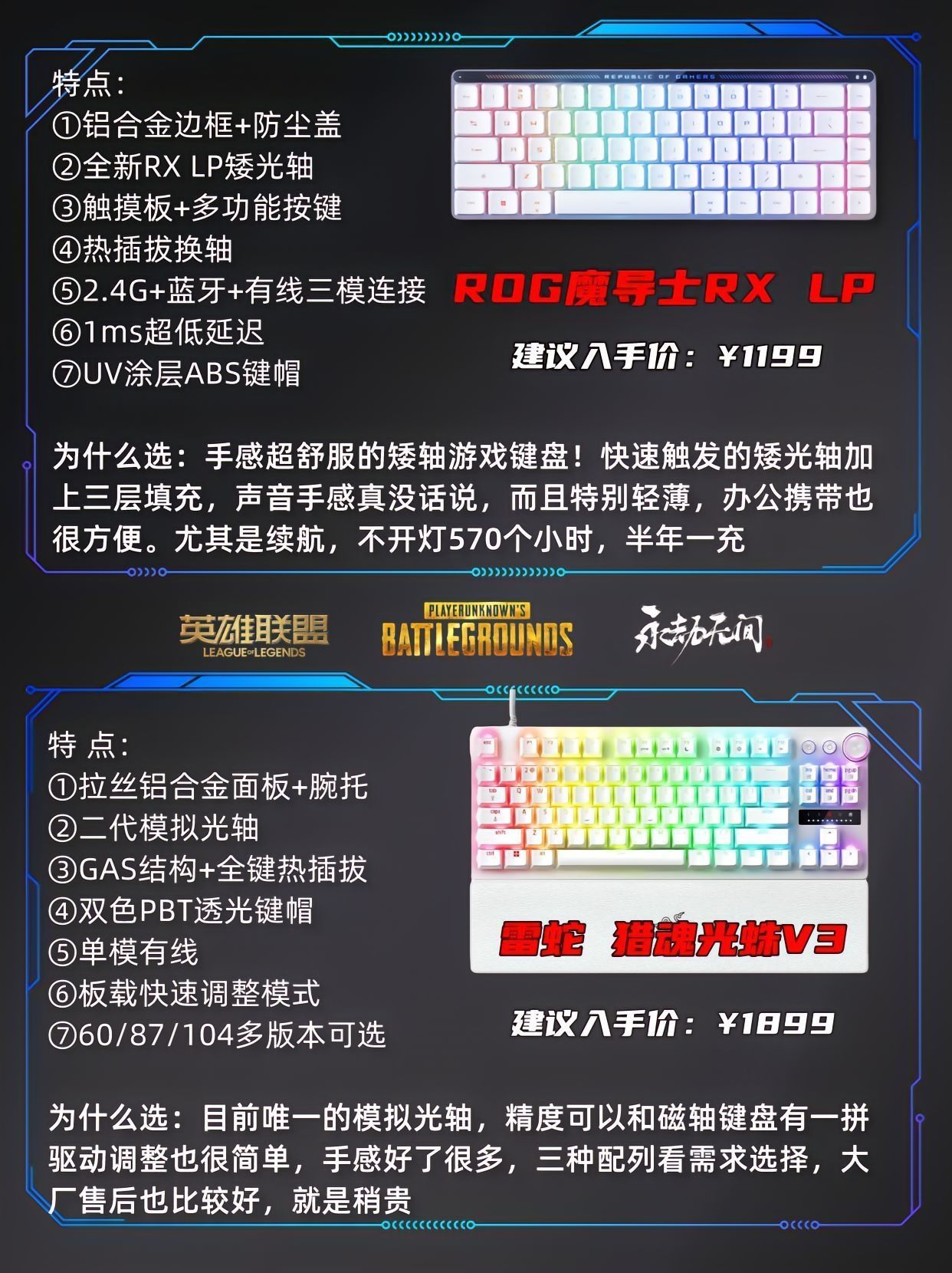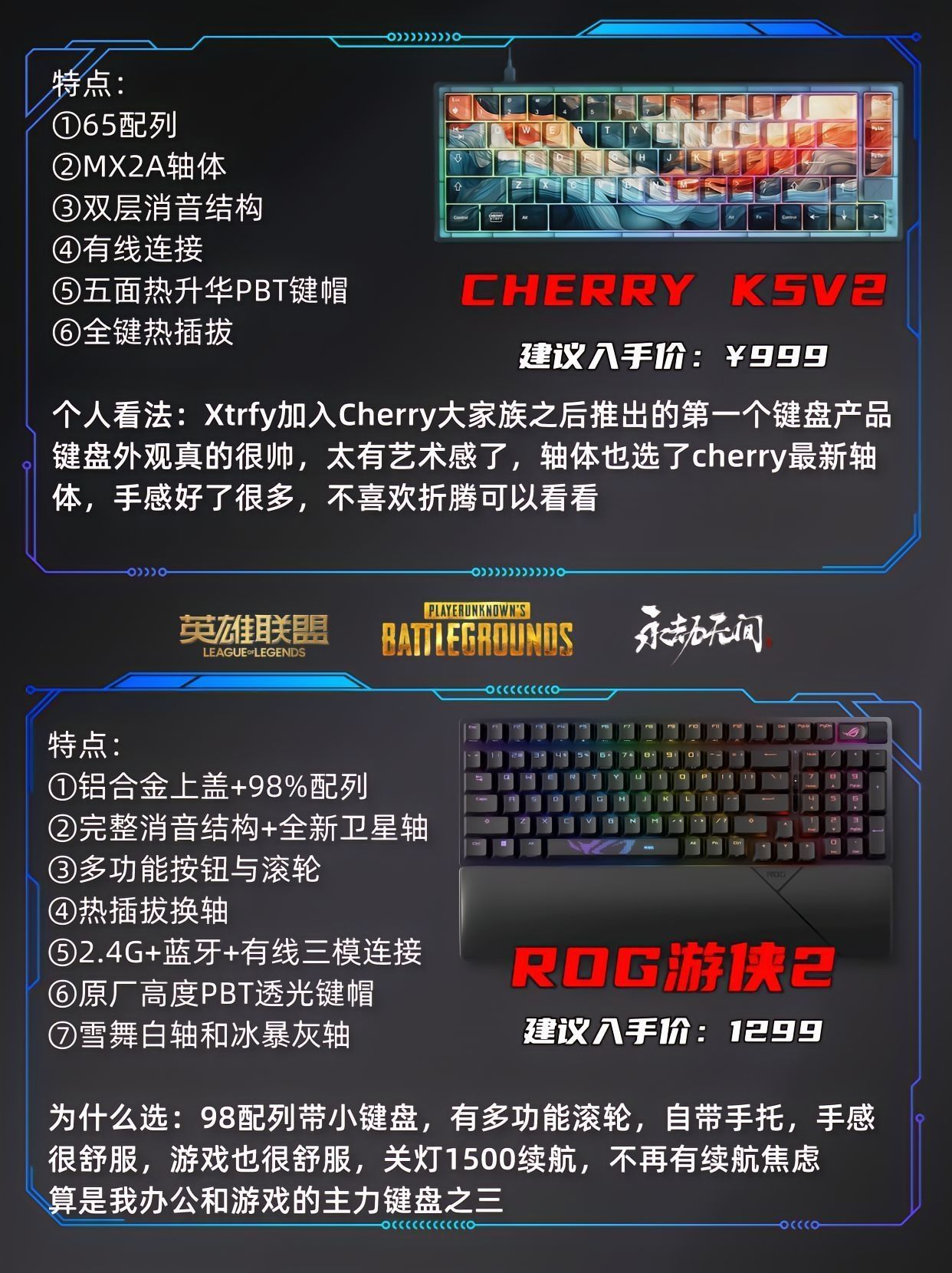本篇笔记关联了ROG/玩家国度 游侠2 NX 三模 机械键盘 98键 客制化 背光 热插拔 全键 带掌托 黑色PBT、ROG/玩家国度 魔导士RX LP 三模 机械键盘 68键 支持MacOS 高性能 白色、ROG/玩家国度 夜魔+龙鳞ACE 无线键鼠套装 游戏电竞 客制化 热插拔 黑色等商品,为用户提供真实的使用体验和购买参考。