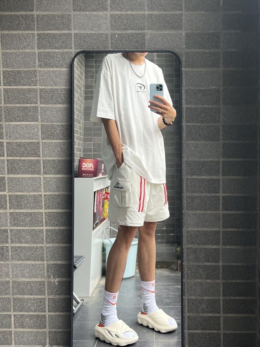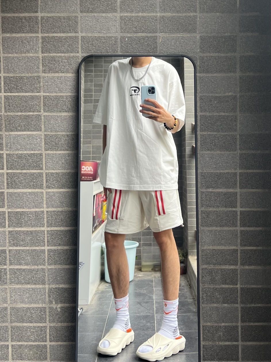 今天这套服装是休闲、舒适和运动风。白色T恤配白色短裤,给人清新简约的感觉。T恤上印有品牌标志,具有时尚元素。短裤上的红色条纹是一大亮点,起到视觉上的点缀作用。袜子与运动鞋的搭配很显运动休闲。这套服装适合在夏天或温暖的季节穿着,可用于日常休闲活动或运动时穿。