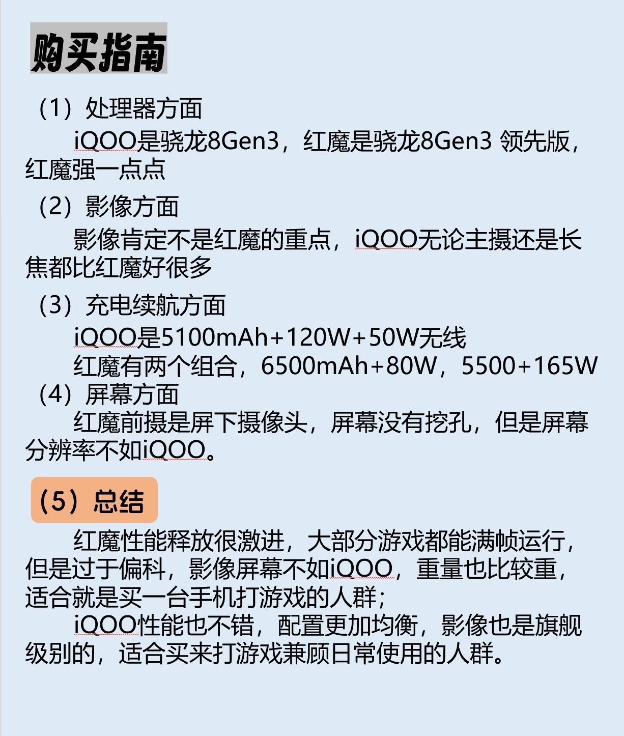 购买指南 (1)处理器方面 iQOO是骁龙8Gen3,红魔是骁龙8Gen3领先版,红魔强一点点 (2)影像方面 影像肯定不是红魔的重点,iQOO无论主摄还是长焦都比红魔好很多 (3)充电续航方面 iQ00是5100mAh+120W+50W无线 红魔有两个组合,6500mAh+80W,5500+165W (4)屏幕方面 红魔前摄是屏下摄像头,屏幕没有挖孔,但是屏幕分辨率不如iQOO (5)总结 红魔...