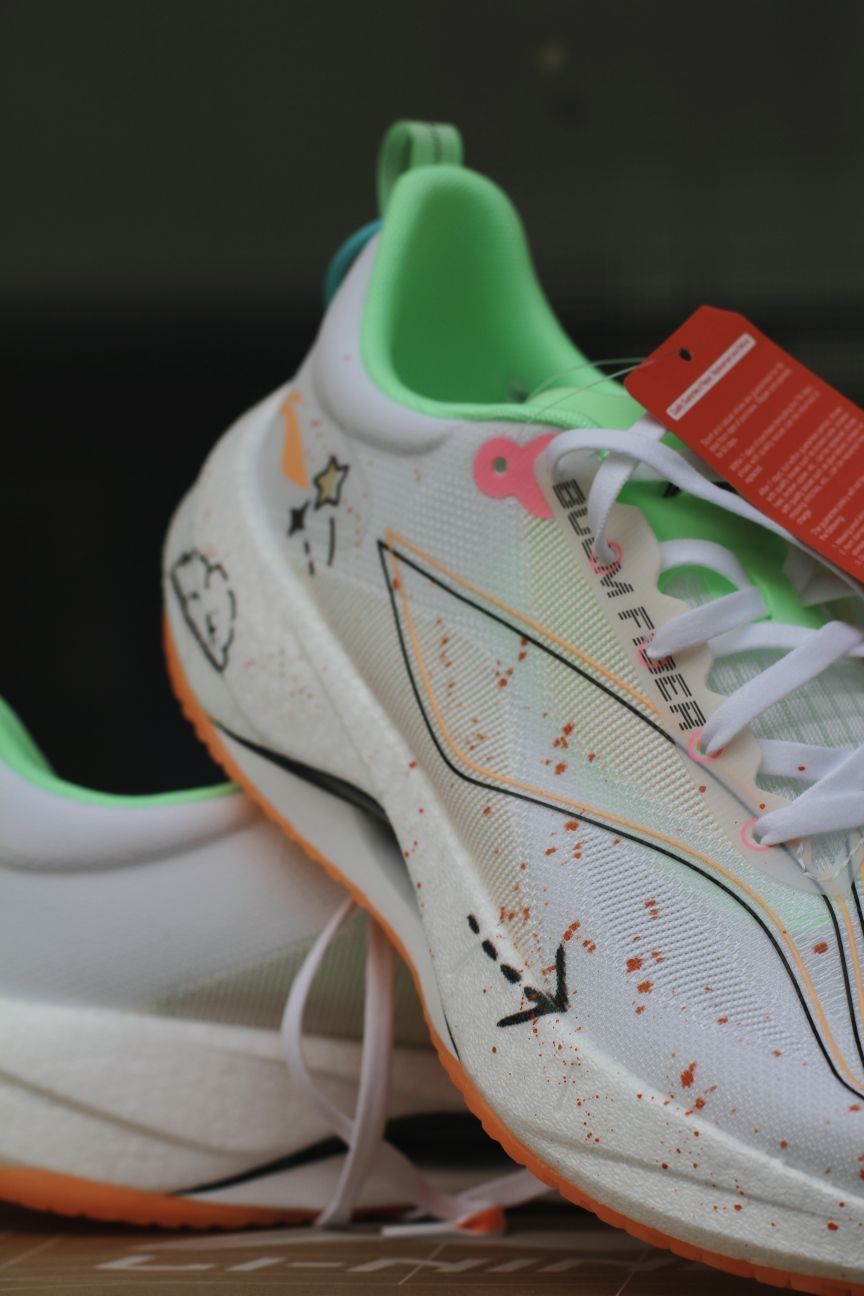 国货之光真的是名不虚传 整个鞋的鞋面做了涂鸦设计 个性感十足 鞋底采用镂空底设计 缓震回弹效果绝佳 上脚便有了健步如飞的感觉 超轻系列且耐磨透气也是很不错的 真的很难不爱