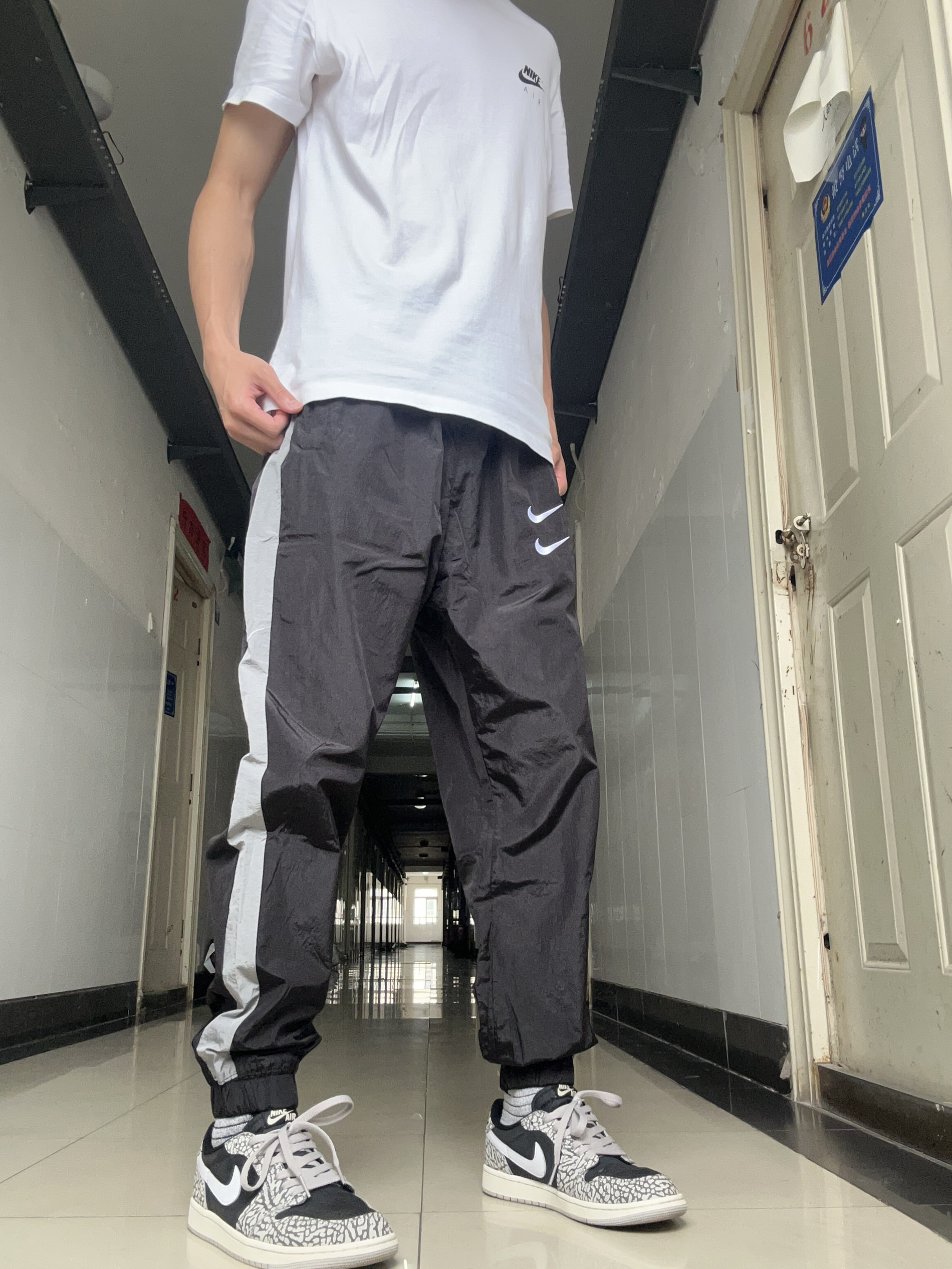 好物分享啦 ! 👕:Nike美式复古印花运动短袖 👖:今天分享的是这条Nike的双钩束脚休闲运动裤,梭织的面料非常软软舒适,裤子前侧的Nike双钩logo也很好看,裤子里面是一层薄薄的网布内衬,整条裤子质感满满。本人身高180体重125,上身的这条是XL码 👟:AJllow 爆裂纹