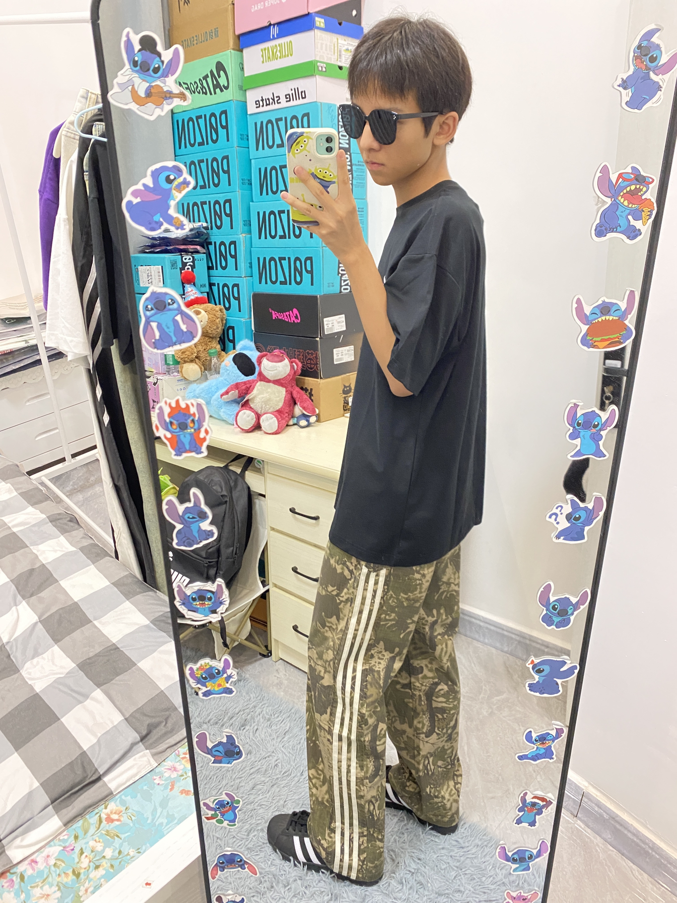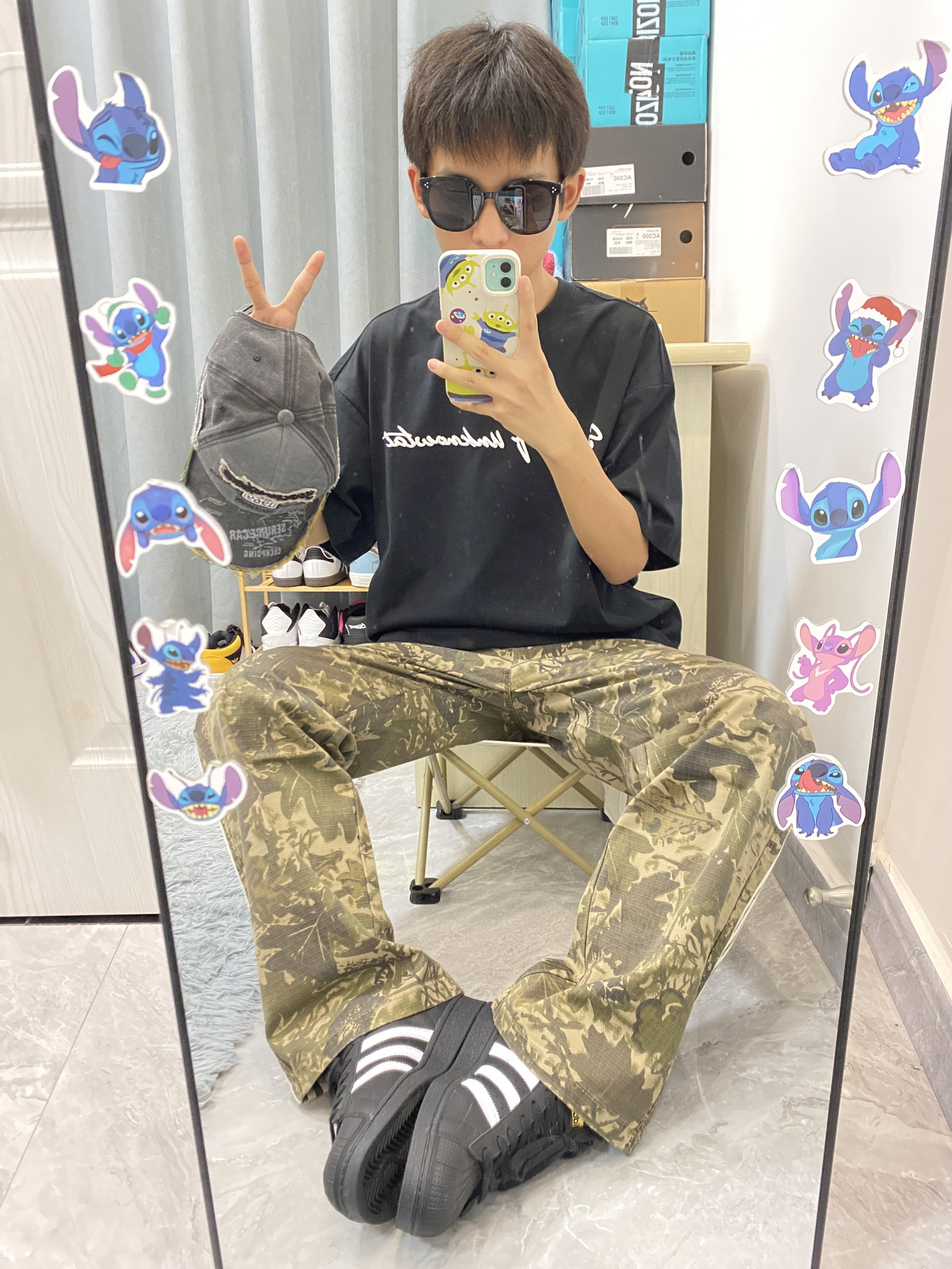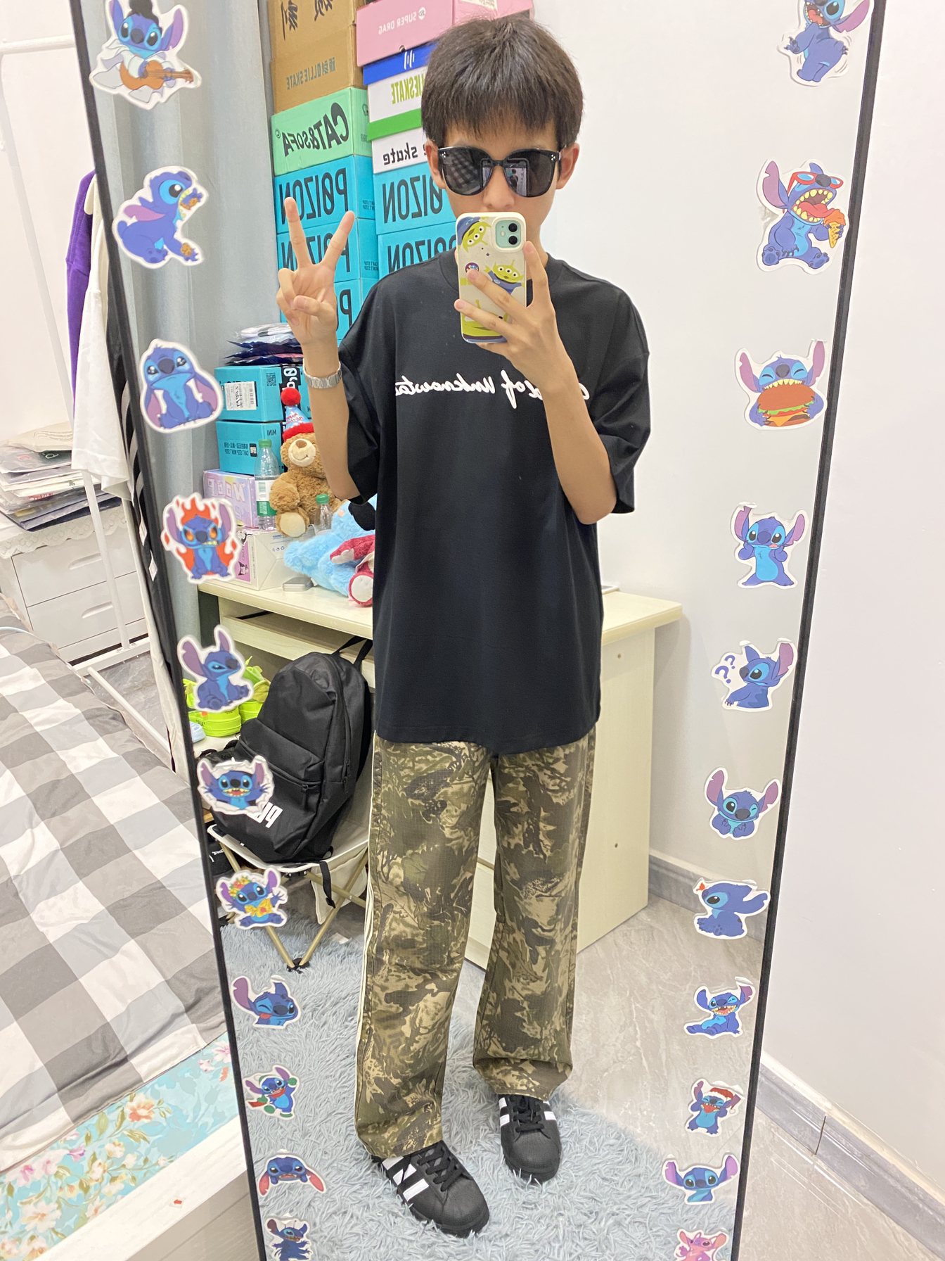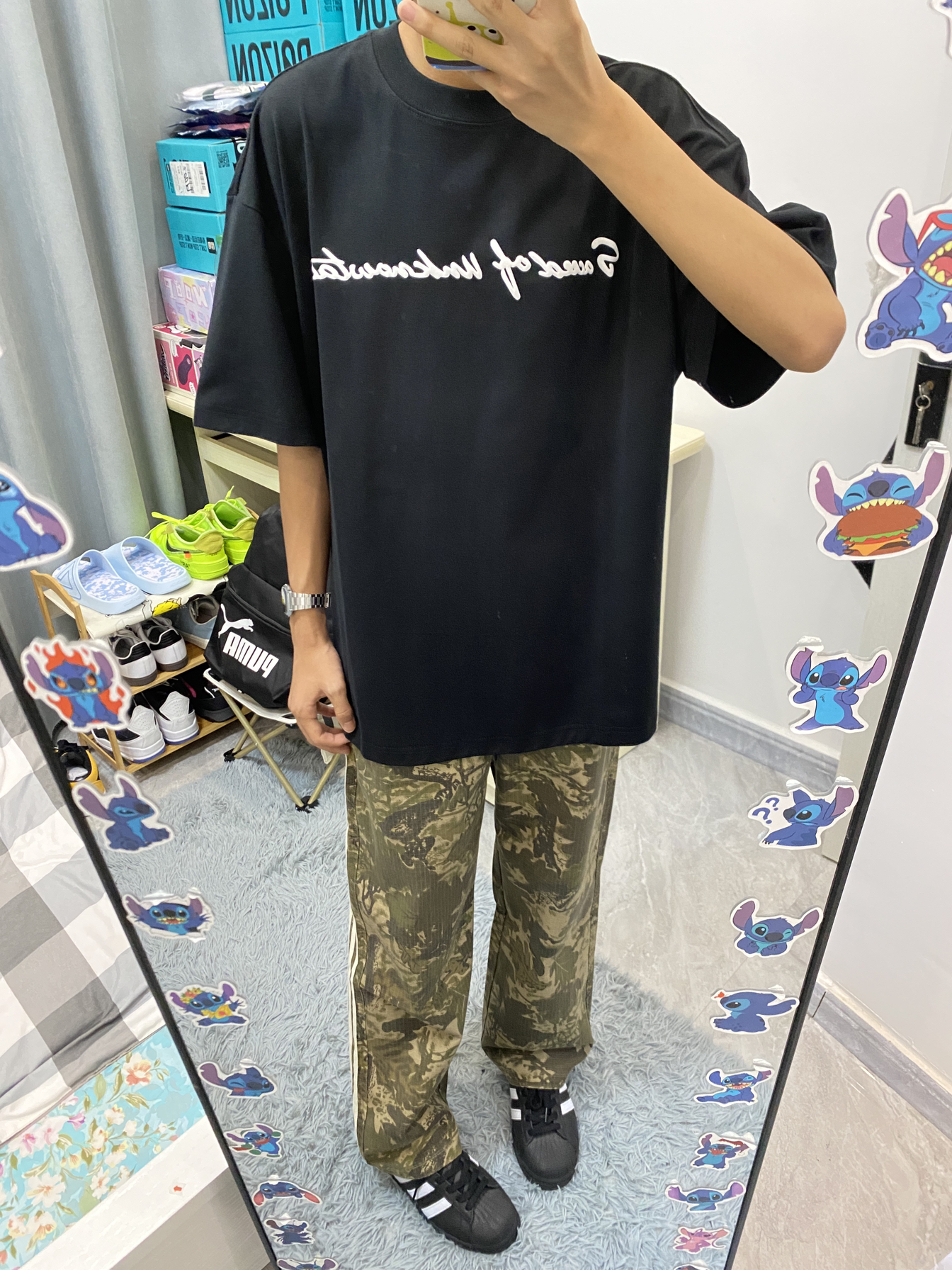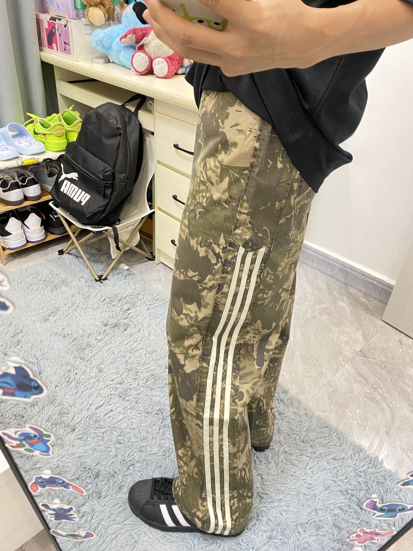 今日份ootd分享/ 这款短袖穿起来版型挺好看的 前面是白色字母发泡印花的设计🤩 裤子是绿色树叶🍂迷彩的配色 侧面的三杠条纹很经典 整体是一个复古休闲风的感觉!