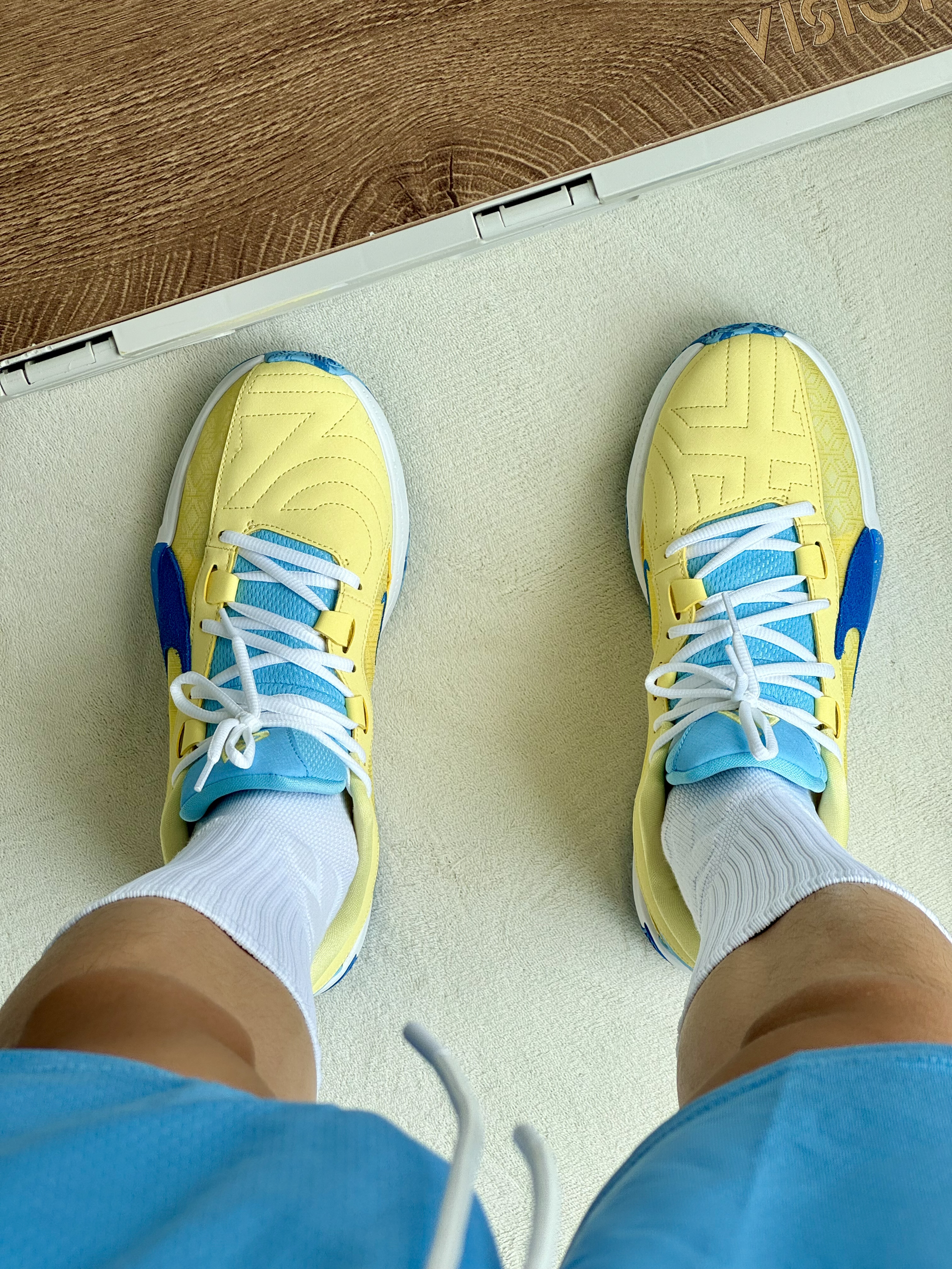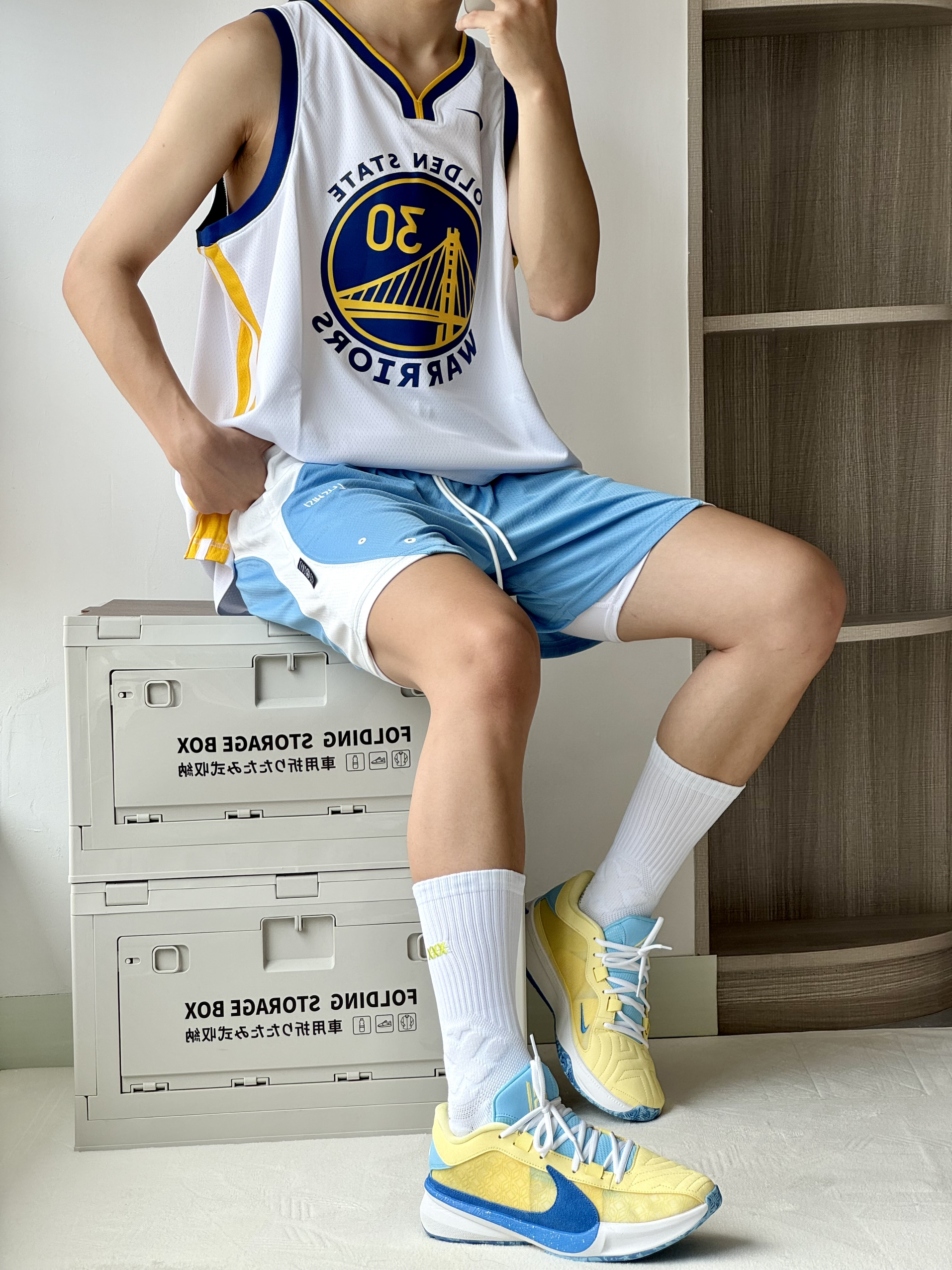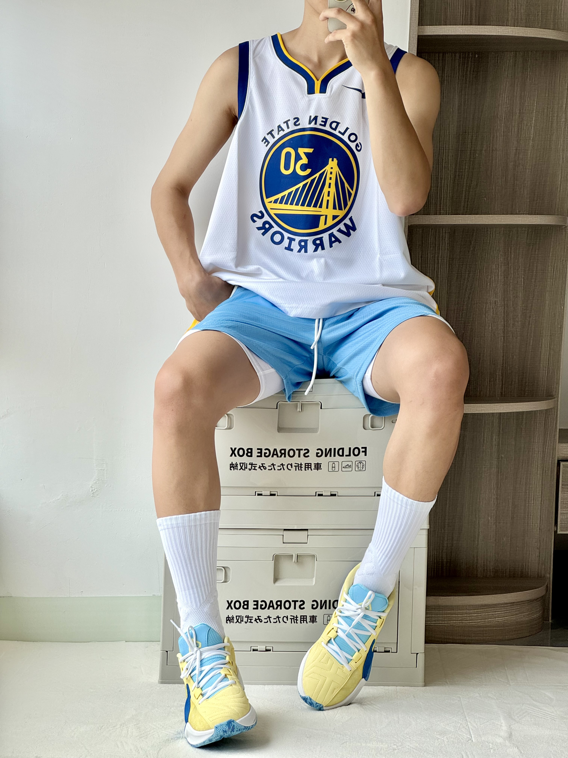 oi夏日和朋友一起打球当然要穿得帅帅气气的啦!黄蓝美式穿搭不能错过 🎽 一件库里球衣日常休闲和打球我都很喜欢穿它白黄蓝很不错搭配大大的印花上身颜值特别帅气 🩳 一条白蓝色短裤好看又好搭四分的设计和拼接设计显高显腿长 👟 字母哥5非常清新吸睛的黄蓝配色非常适合夏天吧设计简约上脚好穿又好看很难不爱喽