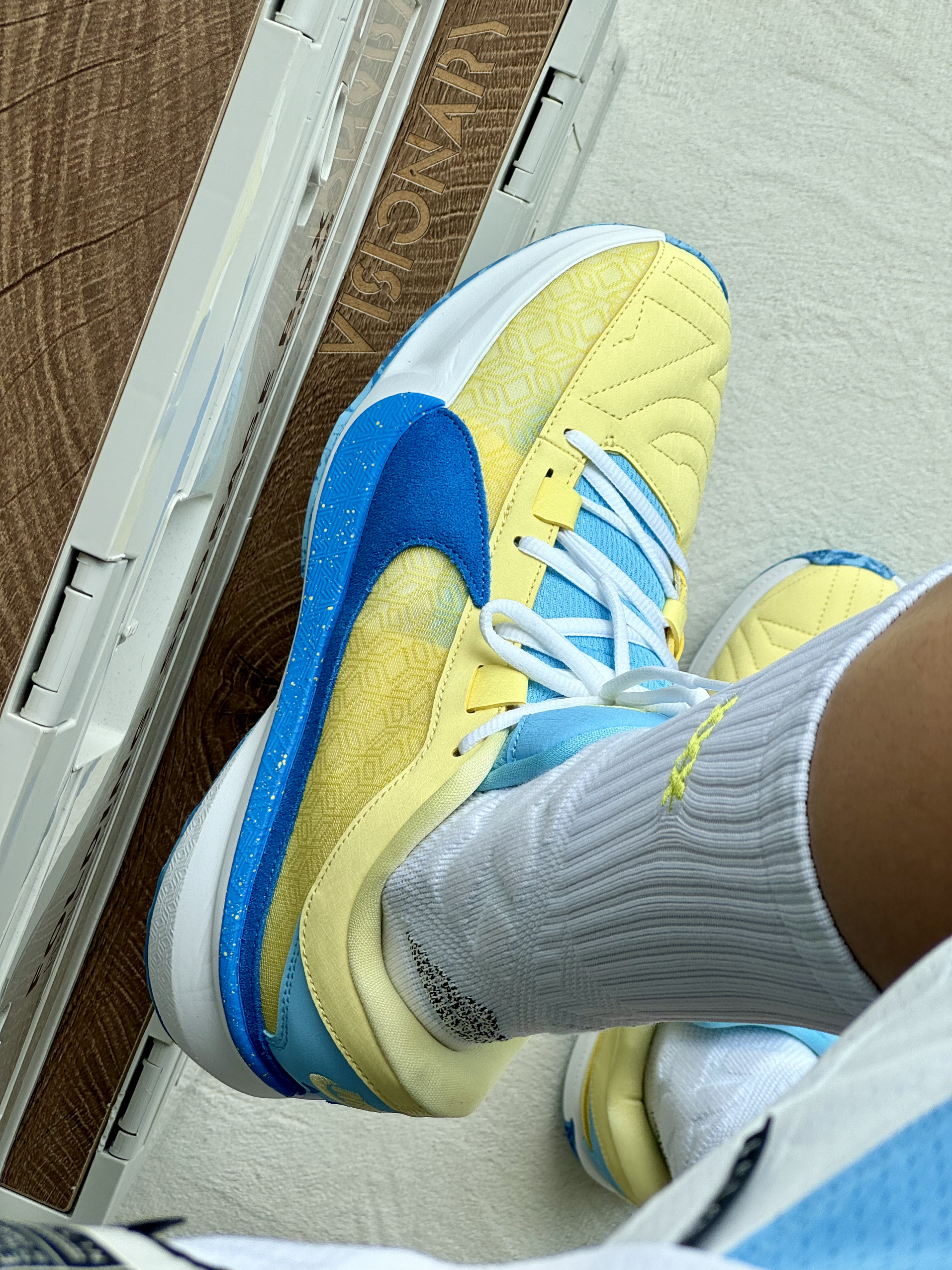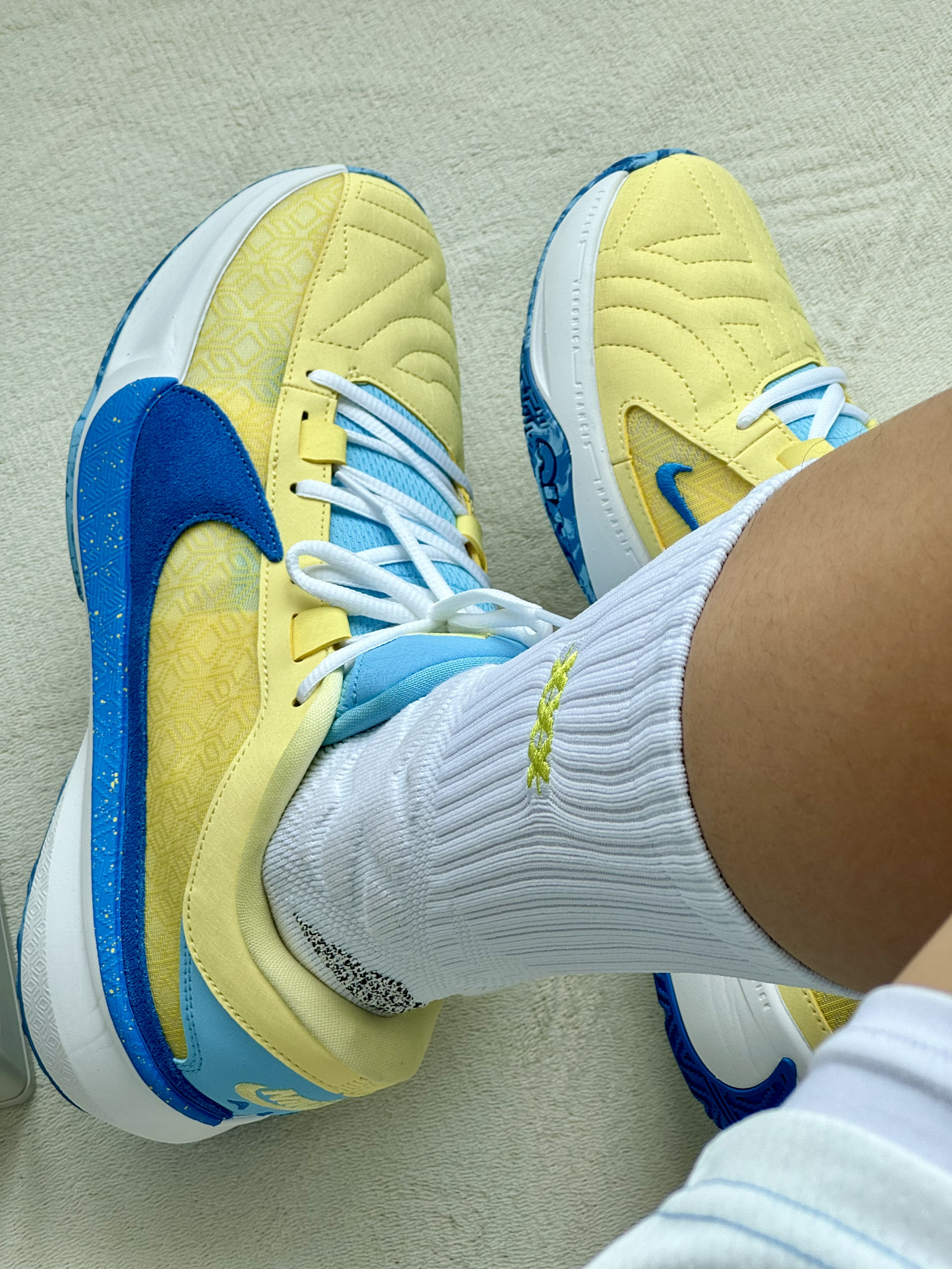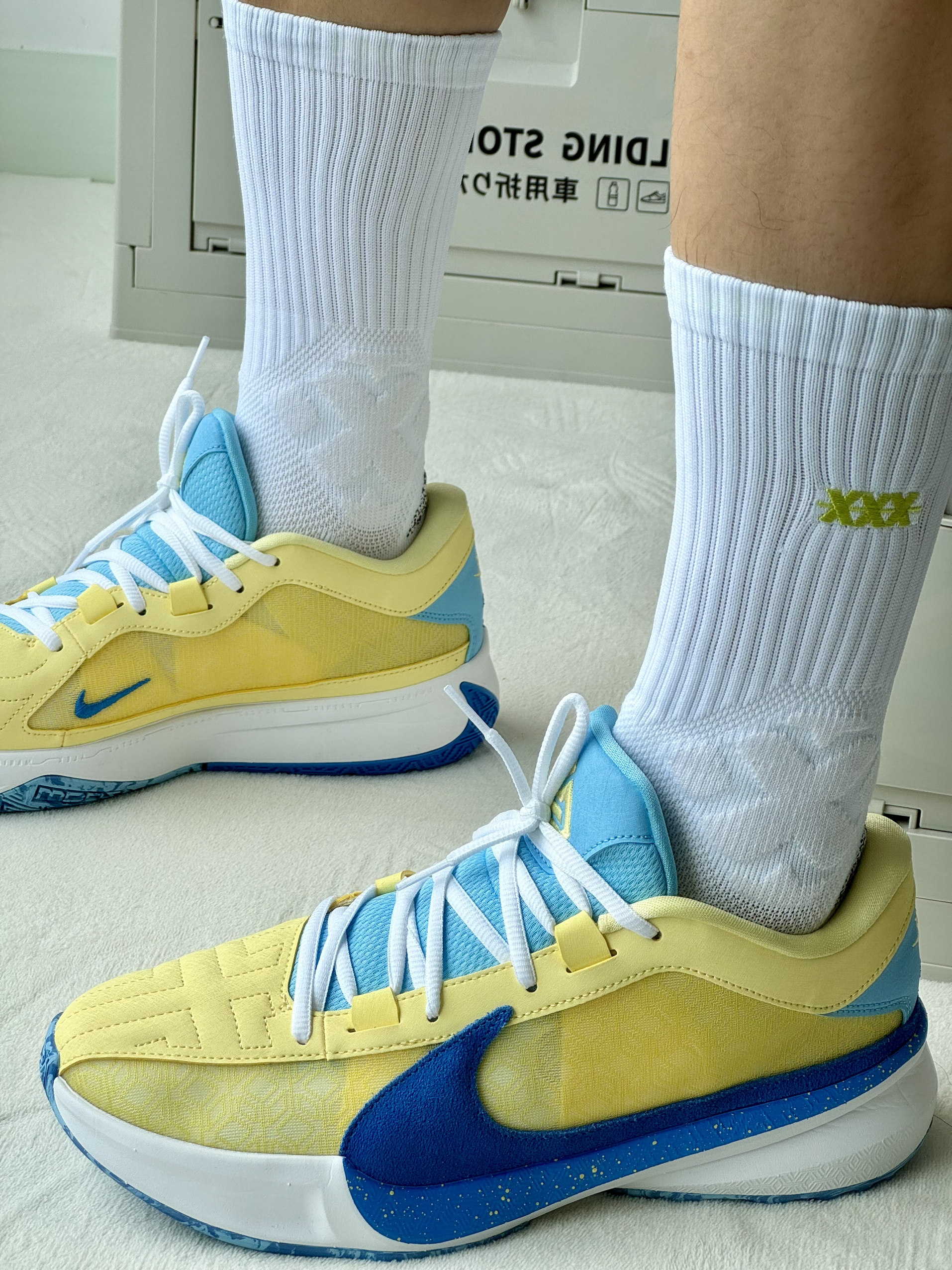 oi夏日和朋友一起打球当然要穿得帅帅气气的啦!黄蓝美式穿搭不能错过 🎽 一件库里球衣日常休闲和打球我都很喜欢穿它白黄蓝很不错搭配大大的印花上身颜值特别帅气 🩳 一条白蓝色短裤好看又好搭四分的设计和拼接设计显高显腿长 👟 字母哥5非常清新吸睛的黄蓝配色非常适合夏天吧设计简约上脚好穿又好看很难不爱喽