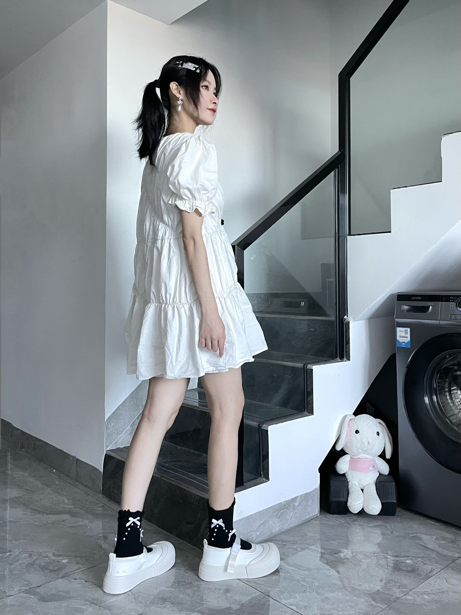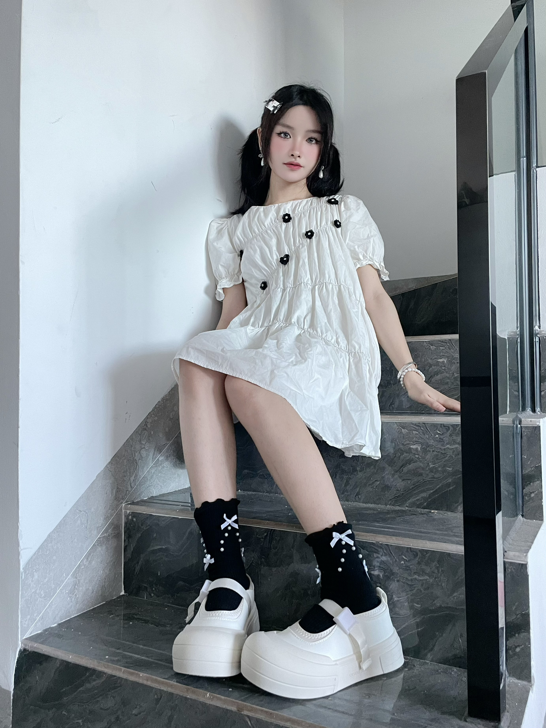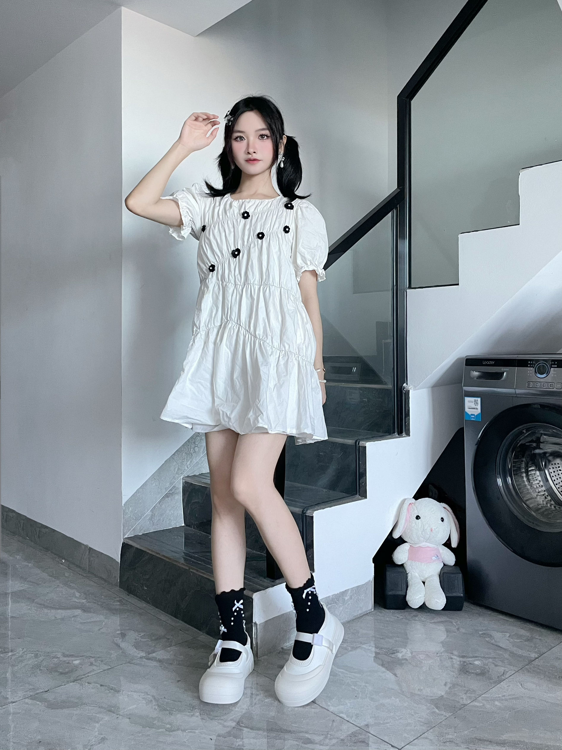 校园甜美风穿搭🎀 女孩们👧一定不能错过! 上身秒变学长学弟们的“白月光”~ 干干净净的娃娃裙👗 衣服上有小黑花装饰 整体版型是娃娃裙 可爱又俏皮🪆 搭个玛丽珍鞋🌟 和蝴蝶结珍珠元素的袜子🧦 甜味儿溢出屏幕啦!