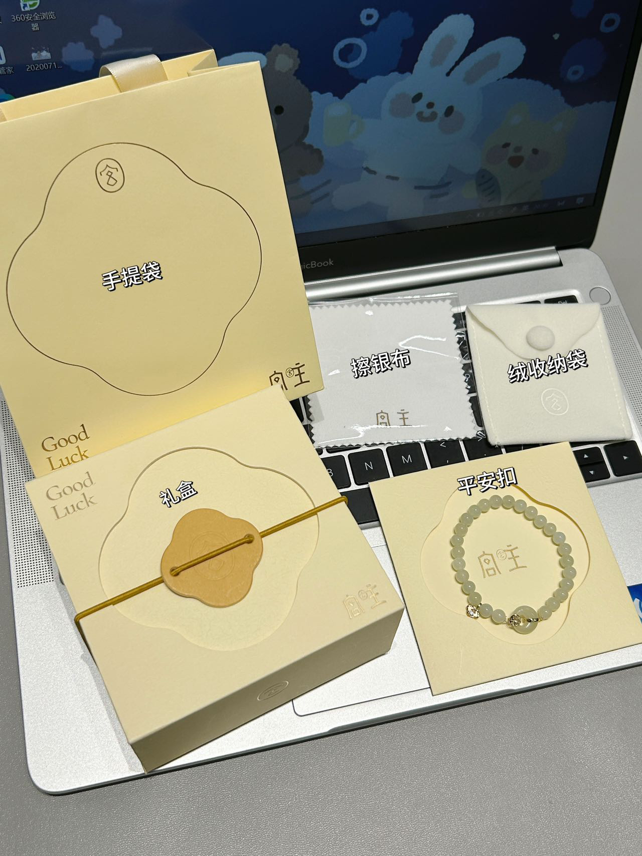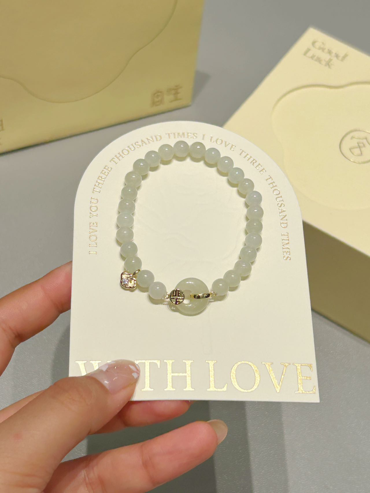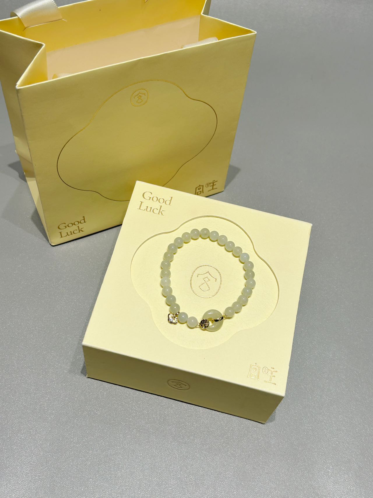 是介个范琦和宫主联名的新中式和田玉手串 一直不懂为什么谈恋爱要戴范琦 直到男朋友送了我才明白 原来是在对我表白呀! 玉石平安扣和小祥云福字搭配在一起 寓意着平安顺遂 福气满满 温润的玉石颇有新中式的美感 戴在手腕上一整个高级贵气~ 这样一个礼盒包装都有的仪式感女孩子尊嘟会心动的~
