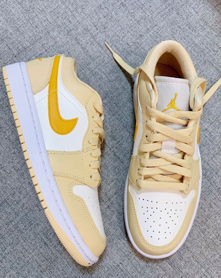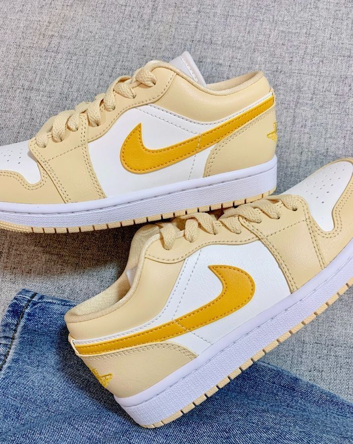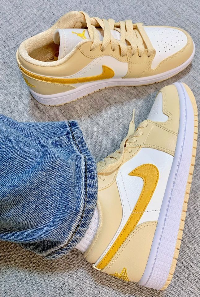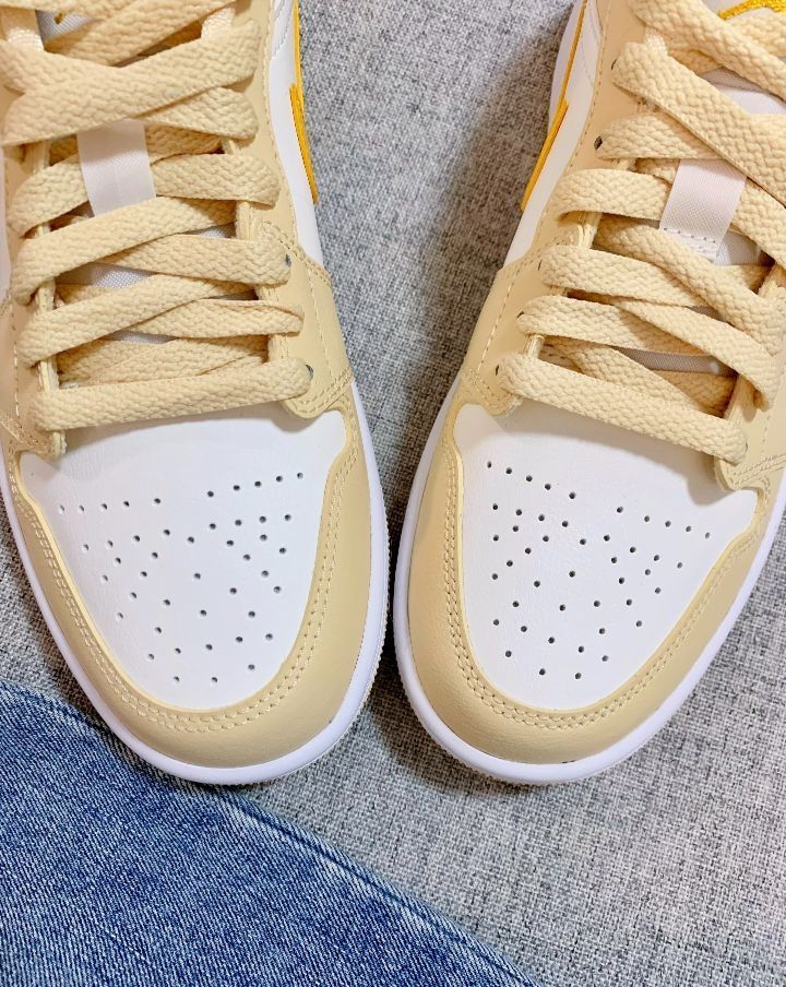 夏天穿点亮色更吸睛呀~谁都不许动我的奶酪AJ! 实物是比较奶油的黄色, 看上去会比较温柔有质感一-些~ 上脚也很修饰脚型,感觉很显白~