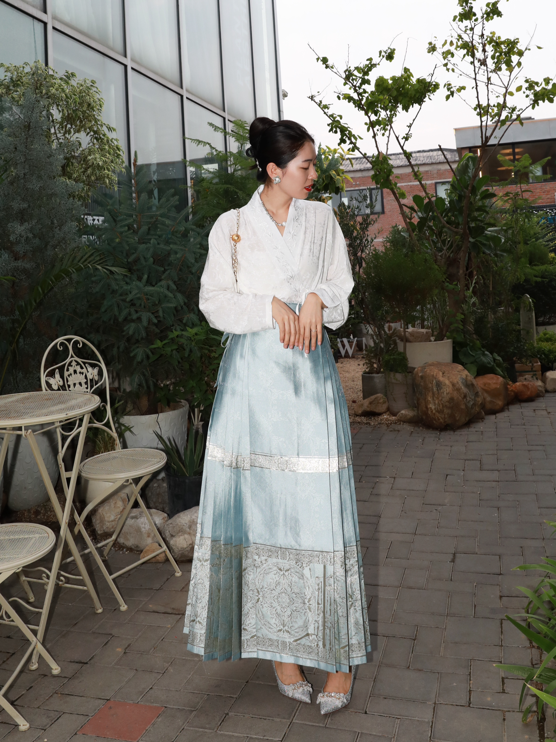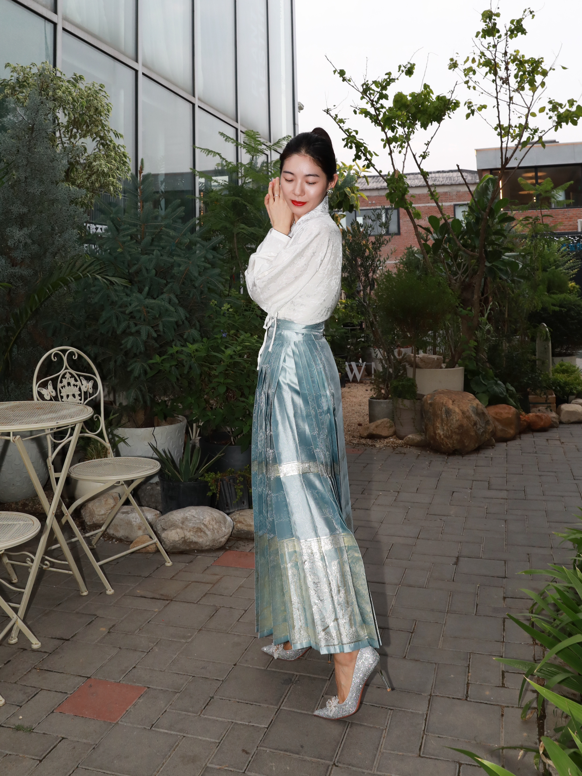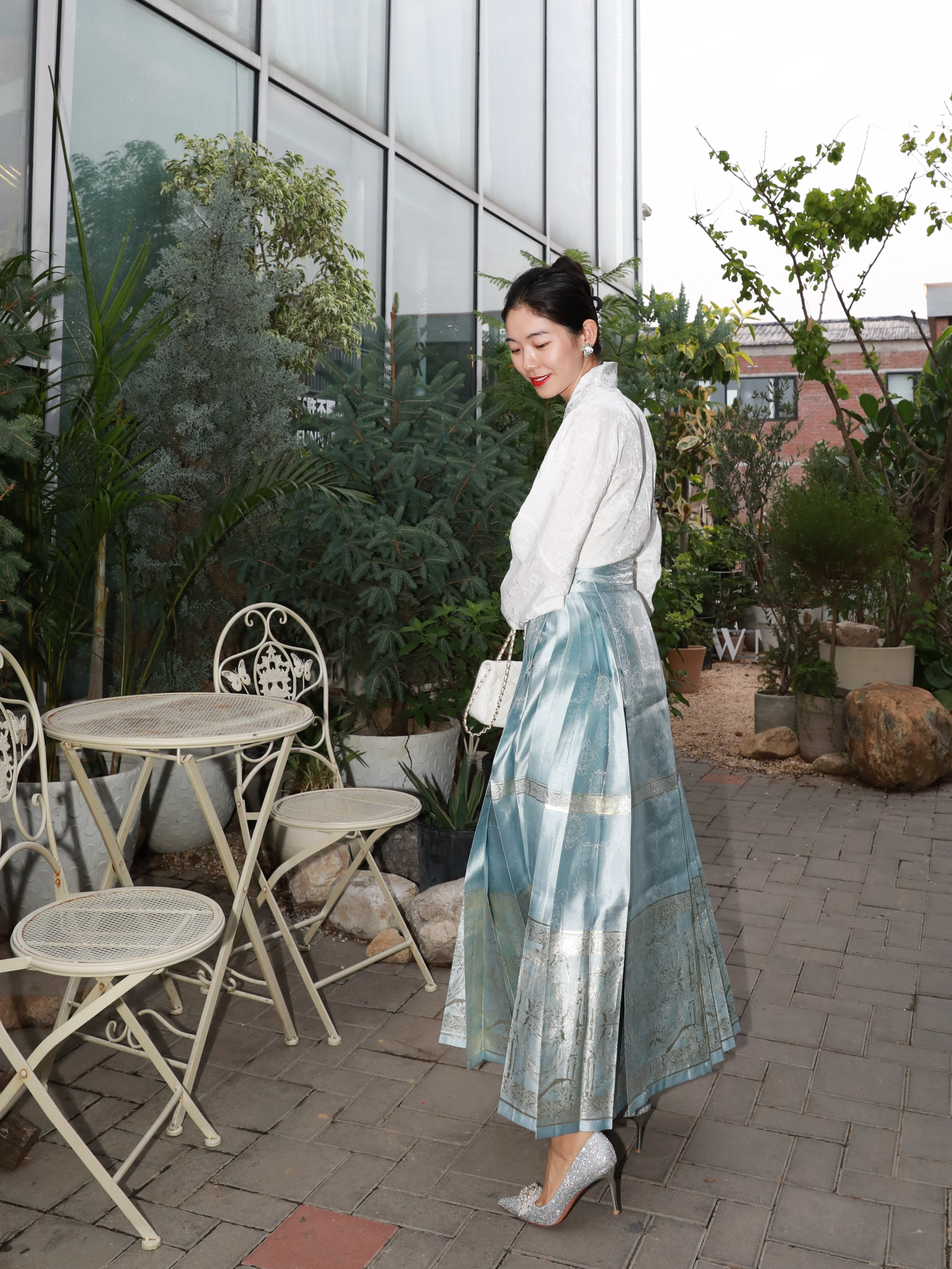 马面裙真的是行走的种草机🤗 东方美学真的是典雅隽永~ 在一个普通的下午,穿上后真的是吸引了太多路人的赞美与惊呼🤪 华服yyds~我们的传统服饰太美了 今天的这一套都是水揽星河的~ 上衣上细节太多了,提花的暗纹~ 材质柔软细腻穿着很是舒服😌 马面裙我选了蓝色的织金马面裙~ 太贵气了我只能说,穿上有种闪闪发光的感觉 今天在这个花园下午茶☕️ 好多店内的小姐姐盯着看😂 好看哦,穿着上也没想象中那么复杂 ...