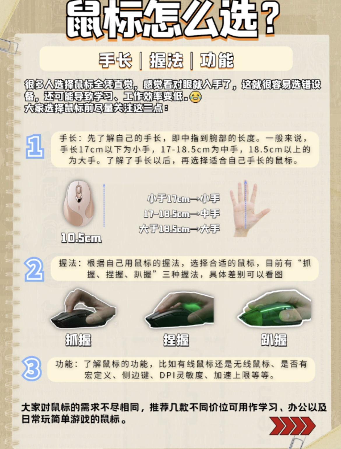 1⃣️手长:先了解自己的手长,即中指到腕部的长度。一般手长17cm以下为小手,17-18.5cm为中手,18.5cm以上的为大手。了解了手长以后,再选择适合自己手长的鼠标。