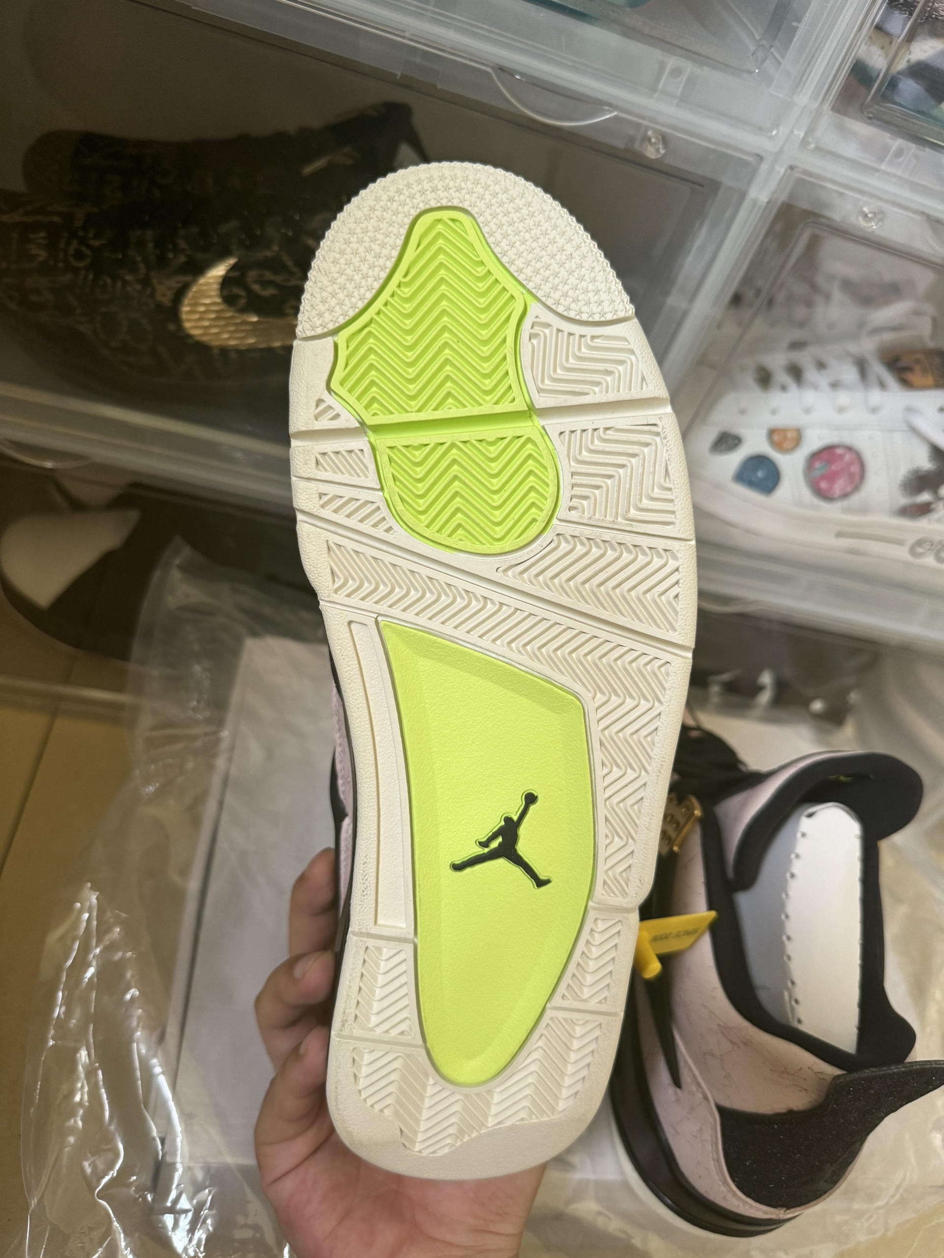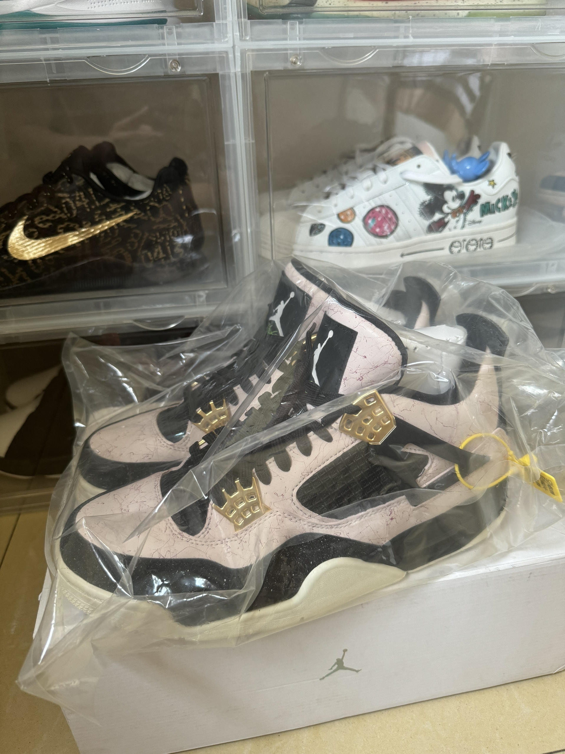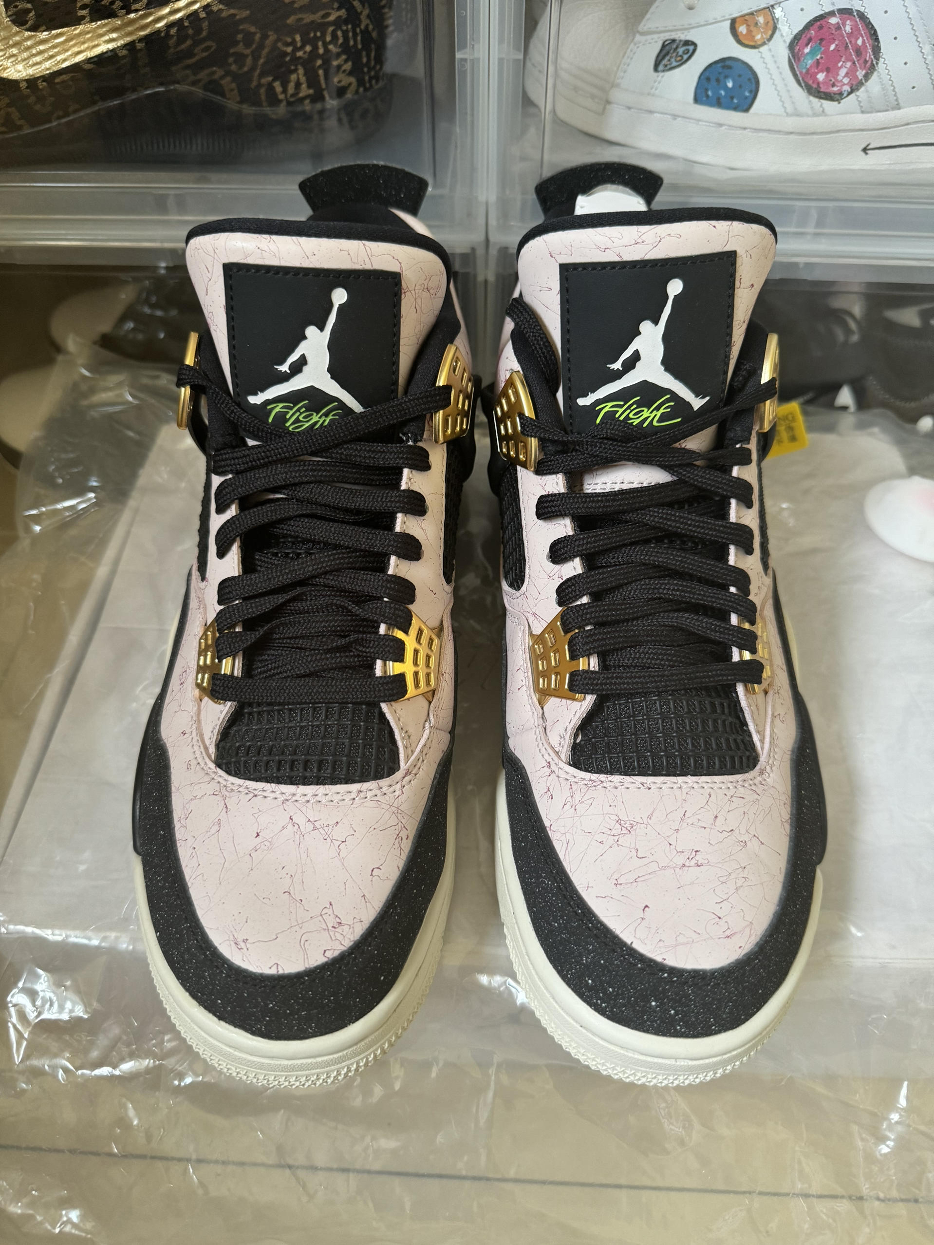 aj4大理石粉是个人觉得最骚气的猛男粉。整体球鞋以粉色的大理石纹为主。上脚效果很棒。同时还有金扣。鞋头和后跟采用了黑色磨砂质感的鞋面材质,散发出精致的光泽。十分少见。整体风格清新。细节满满。 aj4的鞋型本身就很优秀,搭配这么好看的颜色。值得入手!搭配情侣效果更棒。