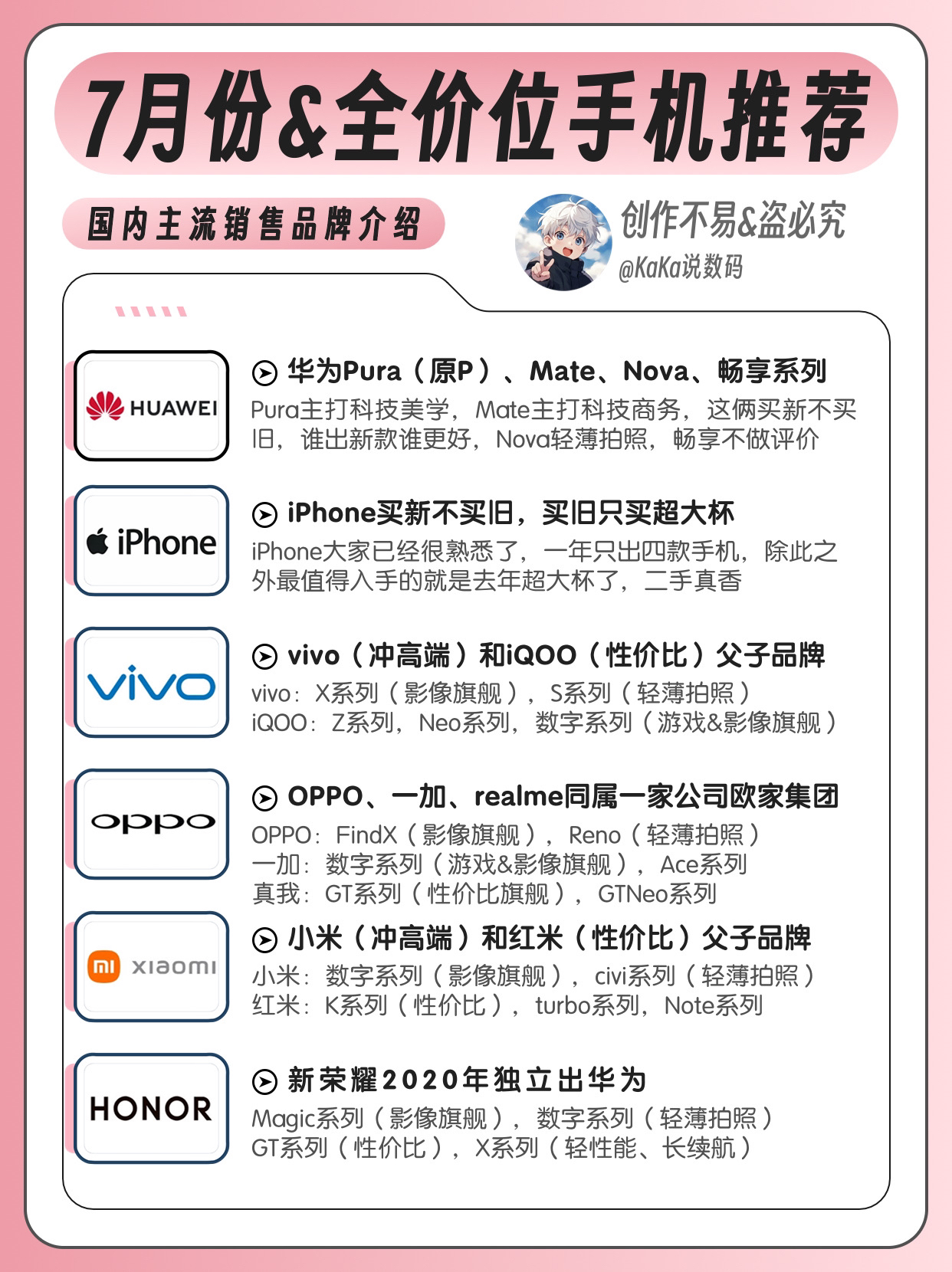 2024 半年已过,肝了一下午今天为大家整理了一份暑期7月~8 月全价位 1000~7000 元全品牌手机推荐合集,36 款手机具体分析,总有一款手机适合你。 - ❗️❗️❗️声明❗️❗️❗️ - ✅ 本期机型没有一款高价低配机型、请大家放心选择、一分钱都不让您不多花。 - ✅ 本期推荐机型都是新款手机,俗话说买新不买旧,新款手机厂商维护的时间也长一些 - ✅ 本期引入极客湾手机端CPU 综合性能...