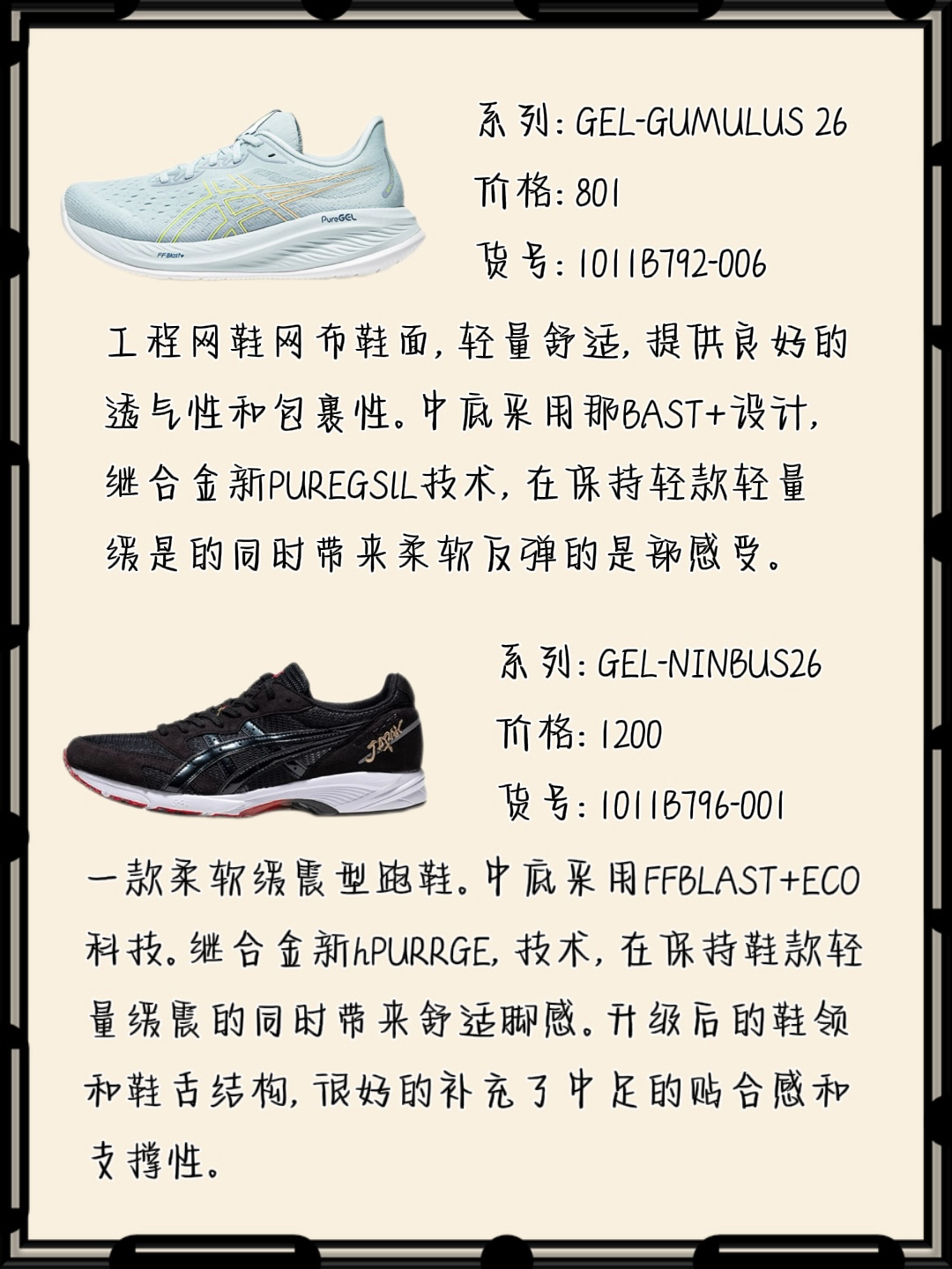 系列:GEL-GUMULUS 26,工程网鞋网布鞋面,轻量舒适,提供良好的透气性和包裹性。中底采用那BAST+设计,继合金新PUREGSLL技术,在保持轻款轻量缓是的同时带来柔软反弹的是部感受。 系列:GEL-NINBUS26,一款柔软缓震型跑鞋。中底采用FFBLAST+ECO科技。继合金新hPURRGE,技术,在保持鞋款轻量缓震的同时带来舒适脚感。升级后的鞋领和鞋舌结构,很好的补充了中足的贴合...