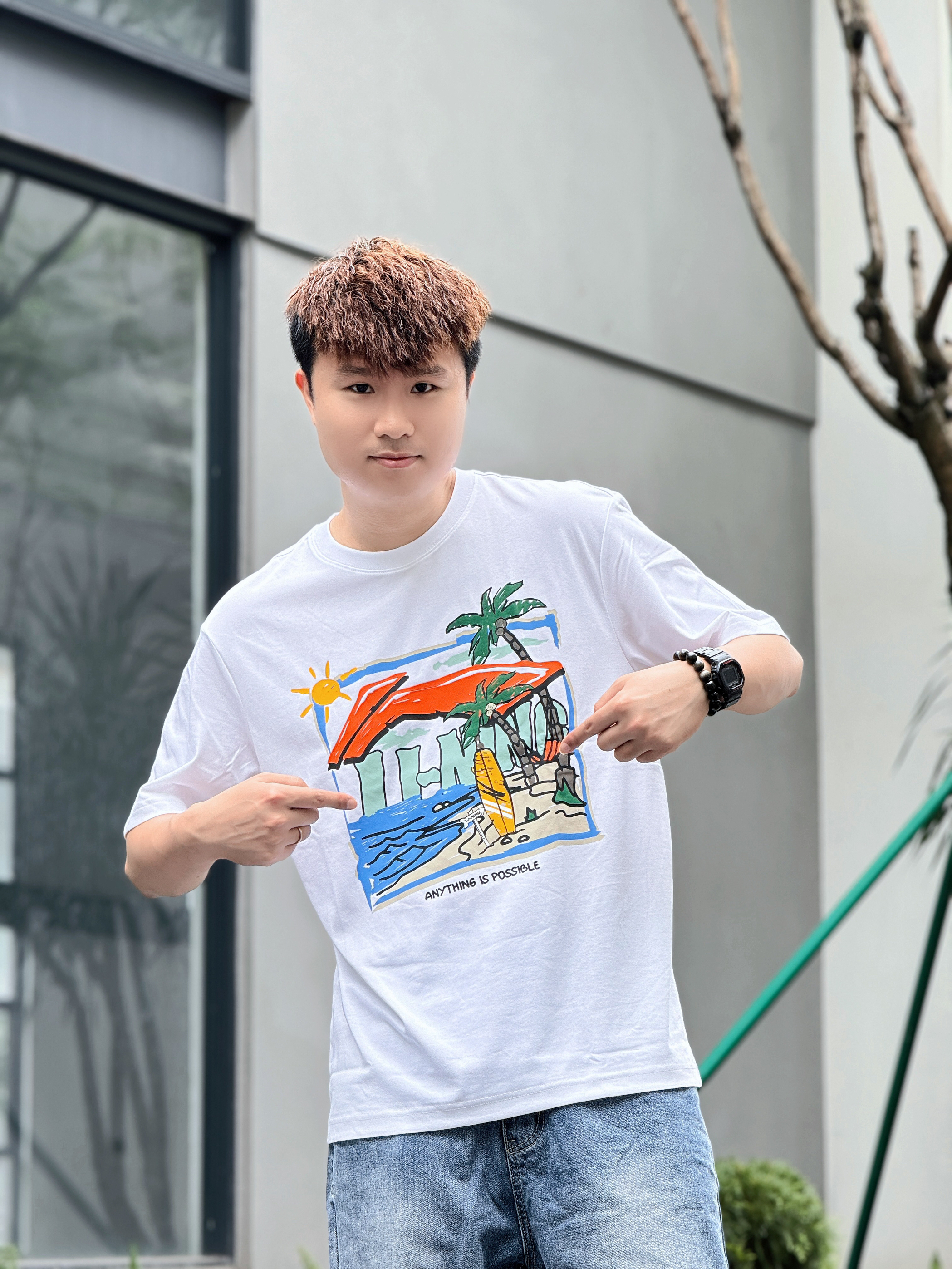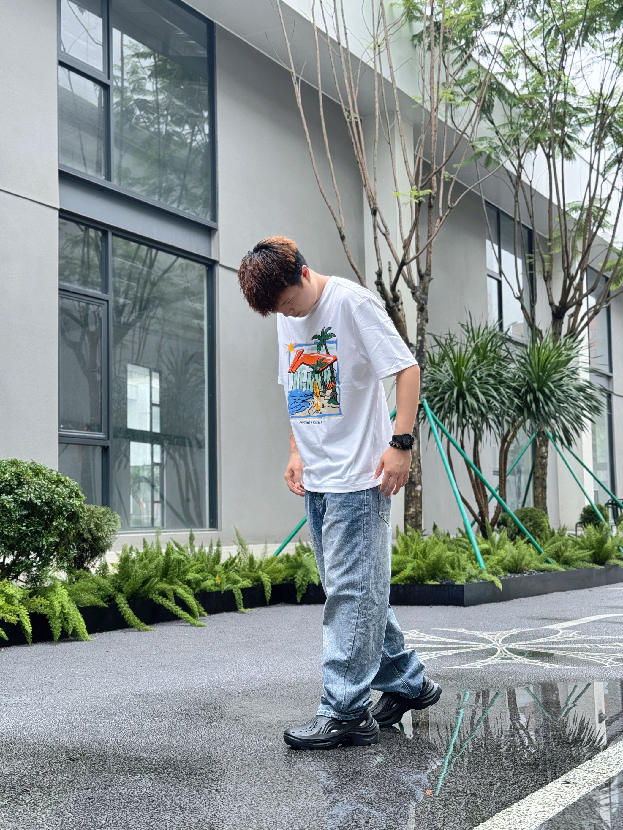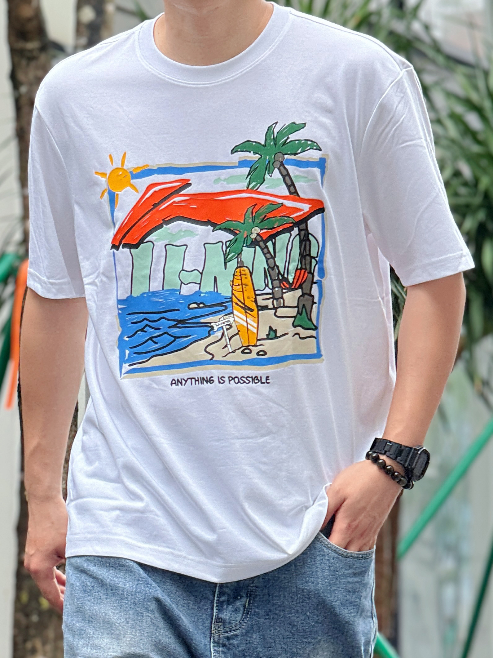 转眼间周末就要结束了 但我的心依然还在度假⛱️ 好在雨量终于有减少的迹象 期待不久就能迎来了久违的阳光☀️ 正好约了朋友去创意园区逛逛拍照📷 那就换上一套超级适合度假的穿搭吧 上衣是国潮李宁Lining的度假系列 简单的白T印有趣味的涂鸦✍️ 以椰树🌴海浪🌊沙滩🏄为设计灵感 加上凉感舒适的材质和宽松版型 真的太适合夏季出游穿着啦 下身搭配上清爽的牛仔蓝阔腿裤 再穿一双适合玩水的潮流凉拖 妥妥的...