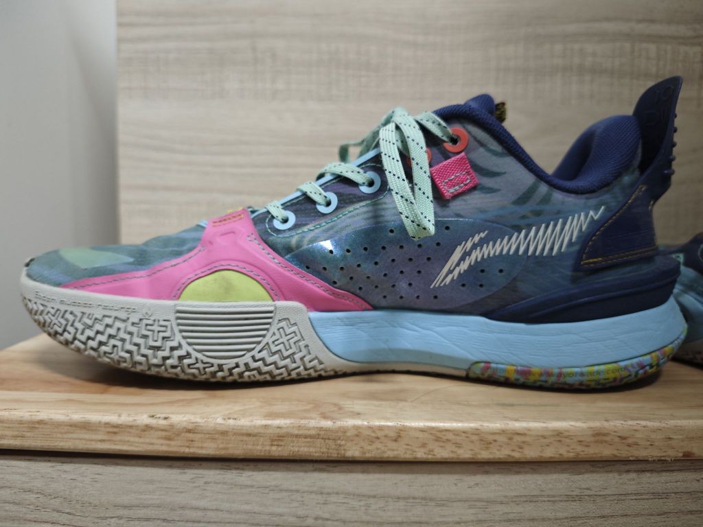 这双是我的同学的一双全城10(45码),他是瘦脚,高脚背,中高足弓。那么接下来就让我们带着这样的信息来看一看,这双鞋到底怎么样? 1.拥有不错的蹬地感受。 这双鞋场地感很不错,突破的时候有助推的感受,整体重心也比较平缓,适合轻体重球员进行穿着。 2.稍有掉跟感受。 据这位同学所说,他穿这双鞋会有轻微掉跟的感觉,但是系紧鞋带之后影响不大。 3.不错的防侧翻 前面有一个异型立体椭圆tpu材质防侧翻角的...