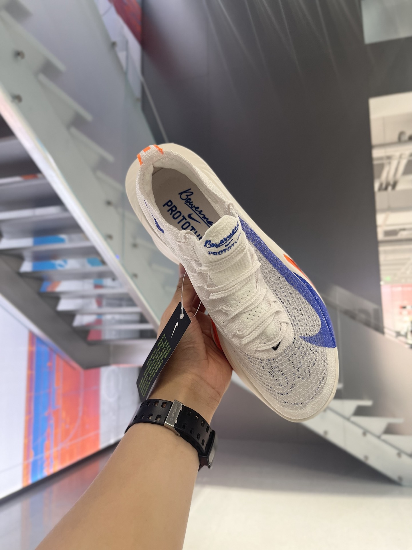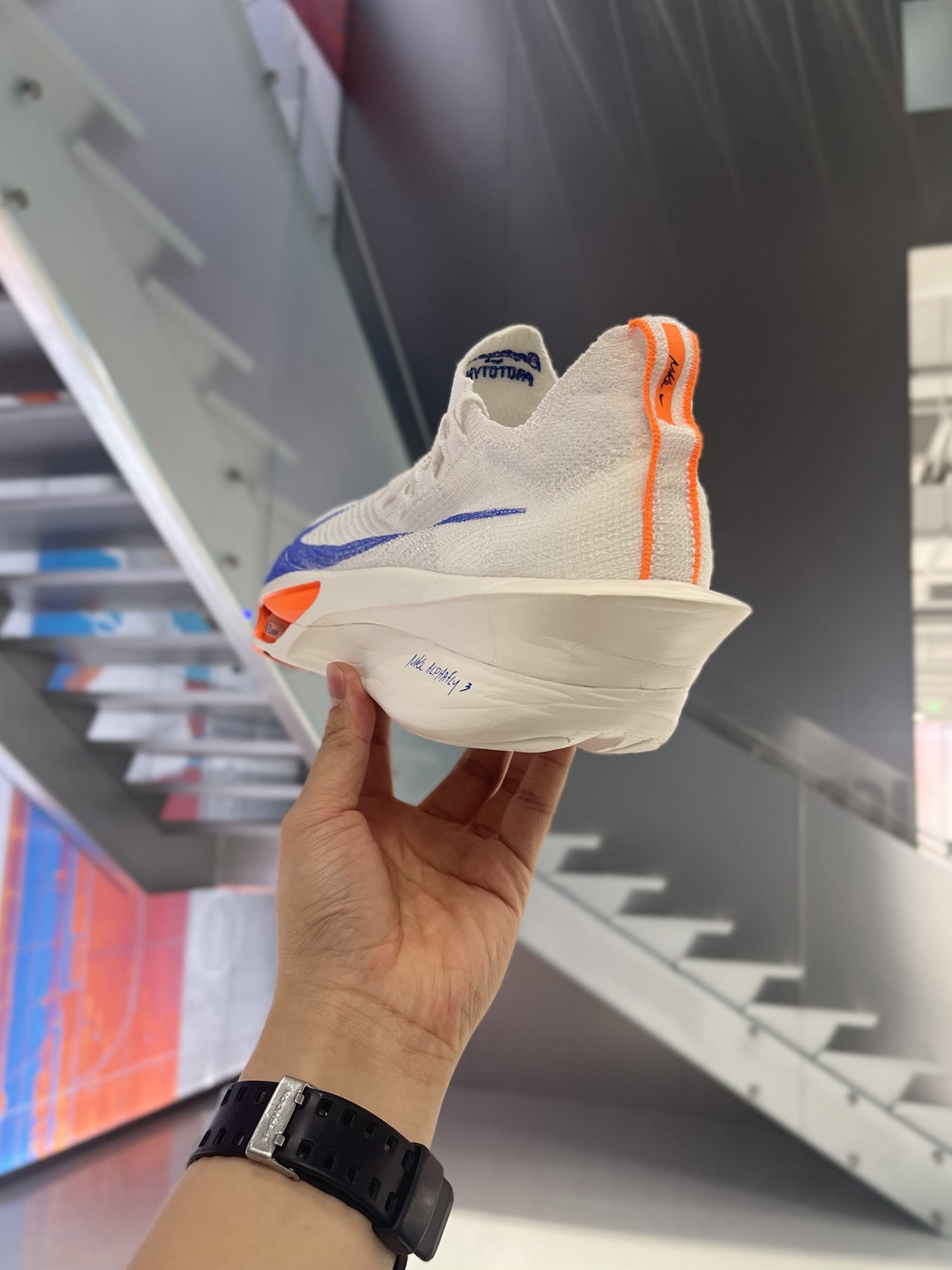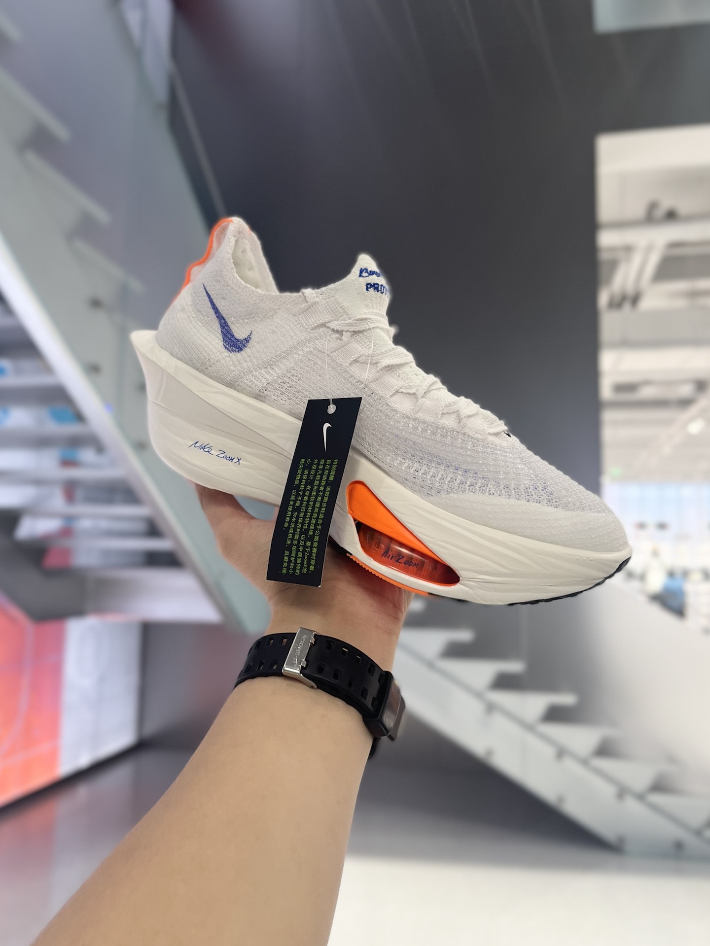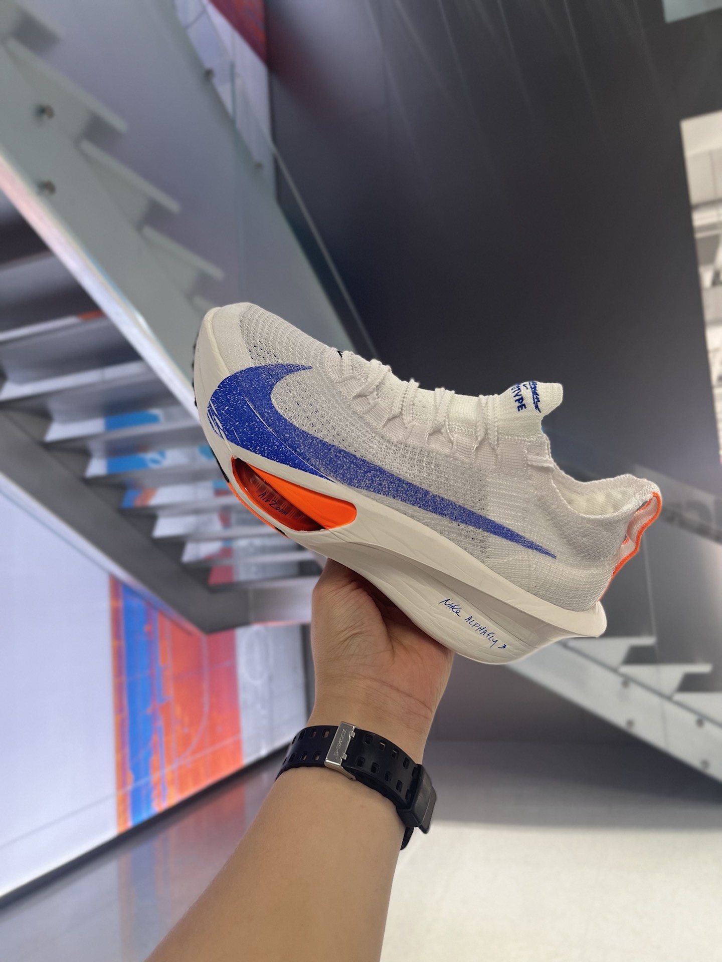 🔥阿尔法3代蓝图配色,也太帅了吧,本身拉满都已经很吸引人,再加上这么清爽的白蓝橙配色,夏天就穿这双鞋啦!!! 👟外侧蓝色的Swoosh从中底延伸至鞋面,采用泼墨点绘式,鞋舌及侧边都带有复古手写字体,鞋垫上的图案很个性! ✔️这双Alphafly3代竞速跑鞋的鞋面,采用柔软升级的纱线,透气的同时,兼顾了支撑性~ 🔥中底配置方面,前掌两块橙色的Zoom气垫缓震,厚实的ZoomX泡棉,轻质又回弹的脚感,...