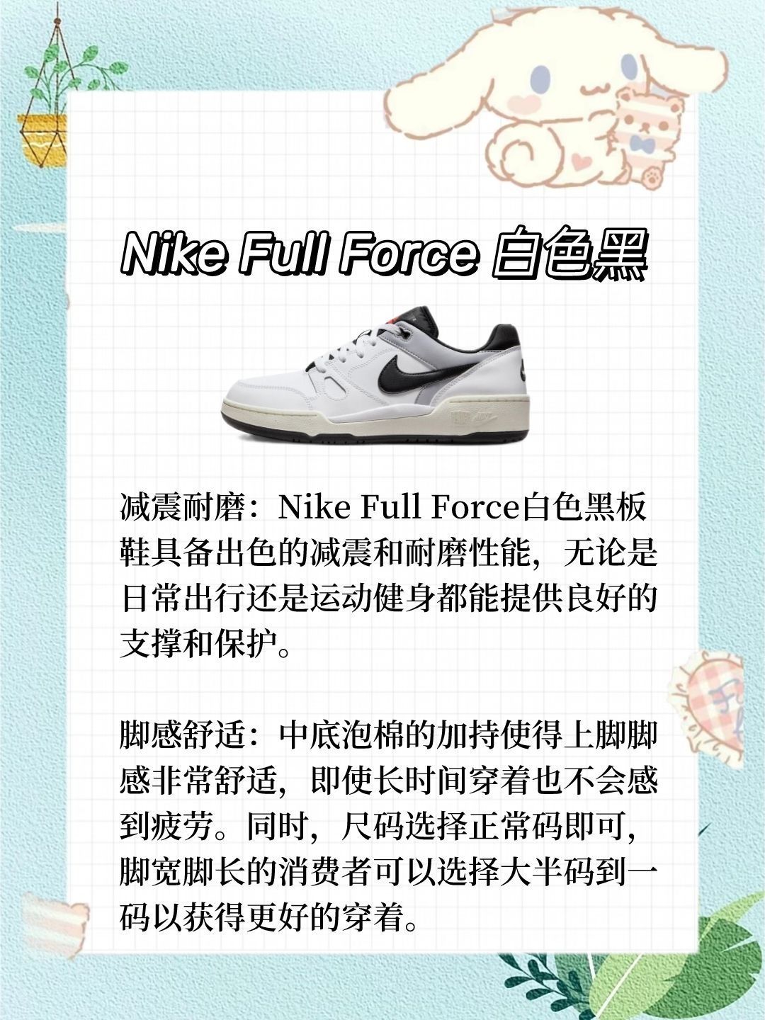 💖Nike Full Force白色黑 减震耐磨:Nike Full Force白色黑板鞋具备出色的减震和耐磨性能,无论是日常出行还是运动健身都能提供良好的支撑和保护。 脚感舒适:中底泡棉的加持使得上脚脚感非常舒适,即使长时间穿着也不会感到疲劳。同时,尺码选择正常码即可,脚宽脚长的消费者可以选择大半码到一码以获得更好的穿着体验。 💖Nike Court Vision 白色浅绿色 防滑耐磨:鞋底采...