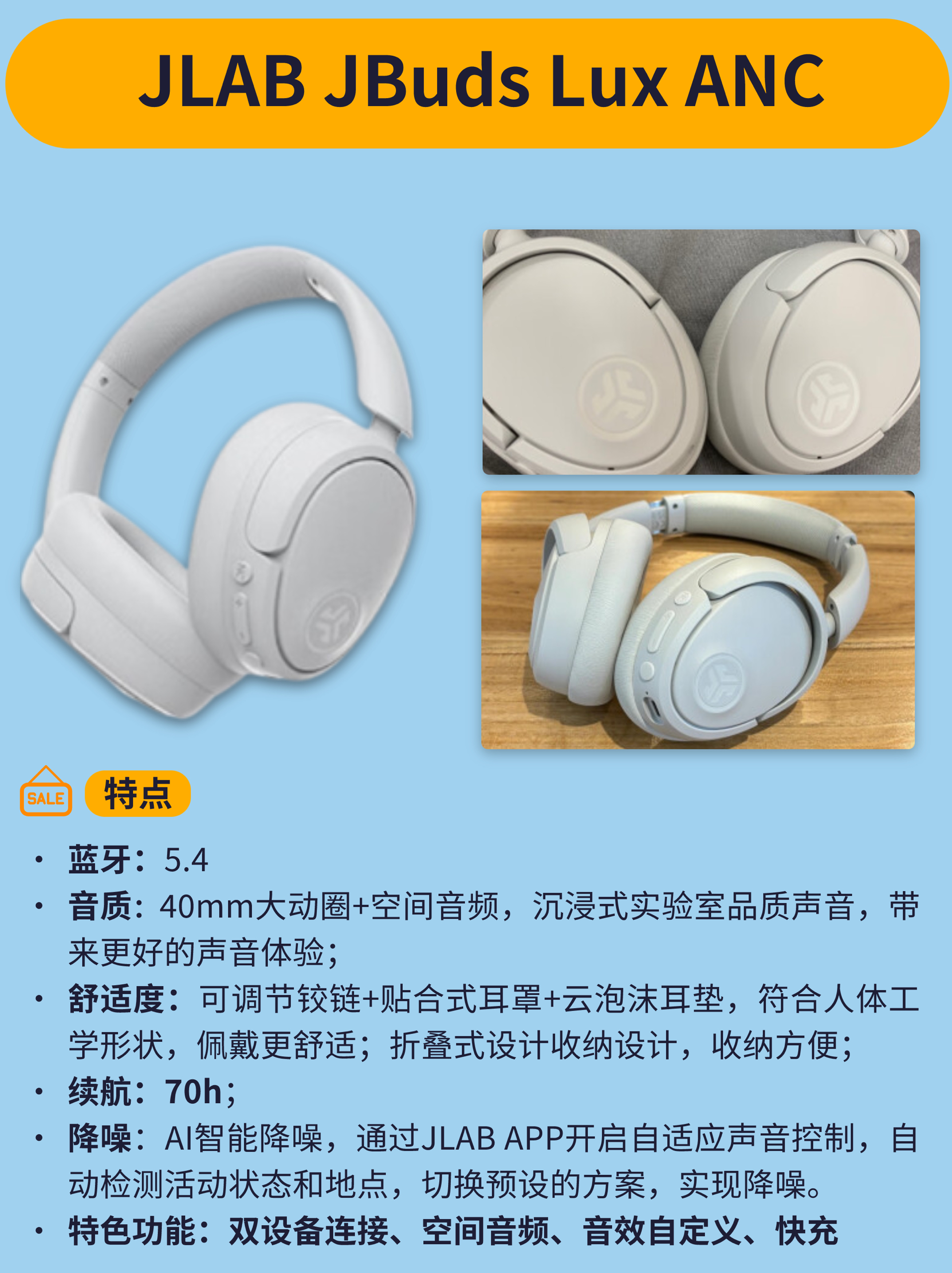 大家好,我是爱数码的 j 同学,今天给大家整理了500元左右的头戴式耳机选购指南,喜欢的朋友收藏再看哦~ JLab JBuds Lux ANC 蓝牙:5.4 音质:40mm大动圈+空间音频,沉浸式实验室品质声音,带来更好的声音体验; 舒适度:可调节铰链+贴合式耳罩+云泡沫耳垫,符合人体工学形状,佩戴更舒适;折叠式设计收纳设计,收纳方便; 续航:70h; 降噪:AI智能降噪,通过JLA...