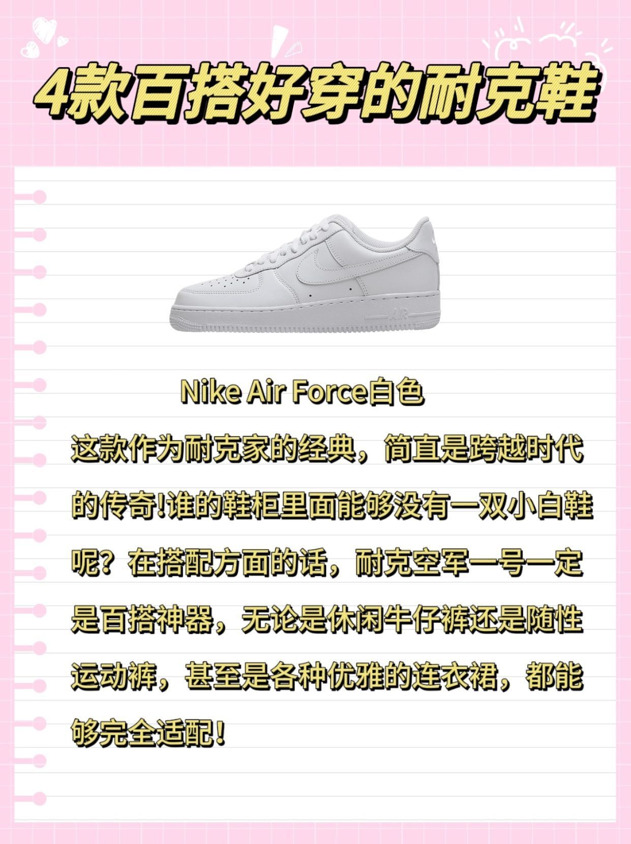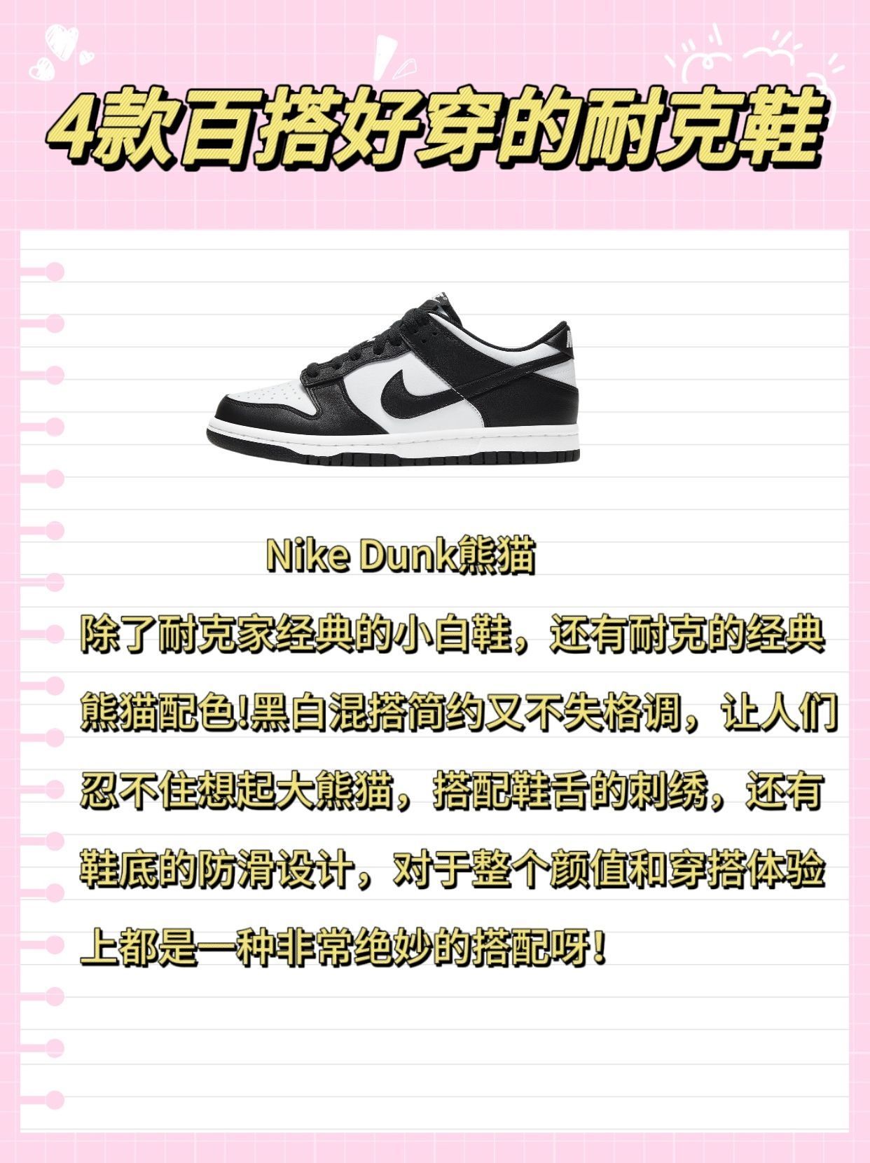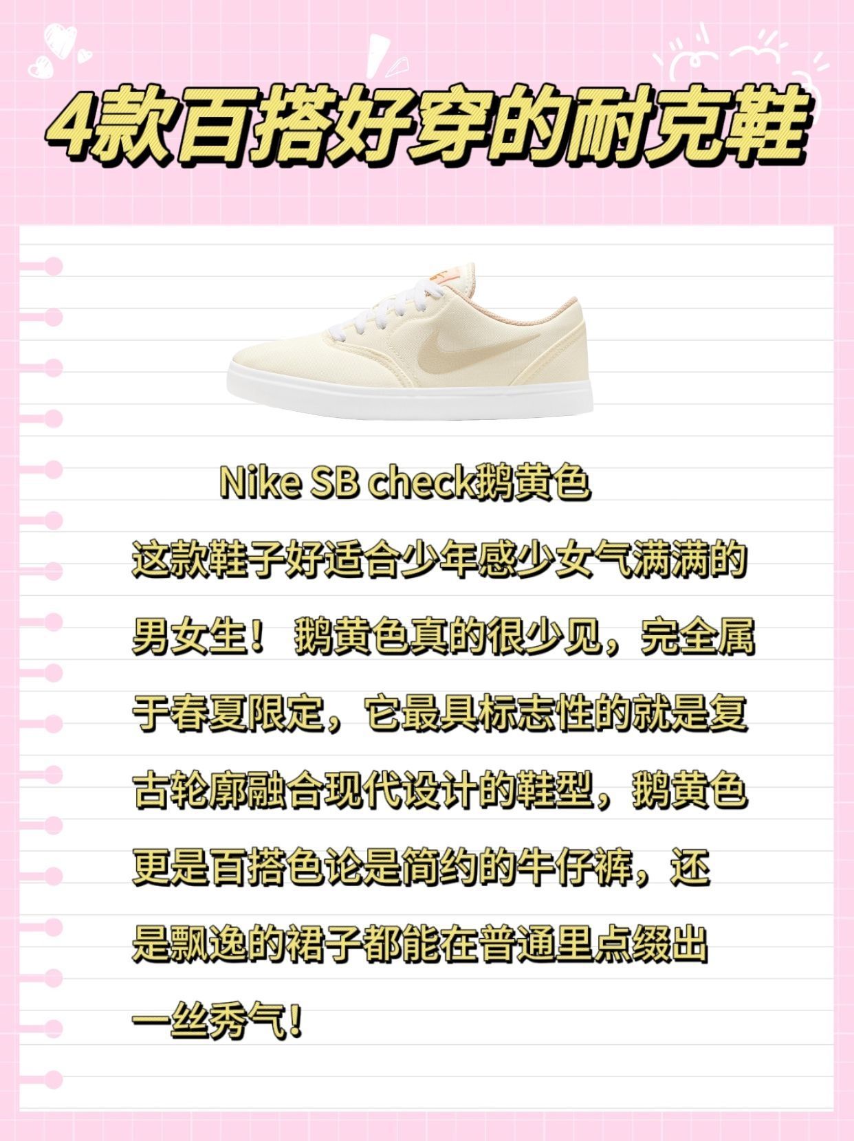 我说耐克真的别太好搭了! 什么样的穿搭搭配耐克都好绝,被朋友夸了无数次,很会穿搭的。我今天就和大家分享一下我怎么把我的四双鞋子搭出花来~ 💛1.Nike SB check鹅黄色 这款鞋子好适合少年感少女气满满的男女生! 鹅黄色真的很少见,完全属于春夏限定,它最具标志性的就是复古轮廓融合现代设计的鞋型,鹅黄色更是百搭色无论是简约的牛仔裤,还是飘逸的裙子都能在普通里点缀出一丝秀气! 💜2.Nike...