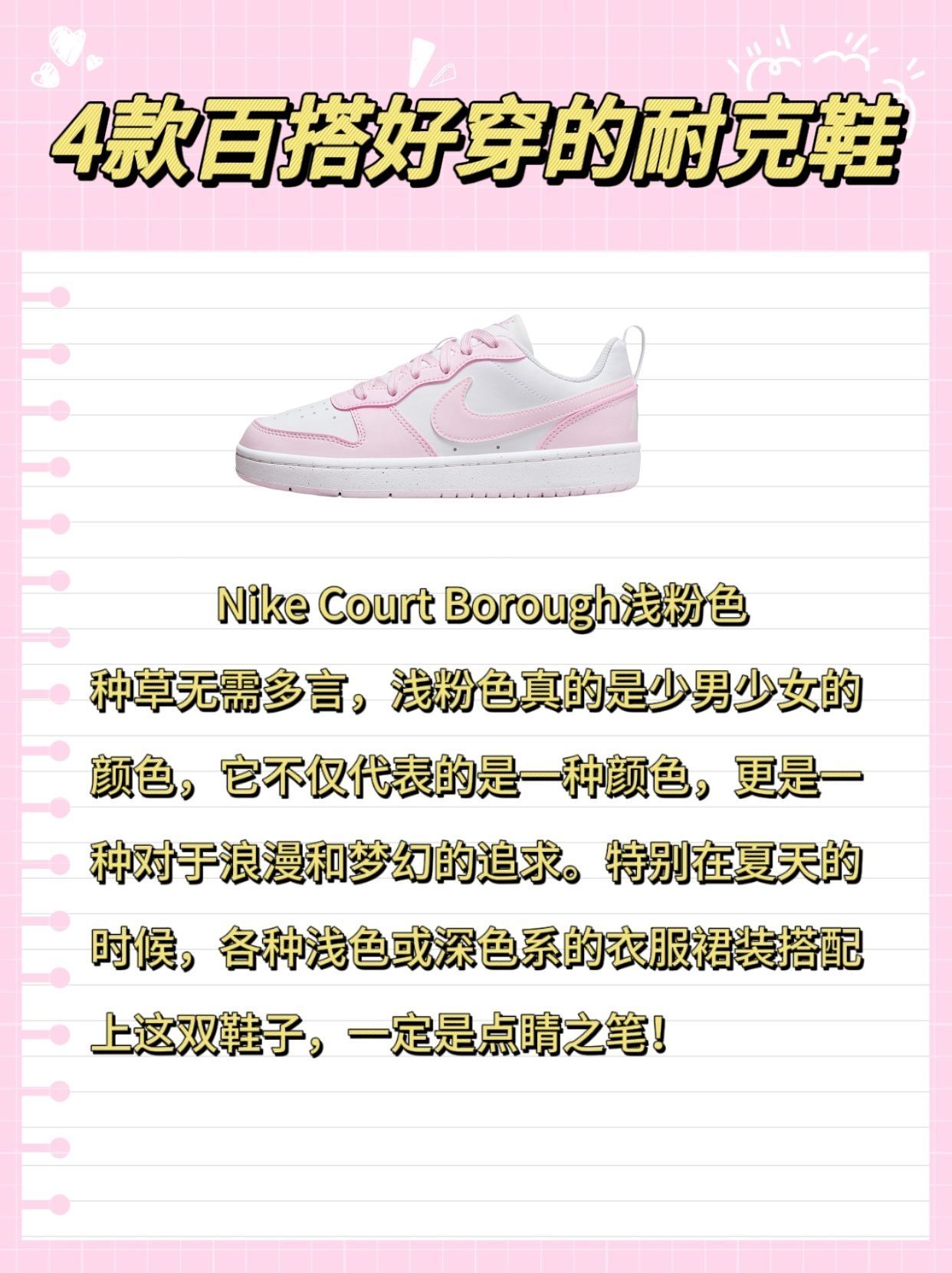 本篇笔记关联了Nike SB Check 滑板鞋 板鞋 潮流舒适轻便透气防滑耐磨运动时尚经典复古 GS/鹅黄色/白色、Nike Air Force 1 空军一号 板鞋 轻便舒适百搭耐磨防滑 纯白经典、Nike Court Borough 复古 舒适透气 防滑耐磨 轻便 防水耐穿 板鞋 运动休闲鞋 GS/嫩粉色/白色等商品,为用户提供真实的使用体验和购买参考。