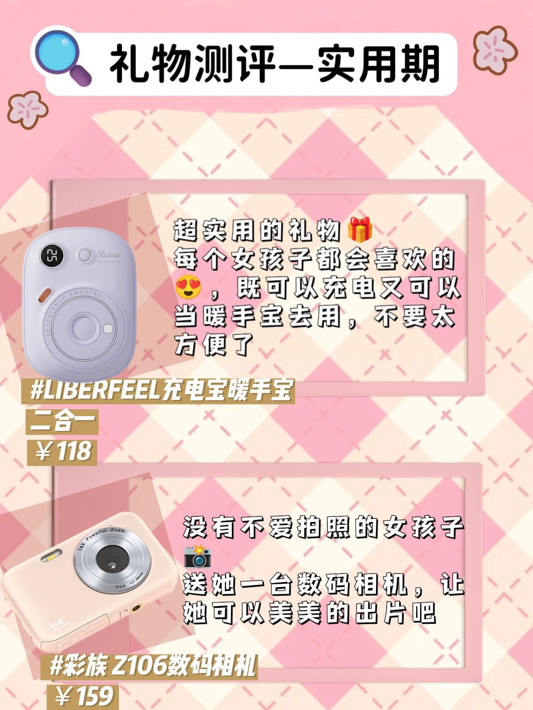 本篇笔记关联了LIBERFEEL/冇心 T-55 暖手宝 充电宝二合一 冬季 女生礼物 随身携带 防爆 自发热 两用 手握 鸢尾紫、CAIZU/彩族 Z106 数码相机 高像素 入门级 少女粉、Viney 小号真皮高级感简约复古时尚大容量通勤休闲实用小众百搭单肩包斜挎包腋下包 白配绿等商品,为用户提供真实的使用体验和购买参考。