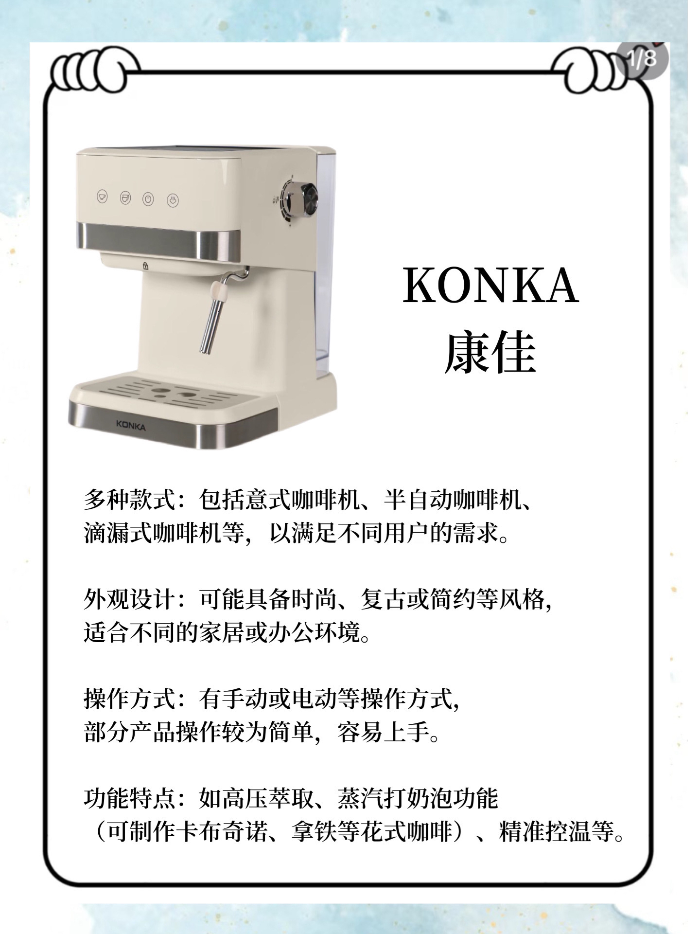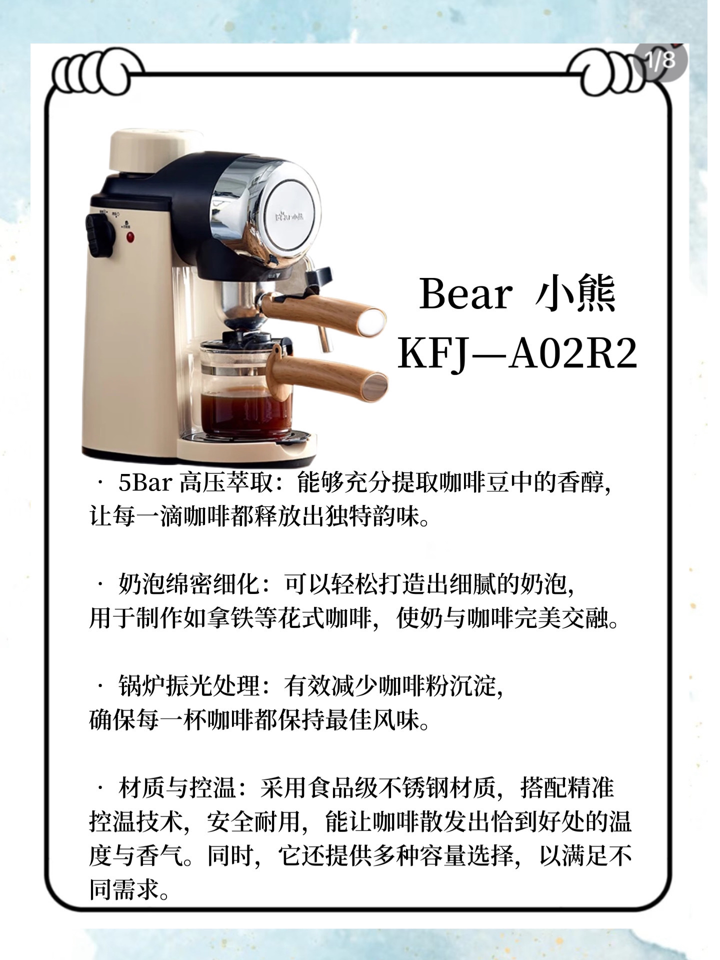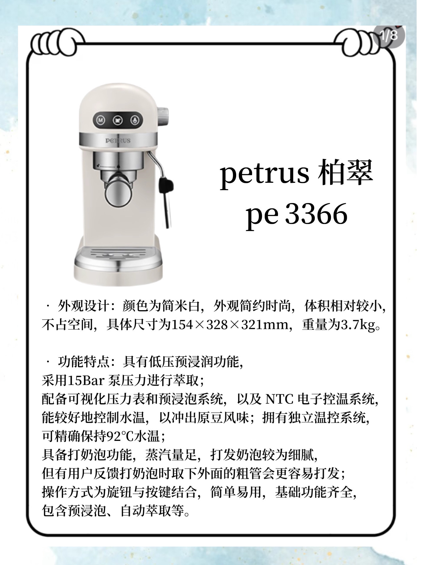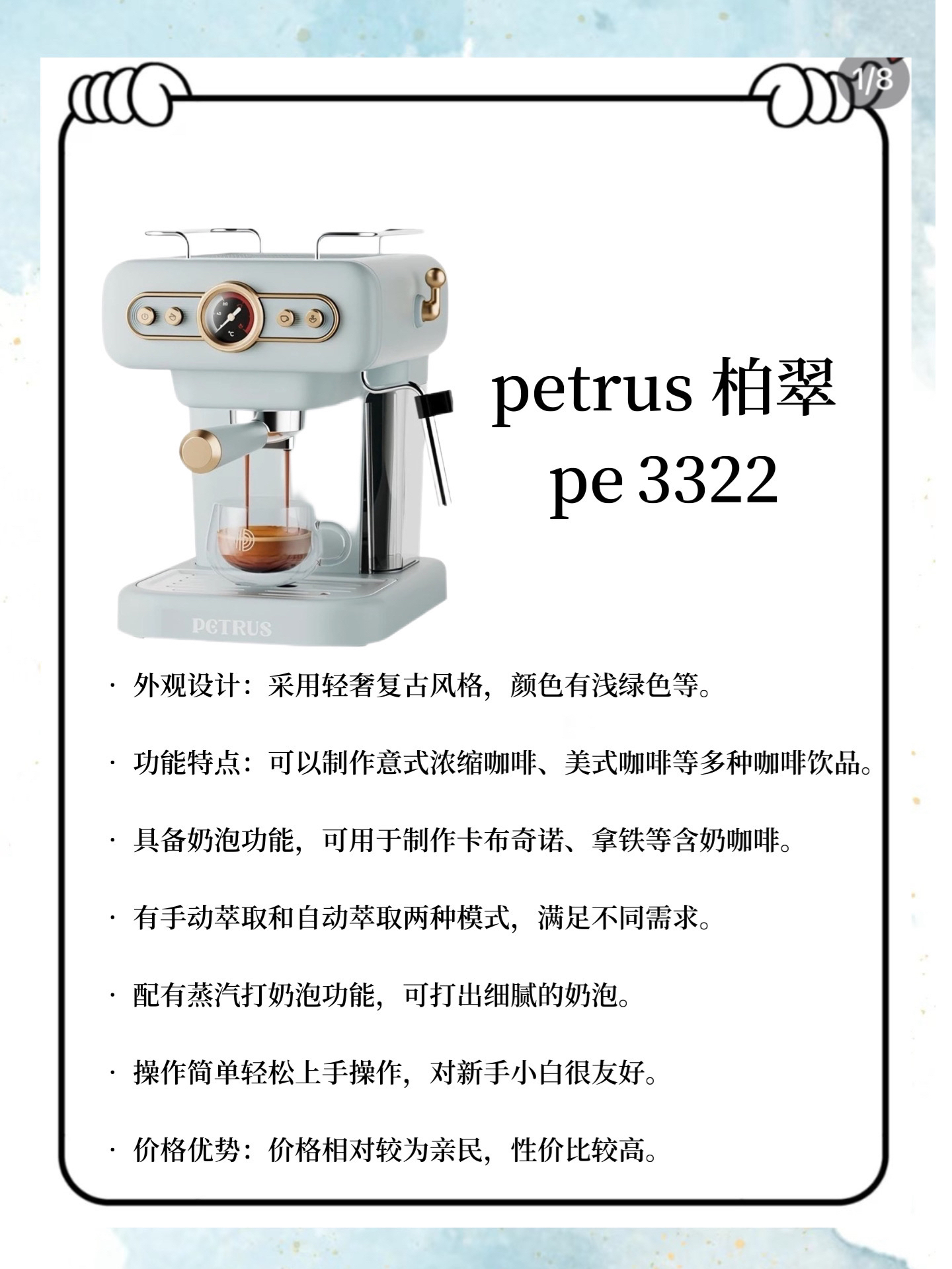 本篇笔记关联了PETRUS/柏翠 咖啡机 意式 浓缩 半自动 家用 智能萃取 打奶泡 复古 小白醒醒 美式 蒸汽 现磨 米白色、Bear/小熊 咖啡机 可打奶泡 家用小型 意式 美式 全半自动 泵压式 高压萃取 花式 冲泡一体 蒸汽 手研 磨煮 性价比 煮咖啡 米白色、PETRUS/柏翠 咖啡机 意式浓缩 全半自动 蒸汽打奶泡 复古 美式 官方标配 套餐一 家用 一体 浅绿色等商品,为用户提供真实的使用体验和购买参考。