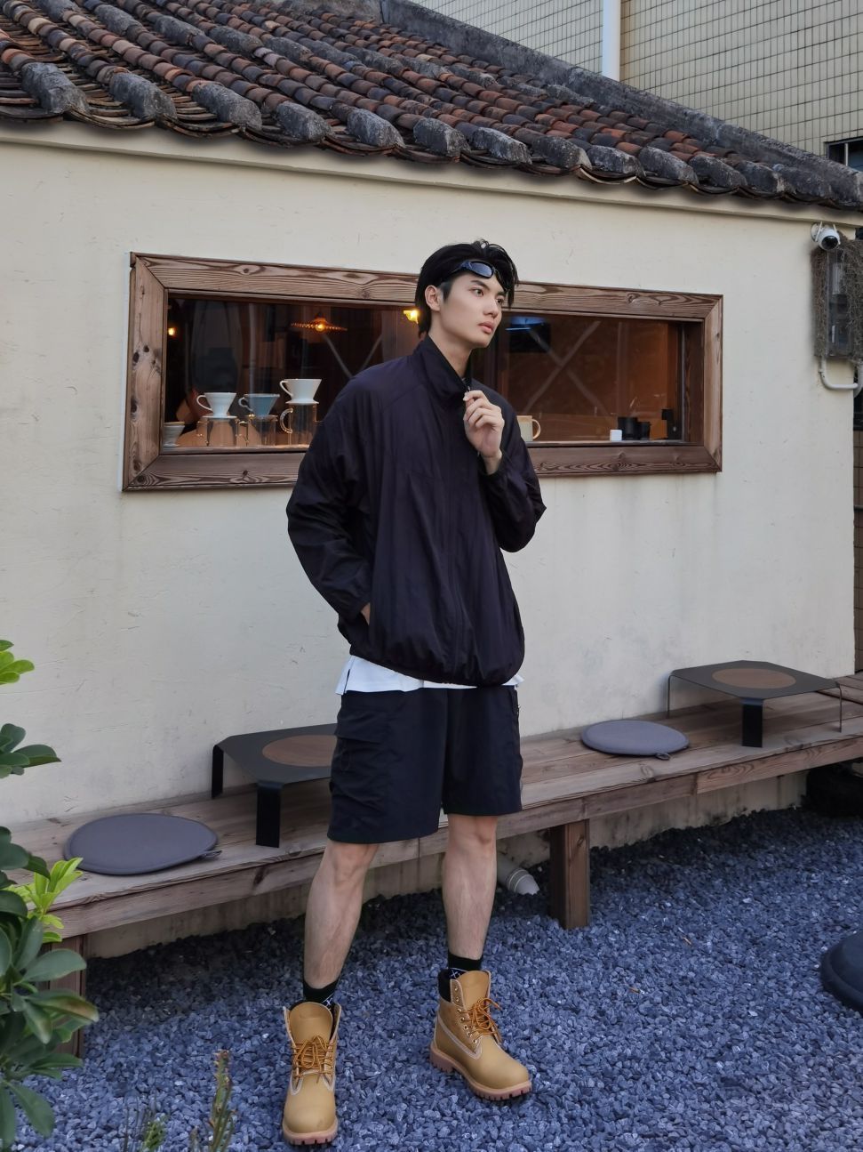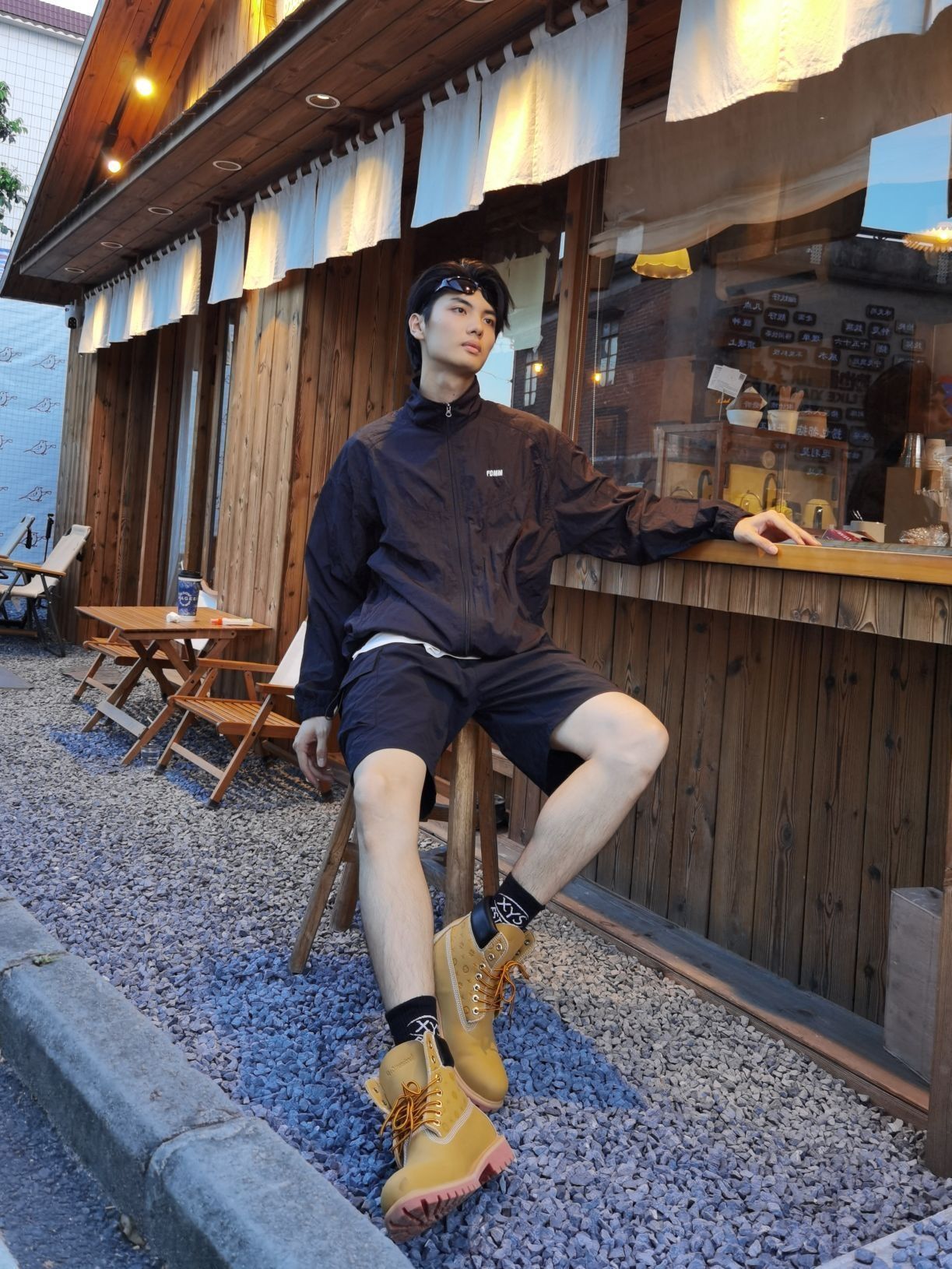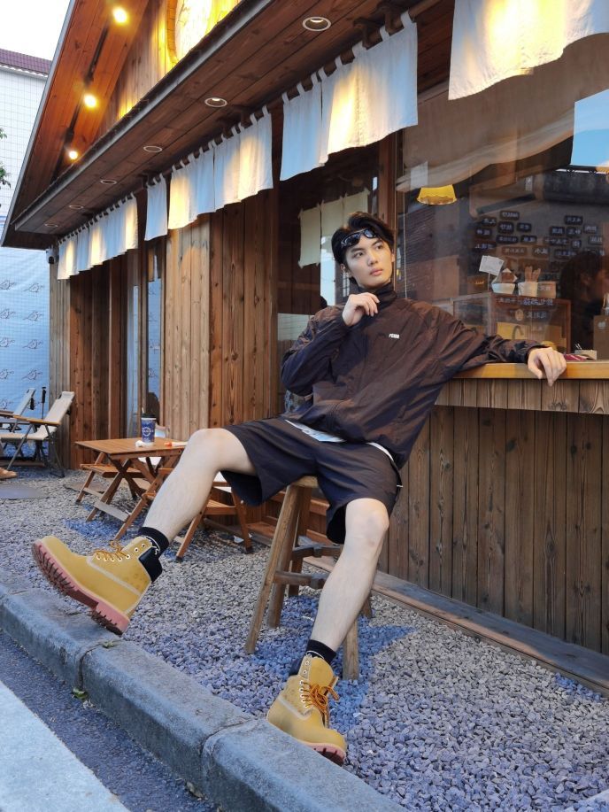 都问我这个靴子在哪买的 身高|体重:185 140 🧍♂️ 穿搭风格:潮流型男 👔 上衣:黑色防晒服 👖 下装:黑色短裤 👟 鞋子:大黄靴 🎒配饰:墨镜