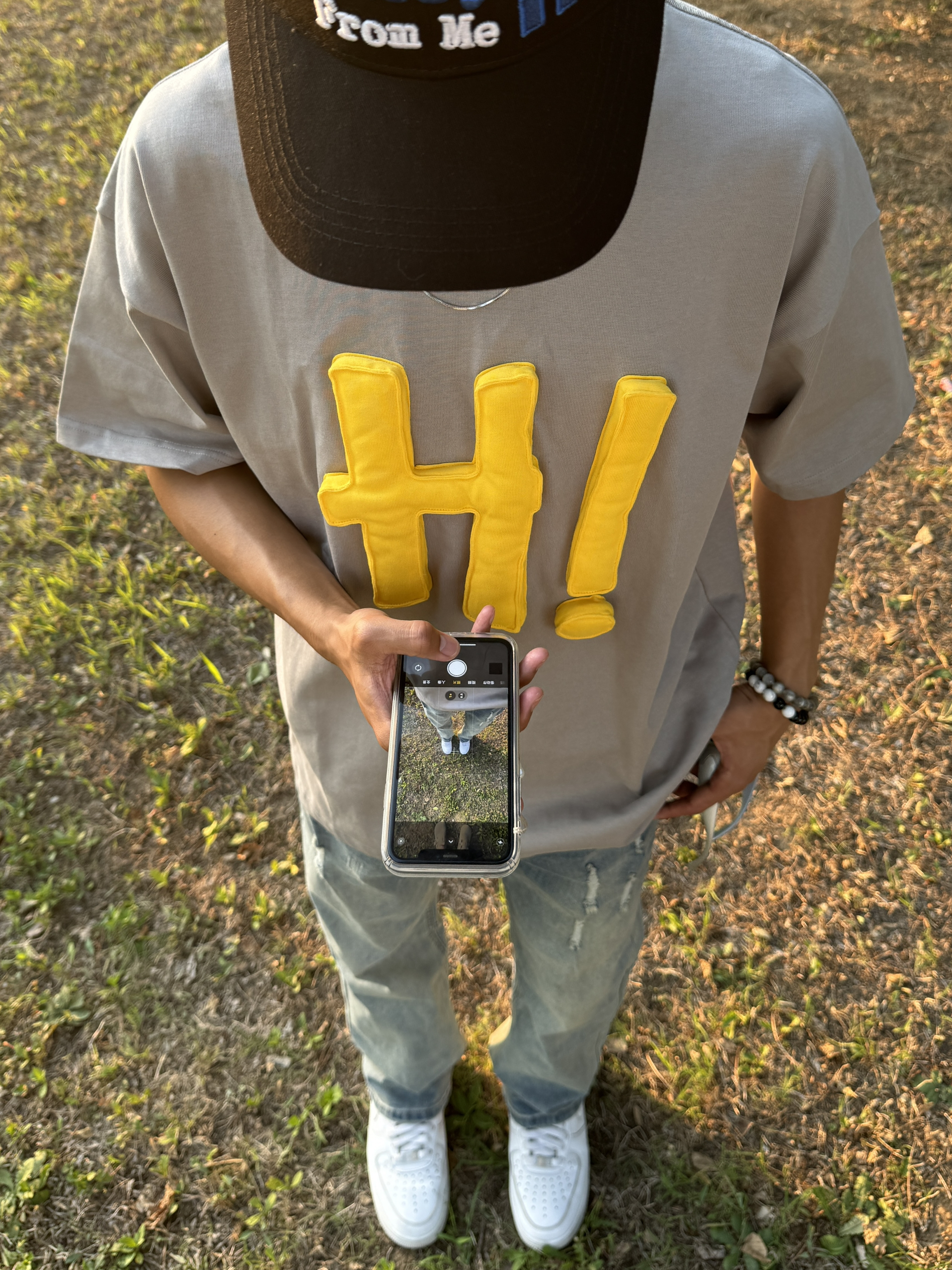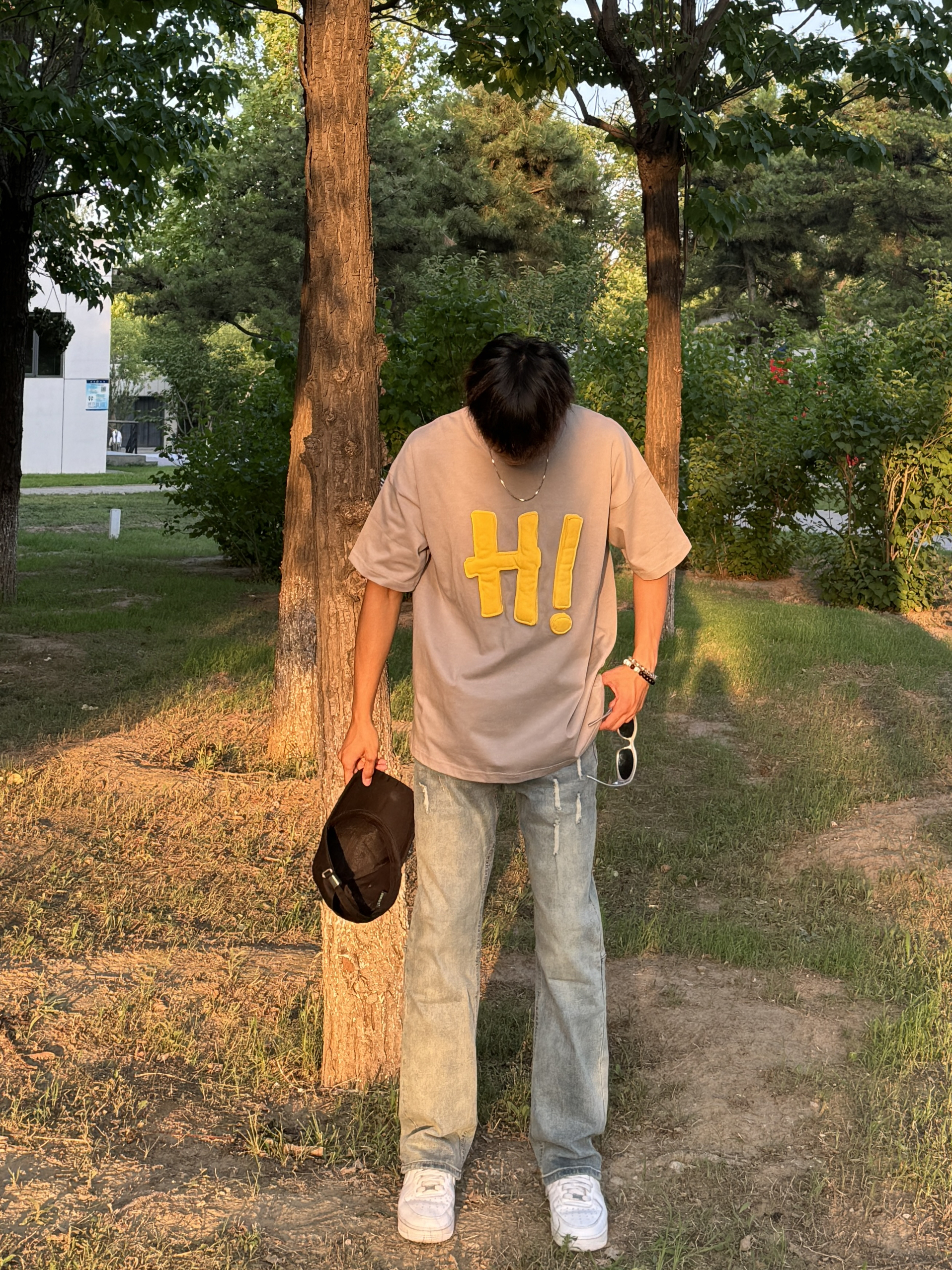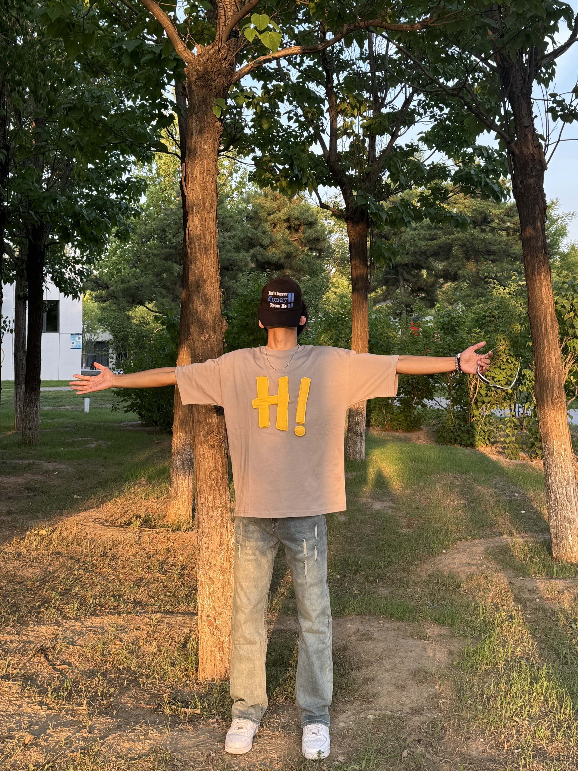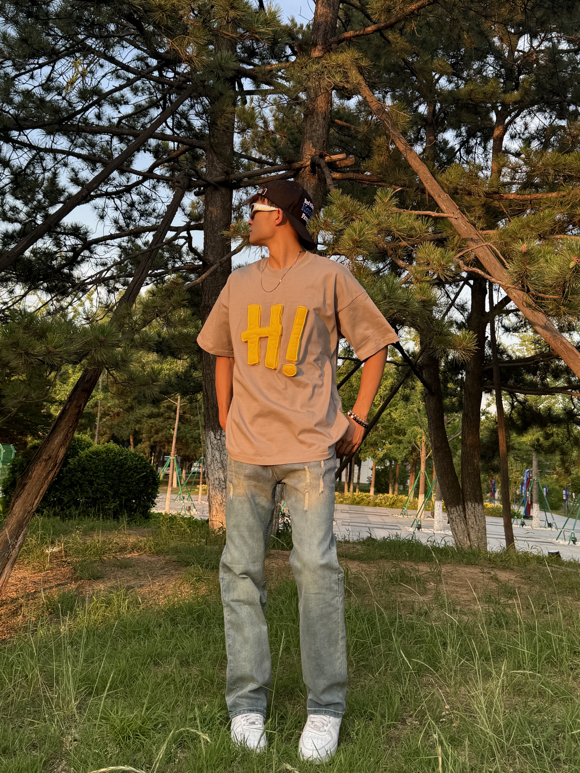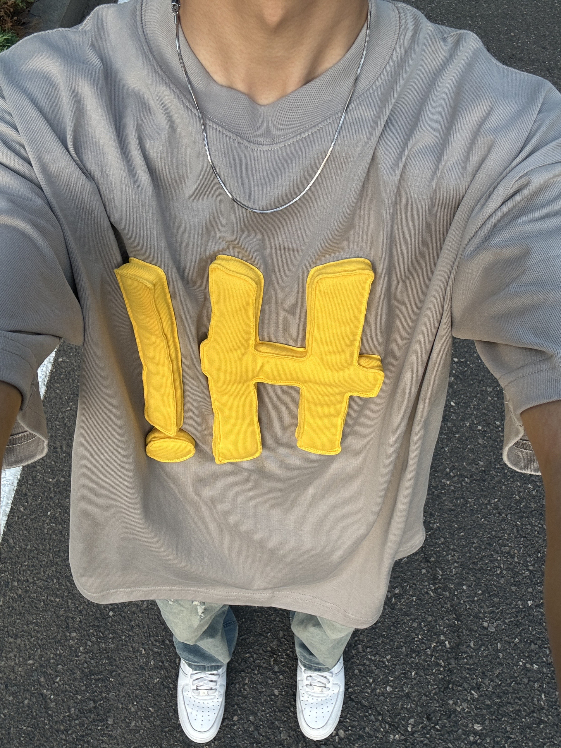 上身 立体印花也太帅了吧!胸前字母摸起来手感好舒服,我还喜欢这个T的颜色,水泥灰搭配黄色很成熟,又很少年,还很百搭! 下身 搭配破洞蓝牛,基础款蓝牛我最近经常穿的,感觉也超级百搭还舒服,直筒版型我的腿巨长!