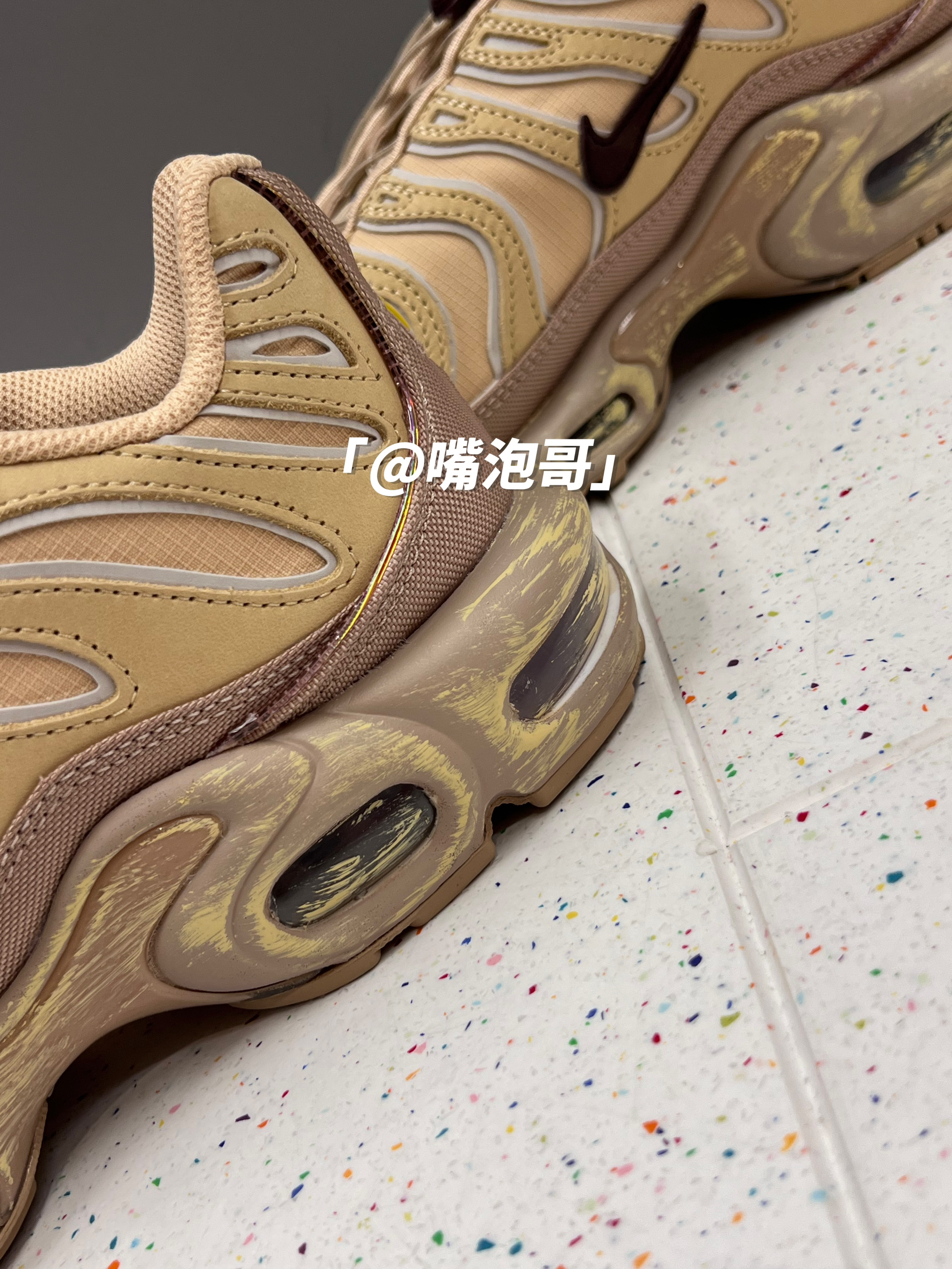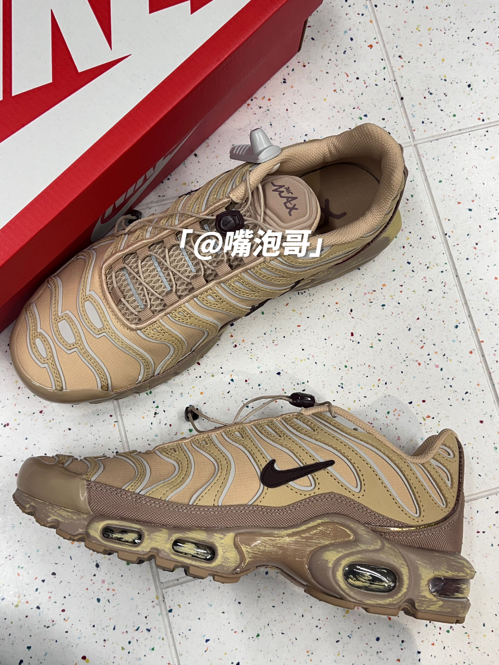 👟:Air Max Plus 棕色 简介: 鞋子是一双复古的Air Max 系列跑鞋,整双鞋子选用了棕色来呈现,很有户外的感觉,而且鞋面是织物材料的,比较利于透气,搭配上柔软的全掌气垫,使鞋子的两侧有所增加。 细节: 鞋面采用了柔软的复古织物布制作而成,使鞋面具有良好的透气性,鞋舌与鞋后跟内里填充柔软,提升舒适度,鞋身上还加入了软质橡胶线条,不仅增加了层次感,同时又增强了鞋面强度,中...