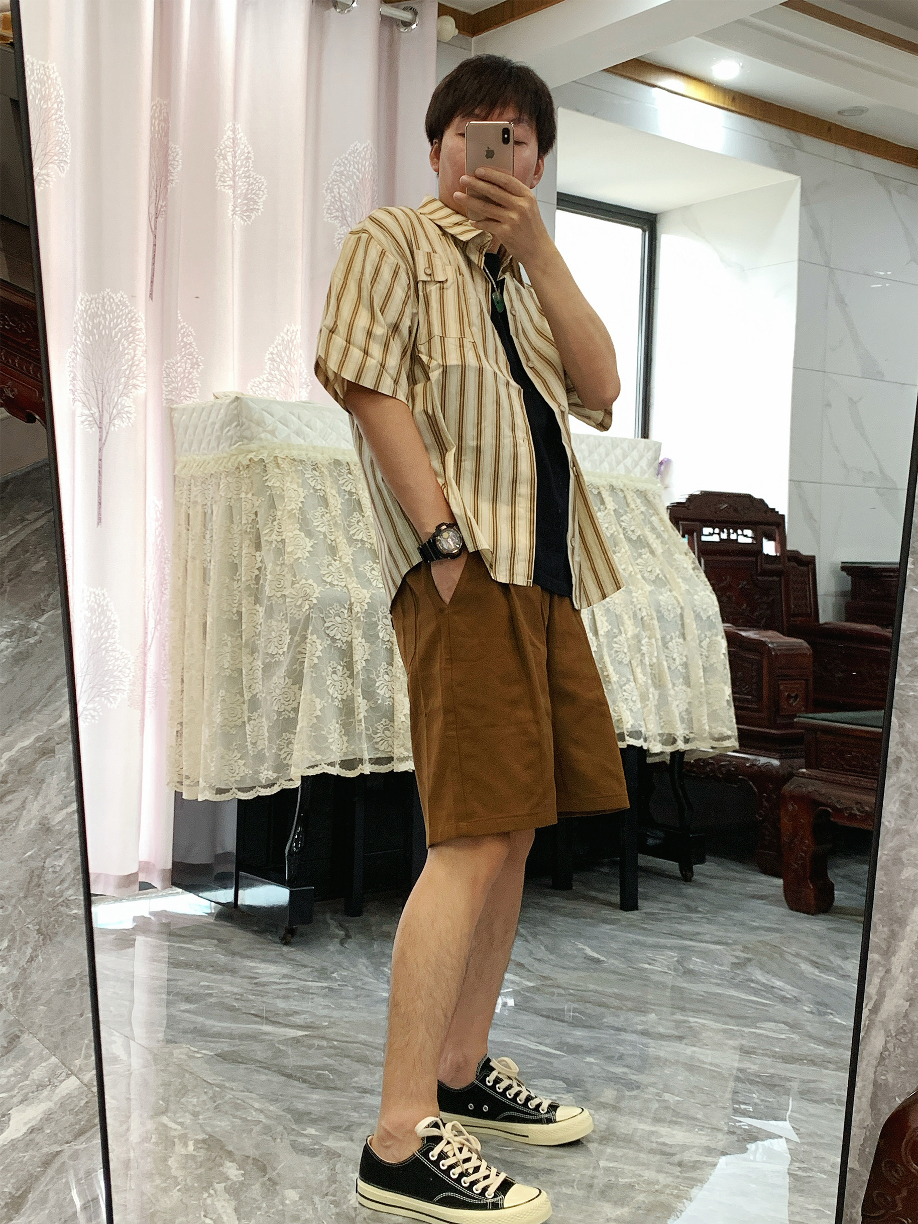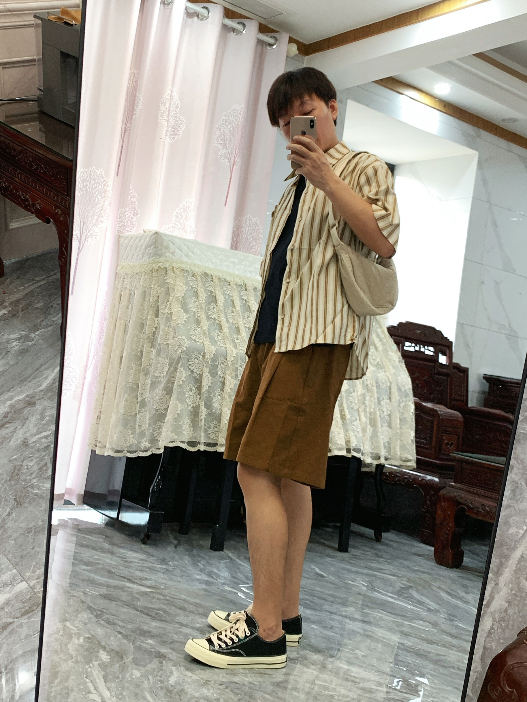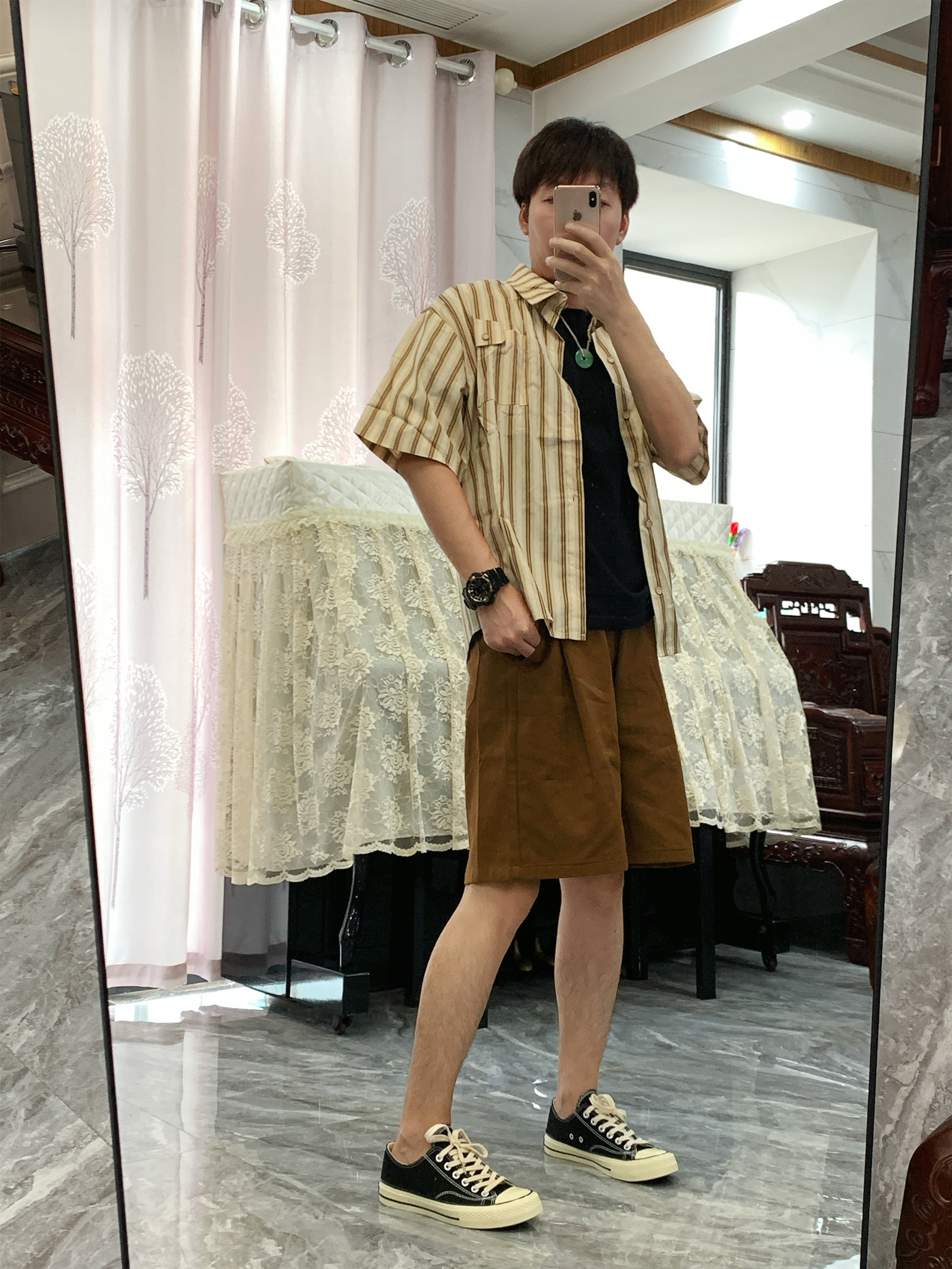 今日穿搭休闲时尚,自信爆棚! 上衣纯黑 T 恤外搭条纹卡色衬衫,简约且富有层次 卡色美式短裤与上身完美适配,尽显随性自由。再加上舒适轻便的经典帆布鞋,为整体造型增添亮点 如此搭配,轻松展现时尚魅力,上街心情相当愉悦