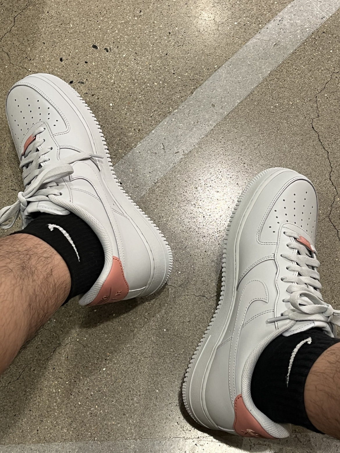 🌟颜值测评:鞋子采用af1外型设计,不同的是使用了了水泥灰为主题颜色,重点来了!!!鞋子尾部nike标志处,采用了粉色标志颜色,使其鞋子看上去不会那么单调,搭配短裤🩳,牛仔裤👖,阔腿裤,都是不错的选择 ❌缺点:鞋子底部里面是有气垫,但是⚠️,气垫不大,没有缓震的感受,硬硬的,走路走久会脚🦶掌痛,但不影响这款鞋子的美观👍👍👍