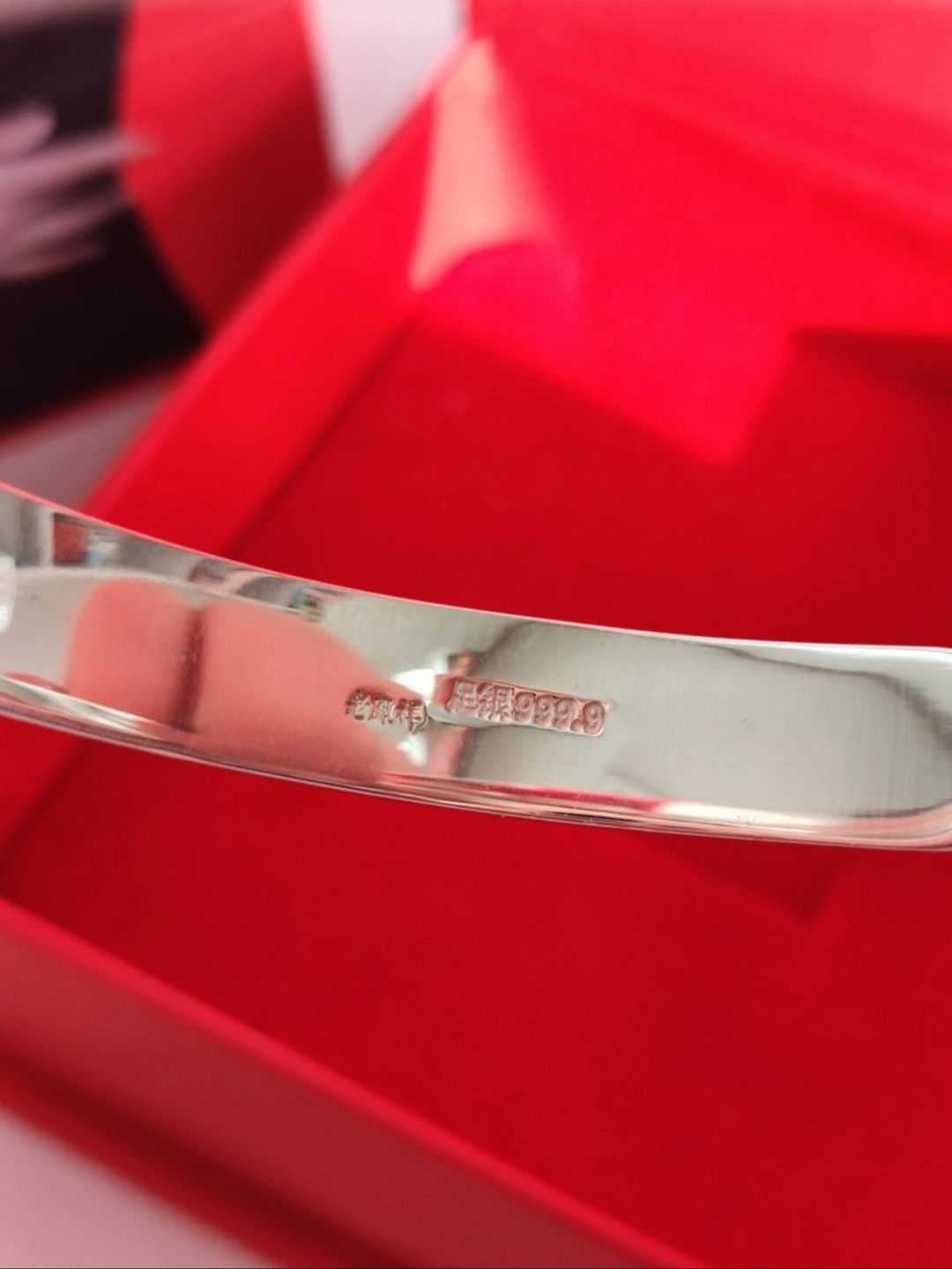 老凤祥银手镯,手镯是宽的,很适合妈妈戴,而且手镯上的图案非常好看,是足银的,妈妈很喜欢!