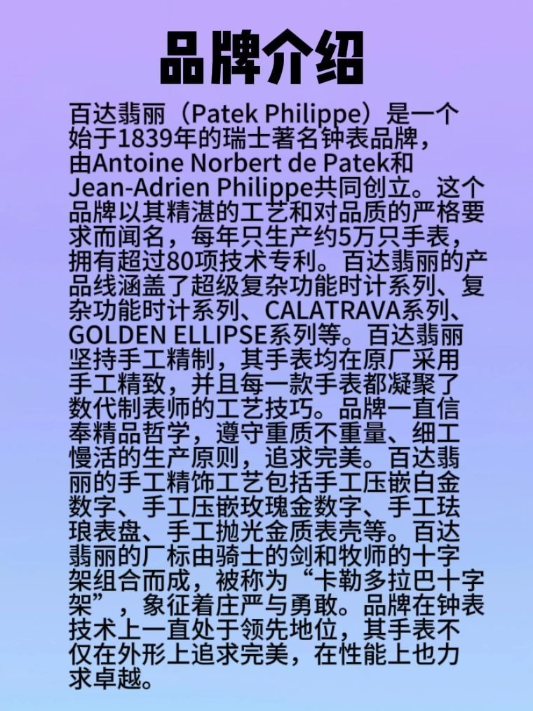 ☘️品牌介绍 百达翡丽(Patek Philippe)是一个始于1839年的瑞士著名钟表品牌,由Antoine Norbert de Patek和Jean-Adrien Philippe共同创立。这个品牌以其精湛的工艺和对品质的严格要求而闻名,每年只生产约5万只手表,拥有超过80项技术专利。百达翡丽的产品线涵盖了超级复杂功能时计系列、复杂功能时计系列、CALATRAVA系列、GOLDEN ELLI...