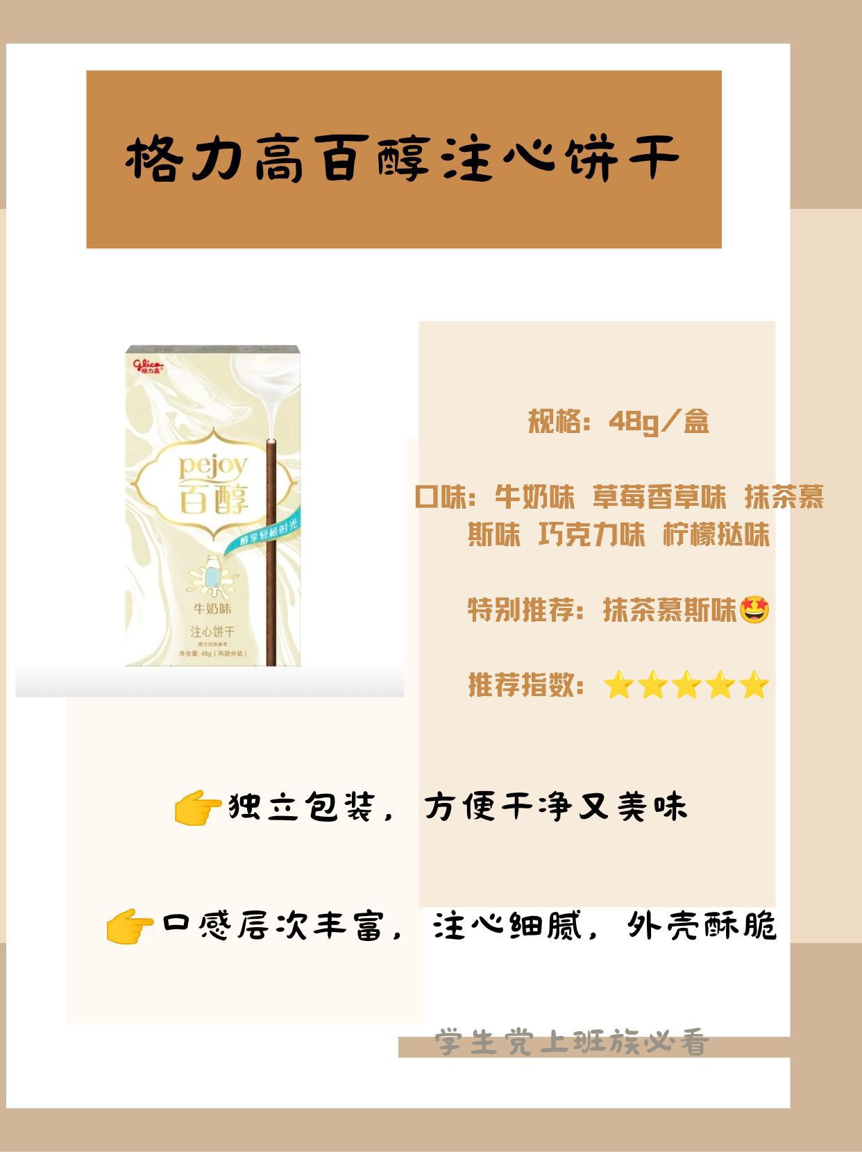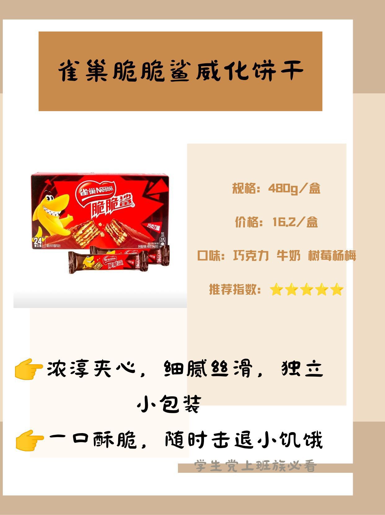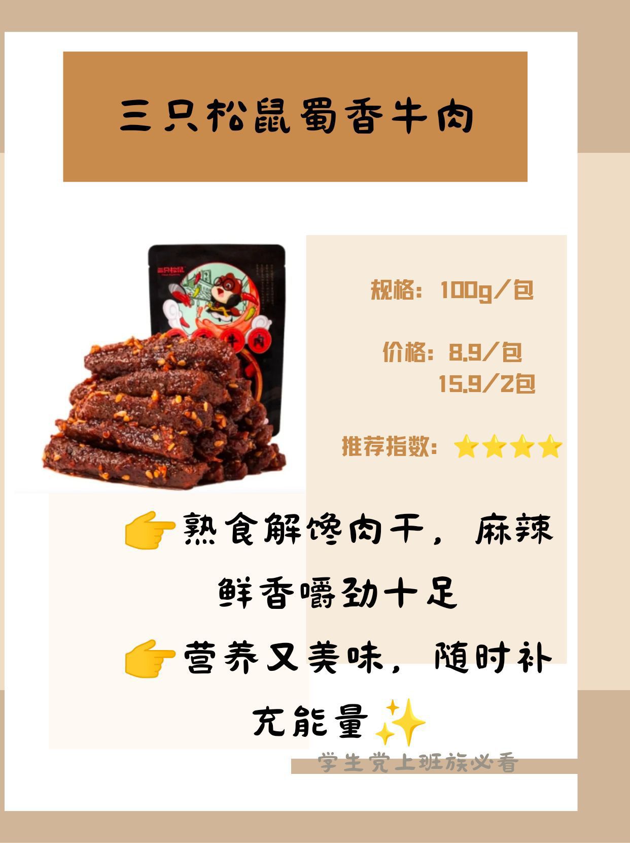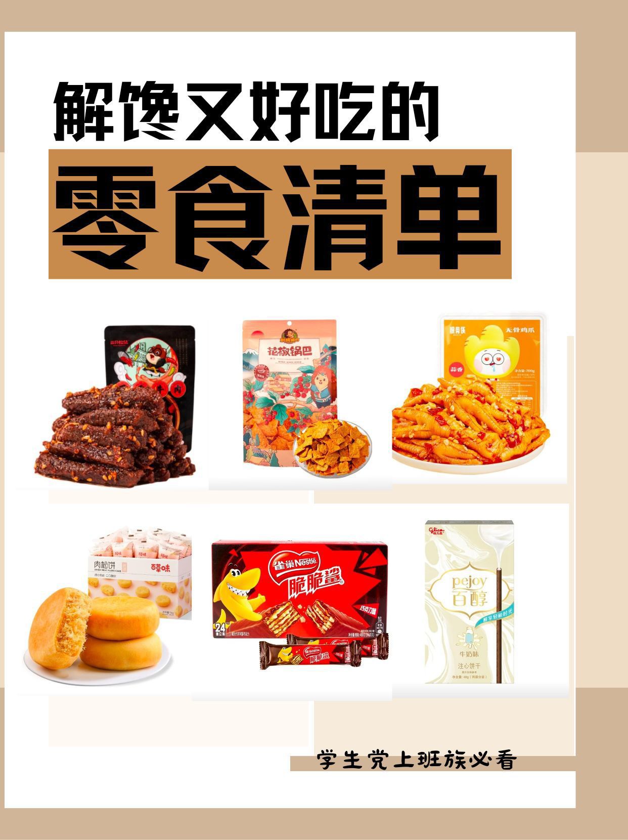 上班族和学生党必备的零食清单来了🙌 今天给大家分享六种超级好吃的零食,每一种都是休闲时刻的心头爱✨ ✅三只松鼠蜀香牛肉 麻辣鲜香,每一丝牛肉都嚼劲十足,有一种四川的热辣风情,营养美味,随时补充能量 ✅格力高百醇注心饼干 酥脆的外皮包裹着丝滑的注心,有好多种口味可以选择,满足各种不同喜好 ✅百草味肉松饼 满满的肉松馅料,适量的绿豆沙中和了肉松多的腻口,一口下去超满足 ✅雀巢脆脆鲨威...