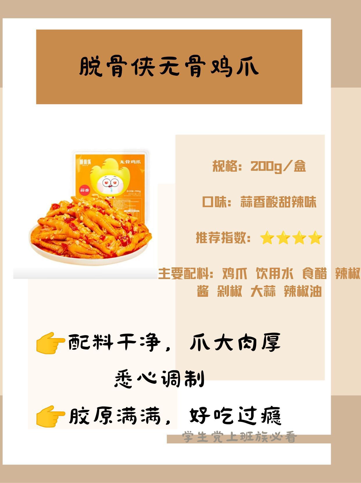 本篇笔记关联了三只松鼠 蜀香牛肉 麻辣味 100g 袋装 冷吃夜宵解馋香辣 100g、脱骨侠 蒜香酸辣甜柠檬无骨鸡爪200g网红凤爪解馋零食小吃休闲食品 基础色、Nestle/雀巢 威化饼干 儿童节 480g 盒装 休闲食品零食小吃解馋酥脆充饥巧克力涂层追剧小包装 巧克力等商品,为用户提供真实的使用体验和购买参考。
