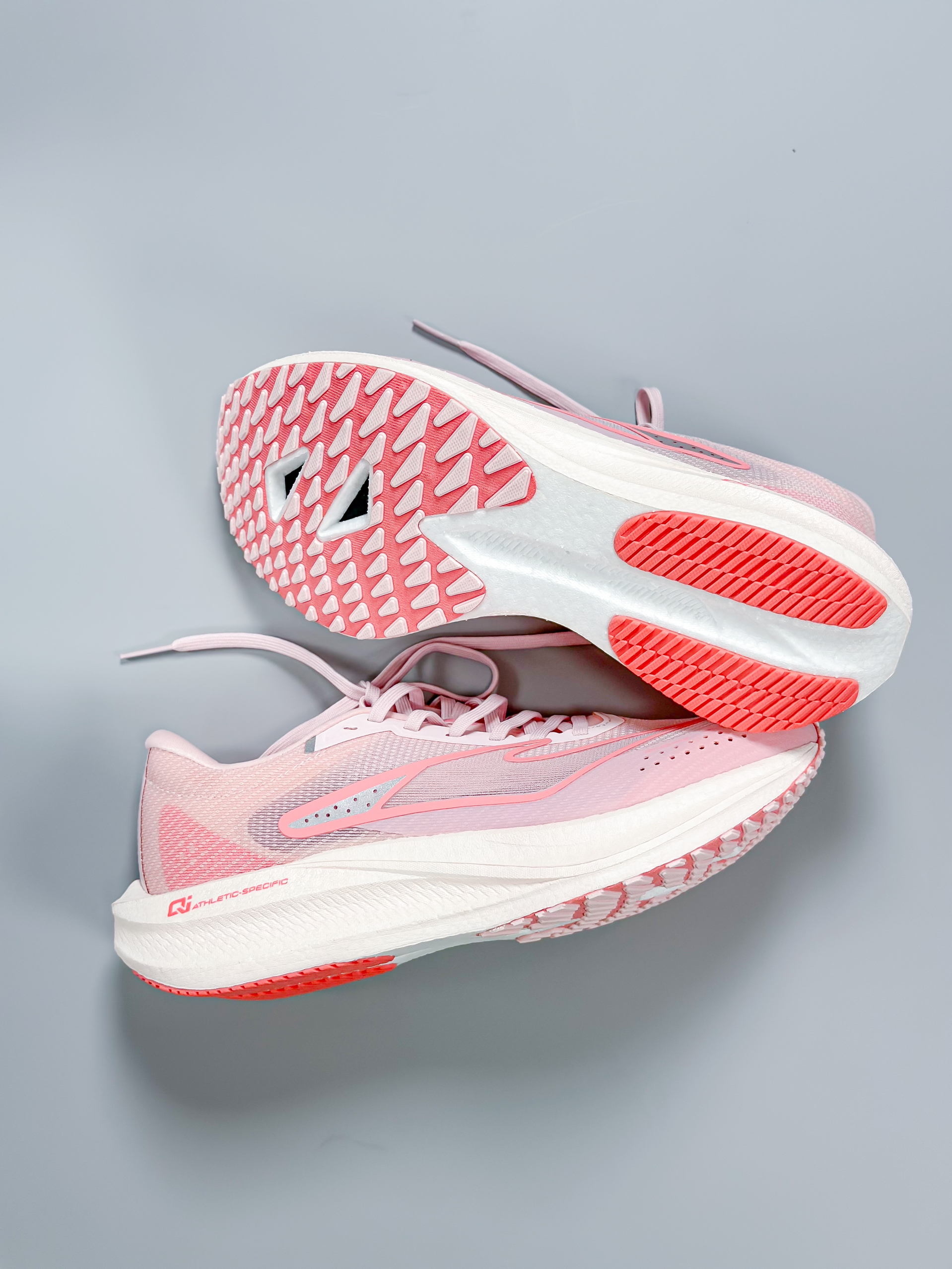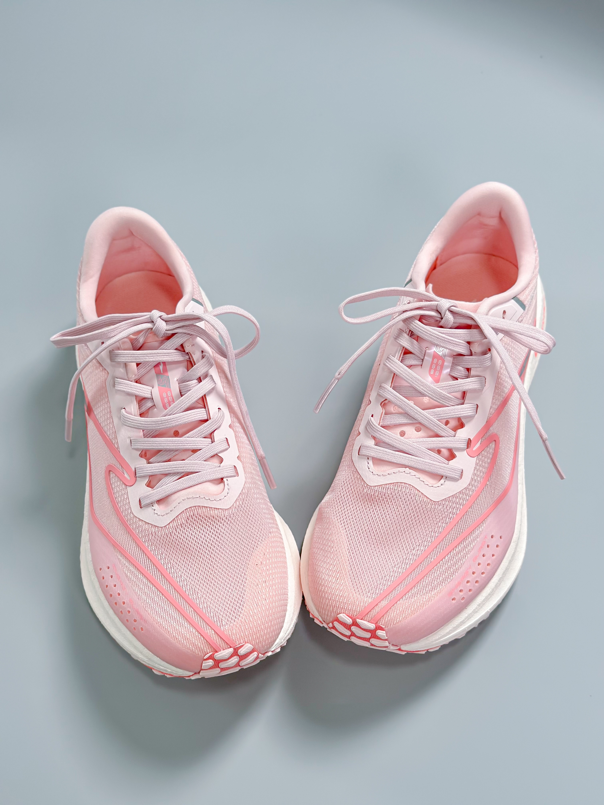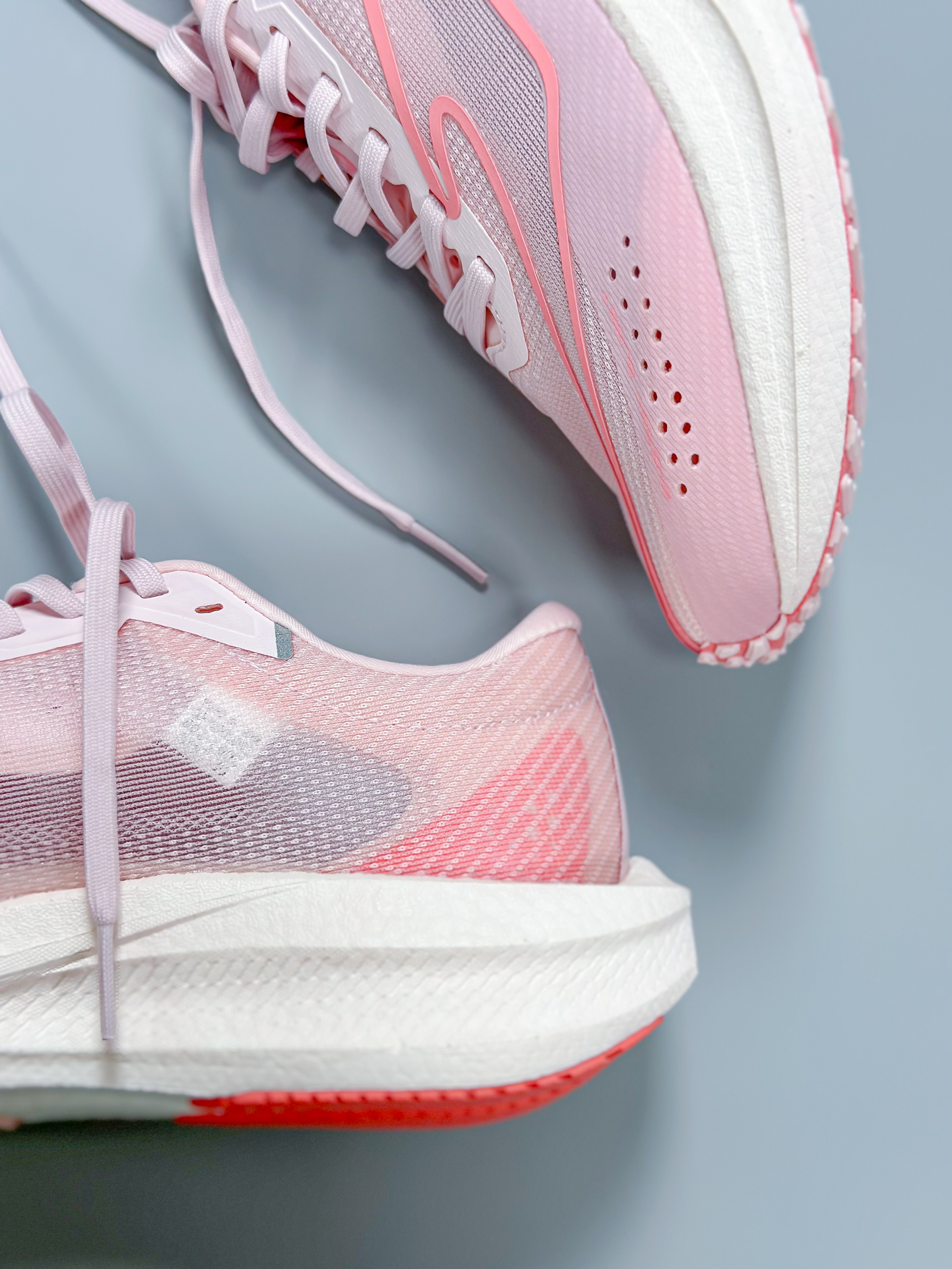 啊啊啊,尊滴一眼爱上这双山茶粉配色跑鞋🌸 网纱鞋面hin薄hin透气,夏天跑步也不怕闷🦶 上jio非常轻盈软弹,回弹效果杠杠滴👍 夏天穿出门运动,尊滴亮眼敲喜欢🥰