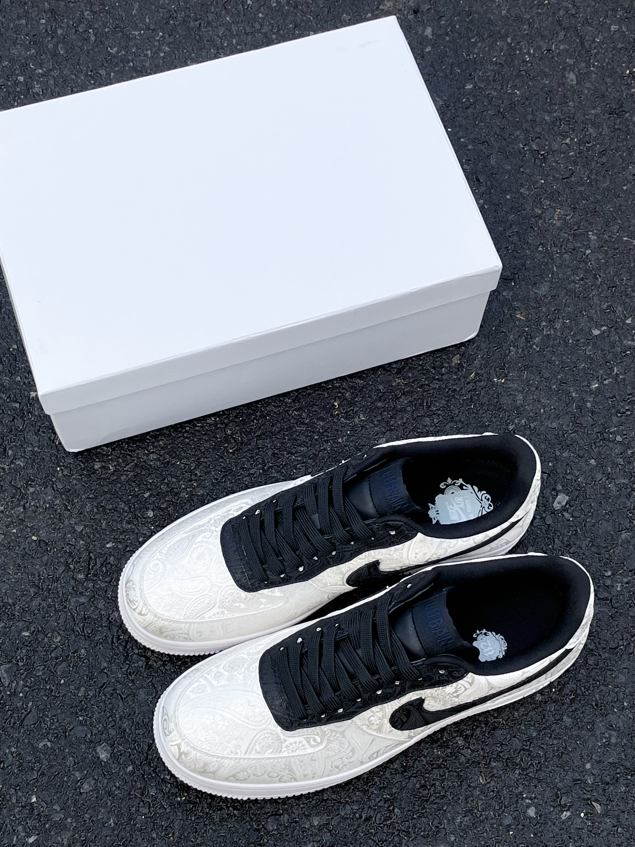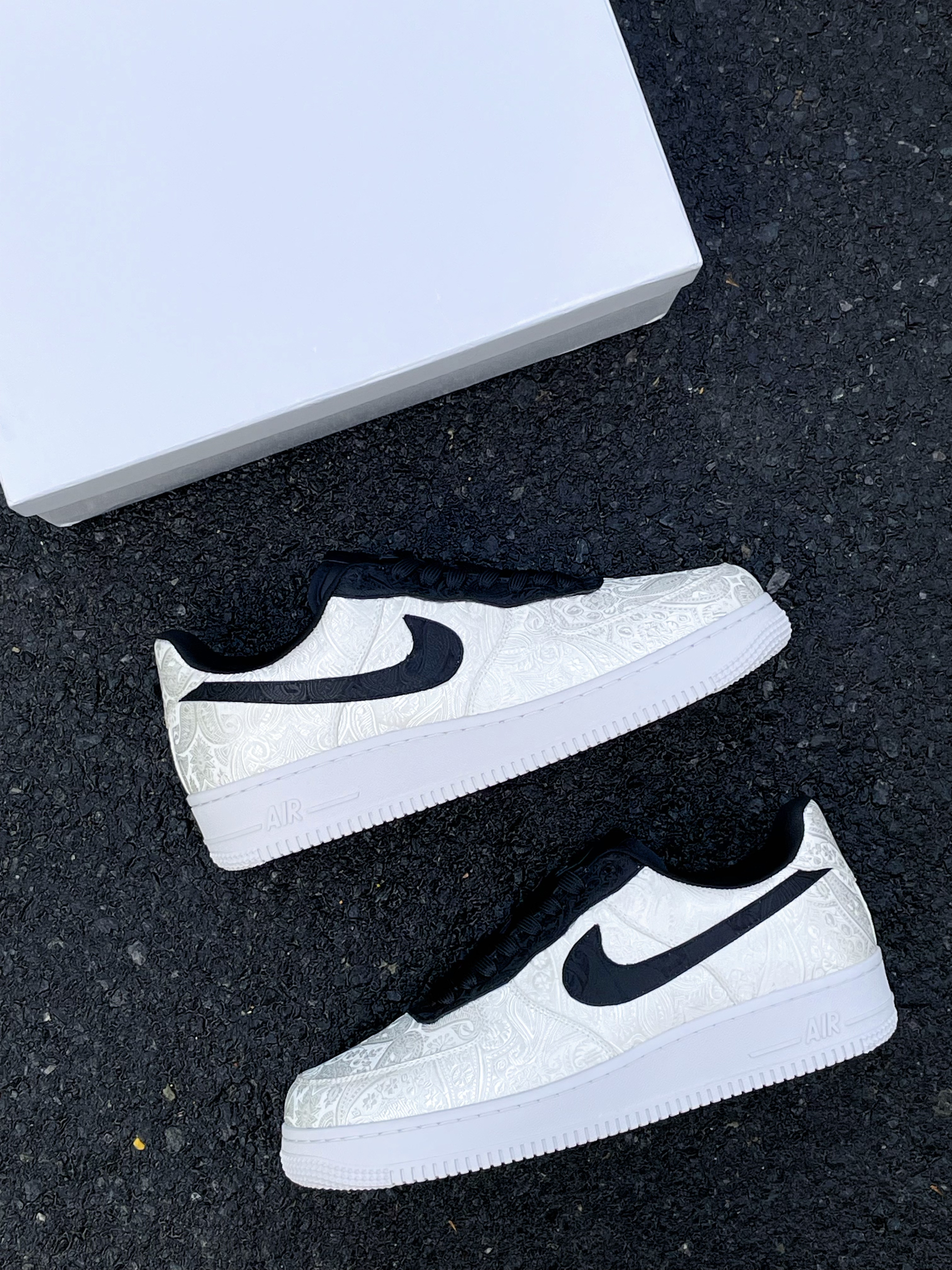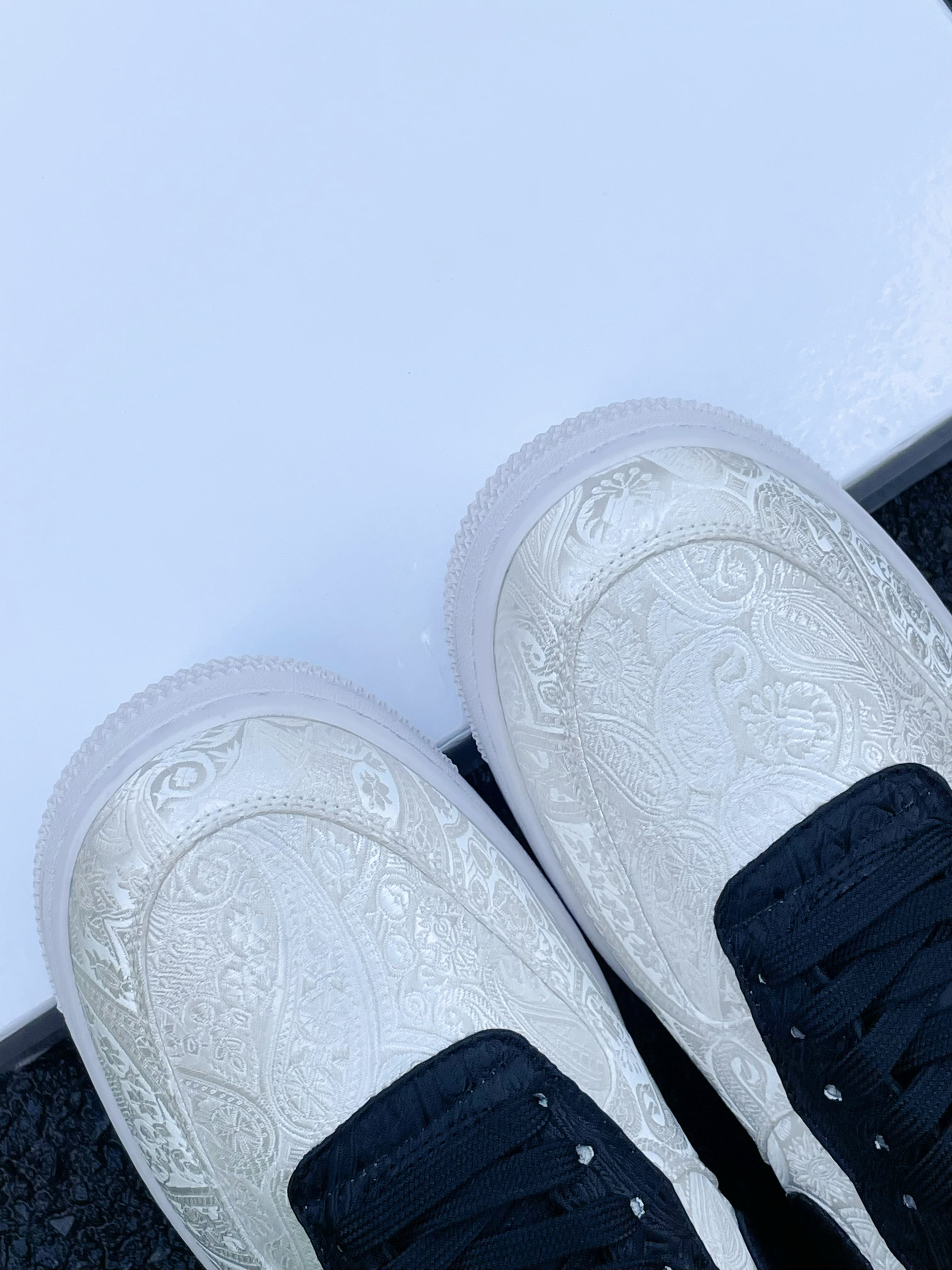 今天给大家分享这双 空军一号 国风 丝绸 腰果花『黑白』板鞋👟 鞋款由经典的黑色和白色为主色调 鞋面运用了腰果花图案的丝绸材质 鞋身两侧的黑色Swoosh丰富了层次感 中底3️⃣公分左右的增高也可以有效修饰腿型 整体来说这是一双兼具颜值/设计的高定板鞋👟 时尚潮流 高级复古 适合日常休闲通勤搭配 并且还有定制礼盒🎁以及配件附送哦‼️ ⚠️尺码方面建议选择正码 喜欢的小伙伴们可以赶紧关注起来哦‼️