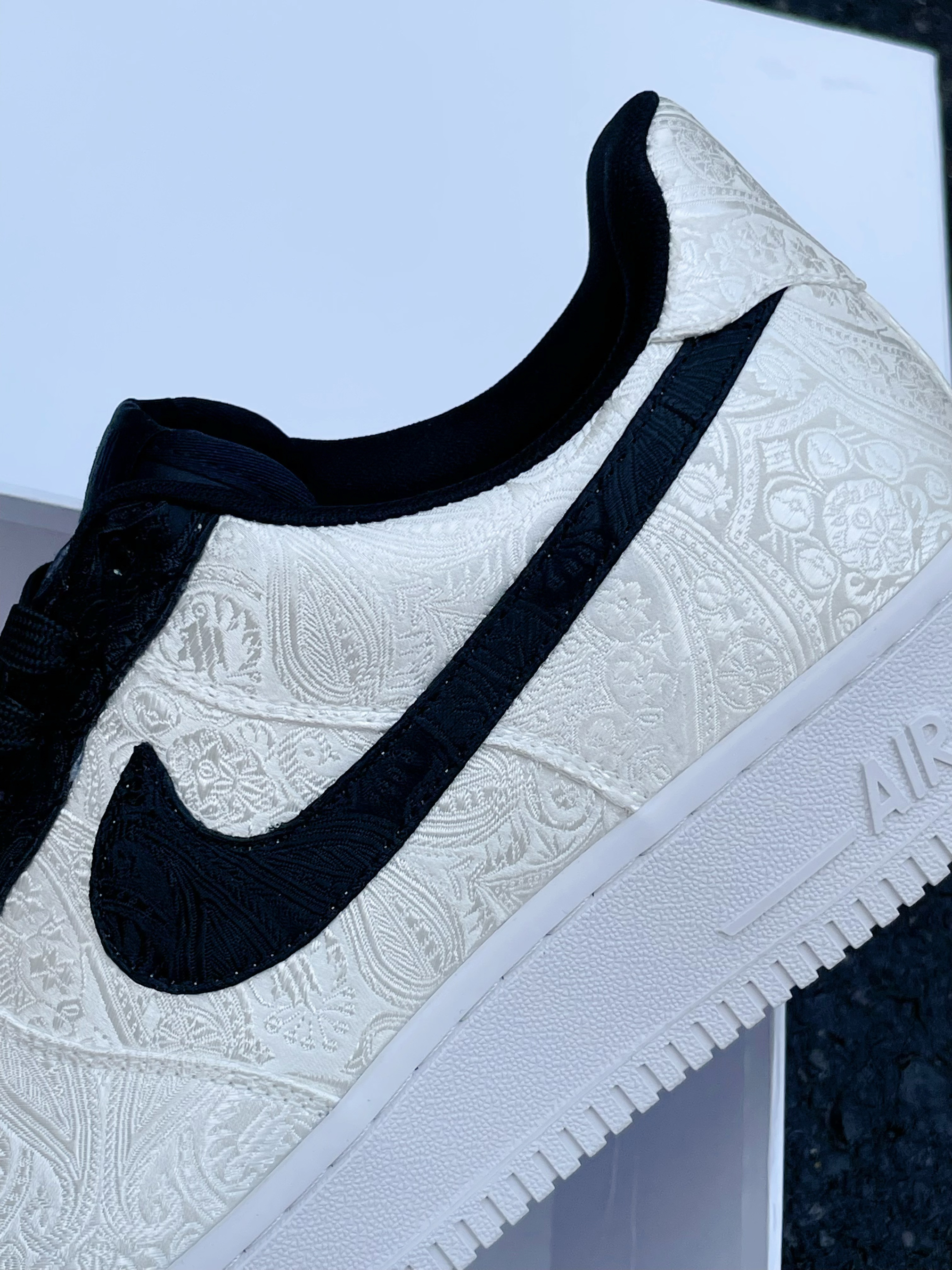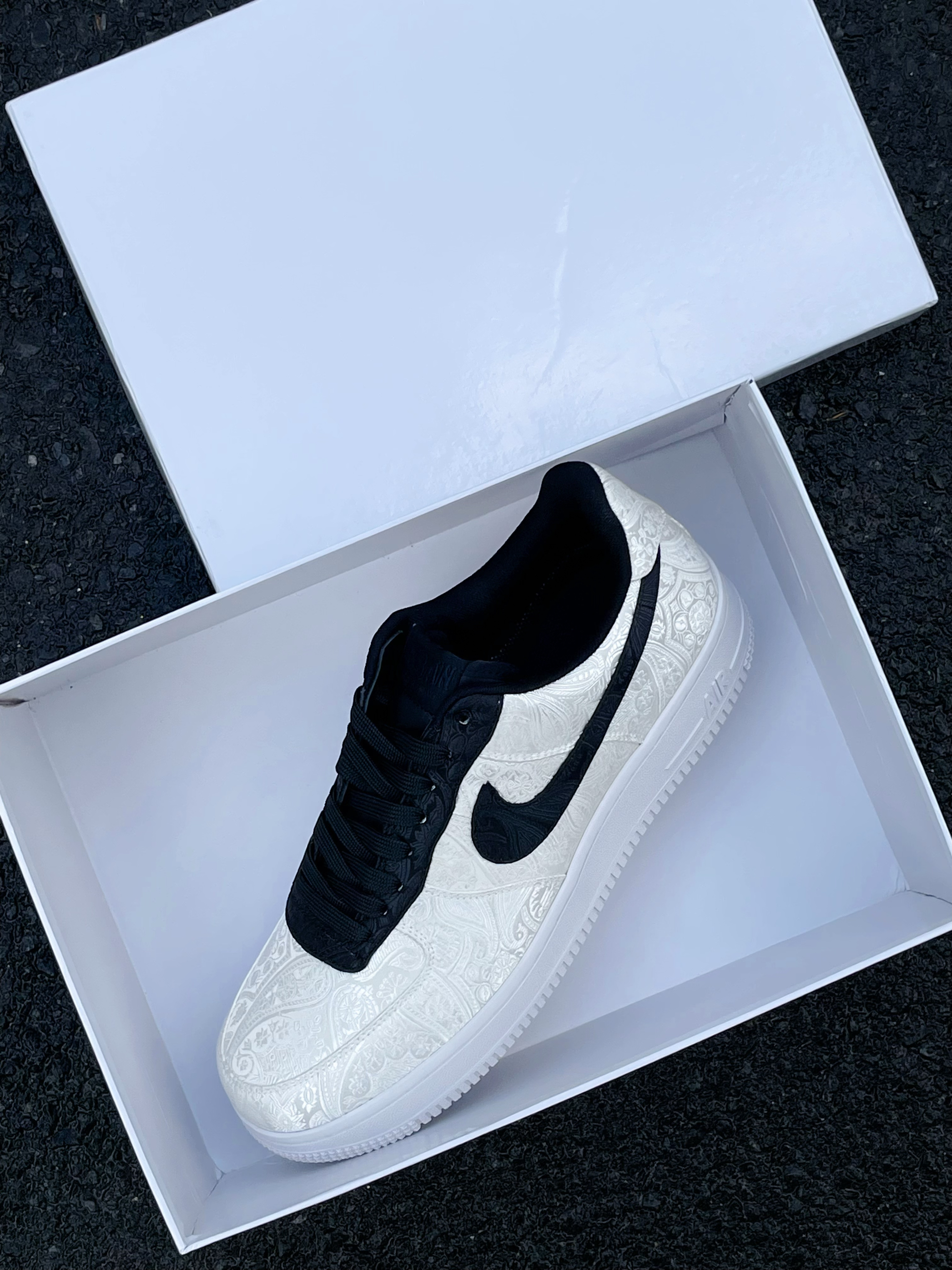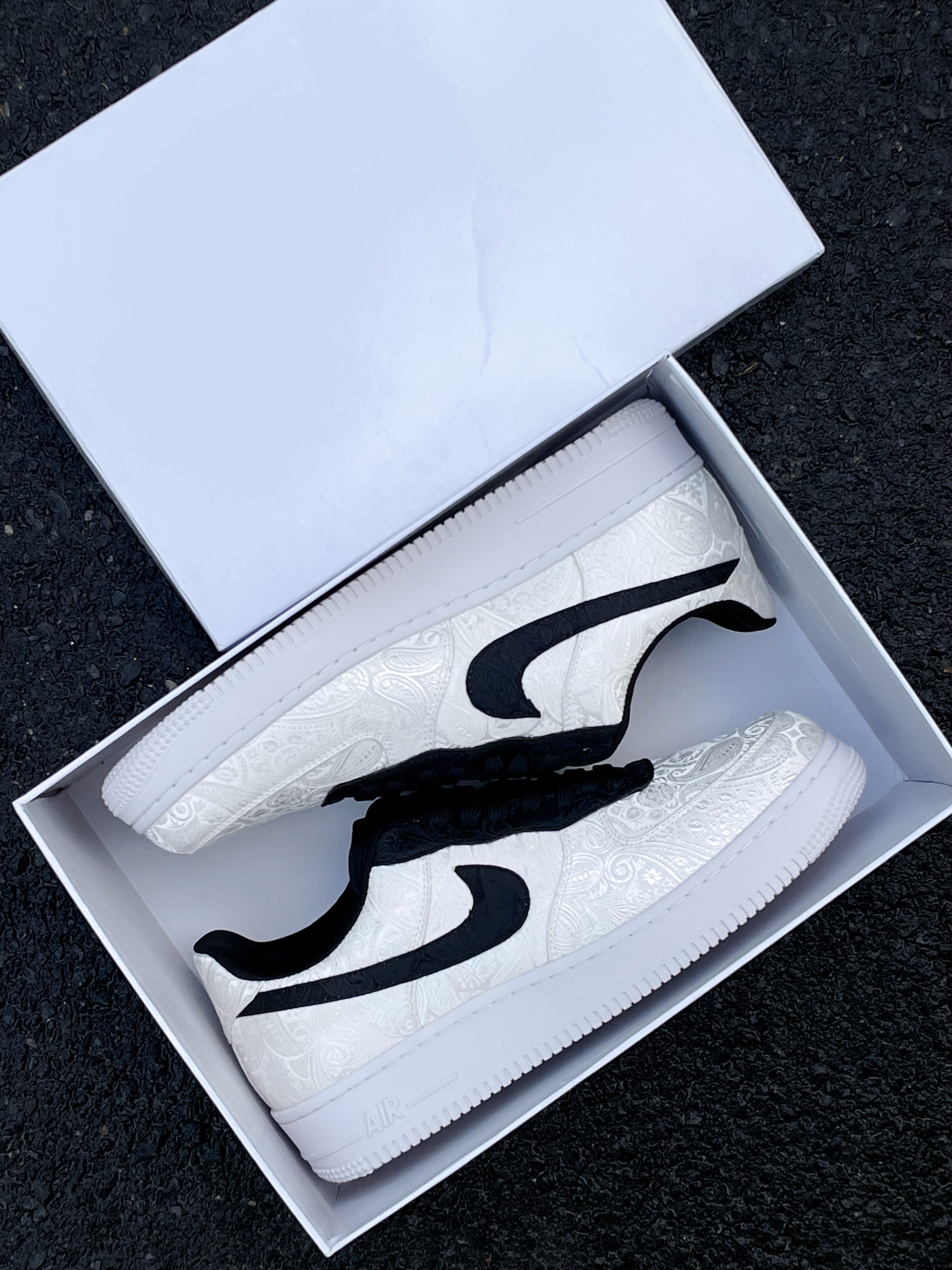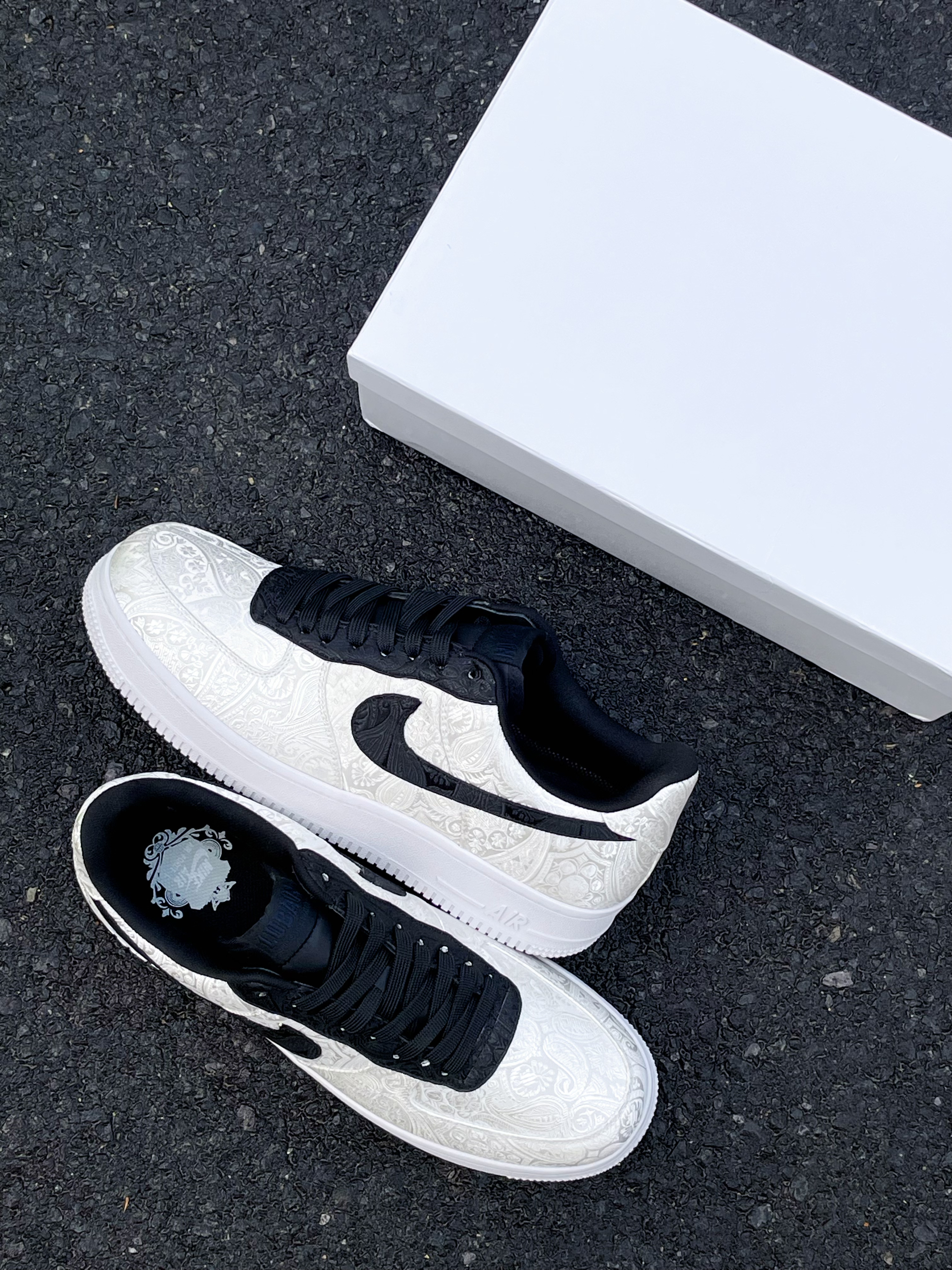 今天给大家分享这双 空军一号 国风 丝绸 腰果花『黑白』板鞋👟 鞋款由经典的黑色和白色为主色调 鞋面运用了腰果花图案的丝绸材质 鞋身两侧的黑色Swoosh丰富了层次感 中底3️⃣公分左右的增高也可以有效修饰腿型 整体来说这是一双兼具颜值/设计的高定板鞋👟 时尚潮流 高级复古 适合日常休闲通勤搭配 并且还有定制礼盒🎁以及配件附送哦‼️ ⚠️尺码方面建议选择正码 喜欢的小伙伴们可以赶紧关注起来哦‼️