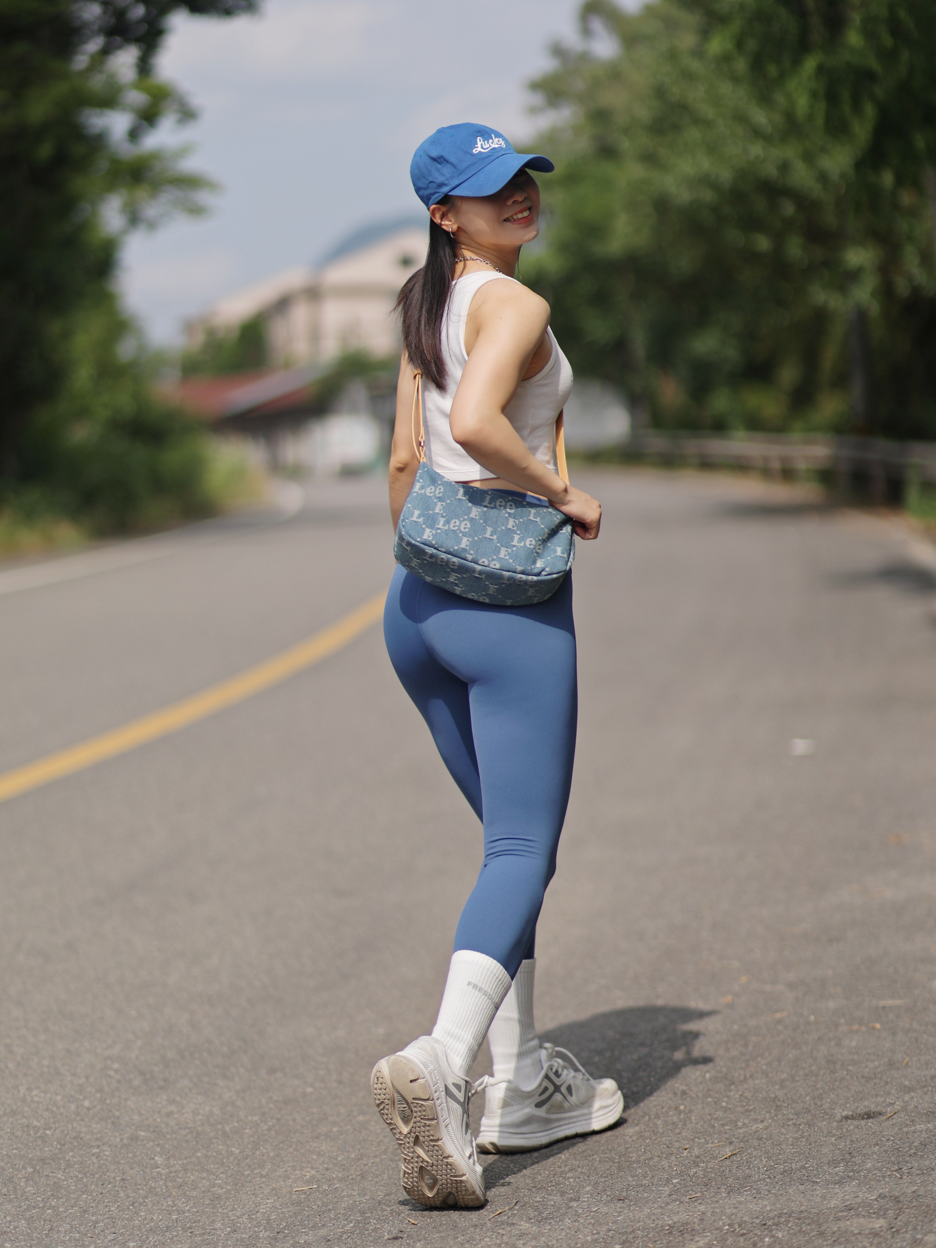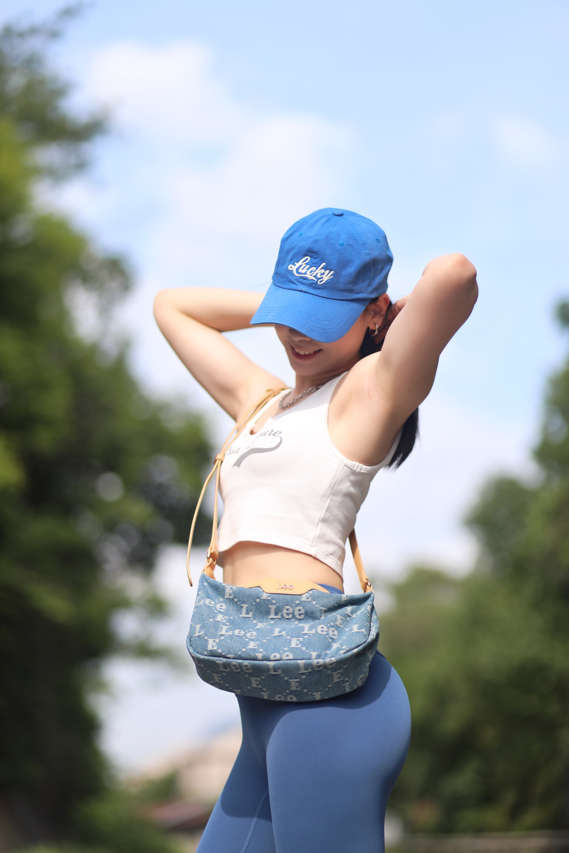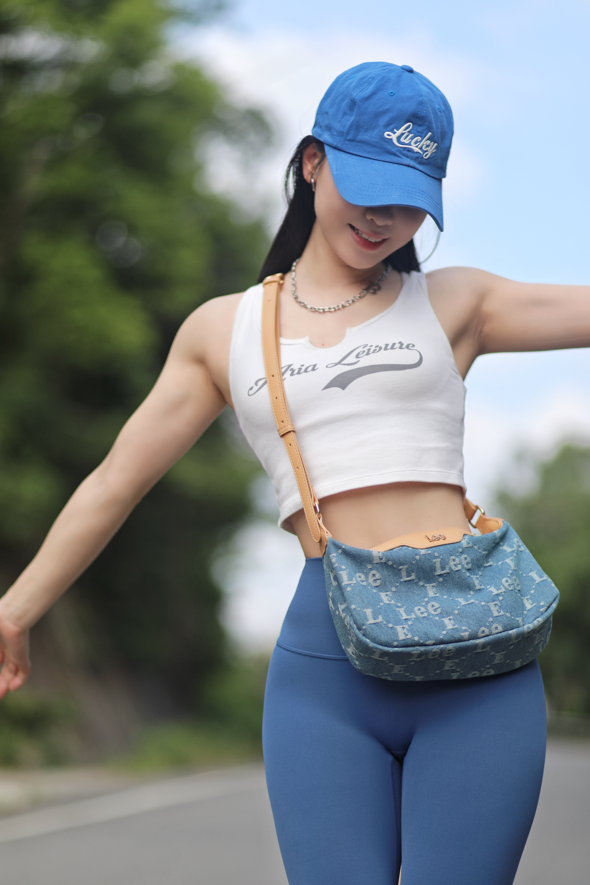 健身5年啦~ 每天都有在认真健身 慢慢向着自己的理想身材靠近 虽然还不是很优秀 但是是我喜欢的细腰肉腿轻线条啦~ 只要付出努力就一定会有收获~~ 今天一身蓝色系夏日穿搭 出门遇到了很好看的风景 好像走进了宫崎骏的漫画世界 包包是Lee老花月牙包 小巧精致适合夏天背 虽然小但是容量还挺大的