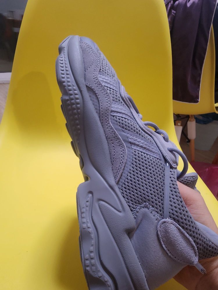 这是一双灰色的阿迪鞋子,直观的感受是通体灰色怎么能做到这么好看的呀,材质上由泡面填充皮革加上透气网的拼接,大底采用一个多形态的凸起,防滑作用很棒! 透气舒适度,防滑性能都上层1而且颜值也是一绝,如果再省米一点真能起飞!