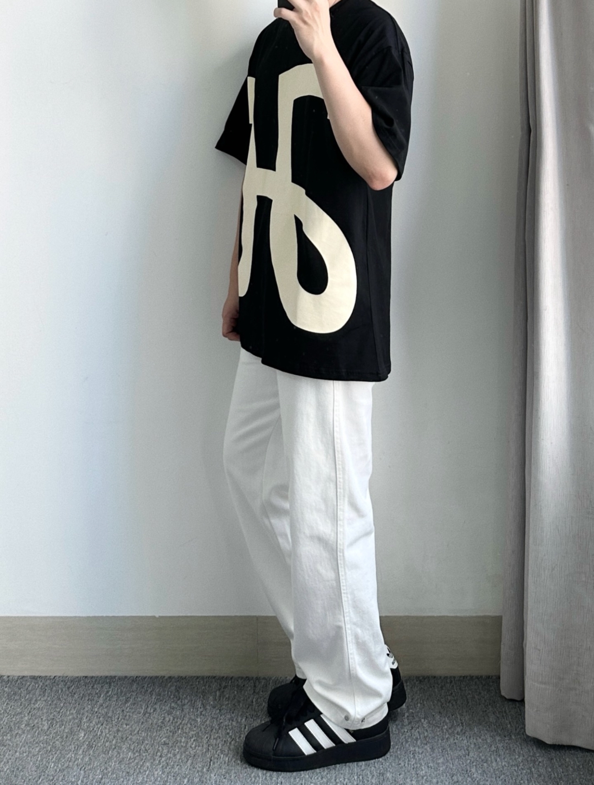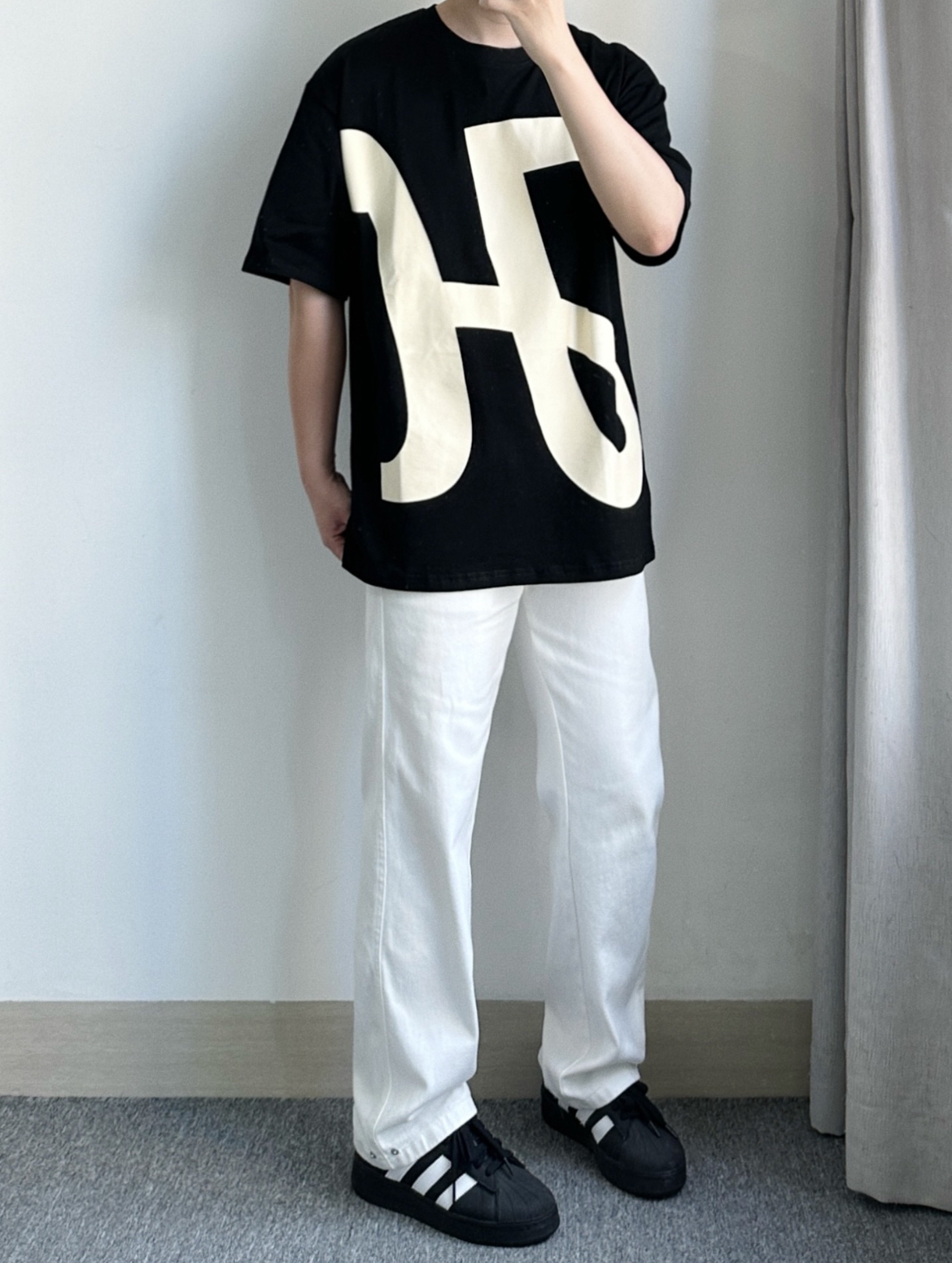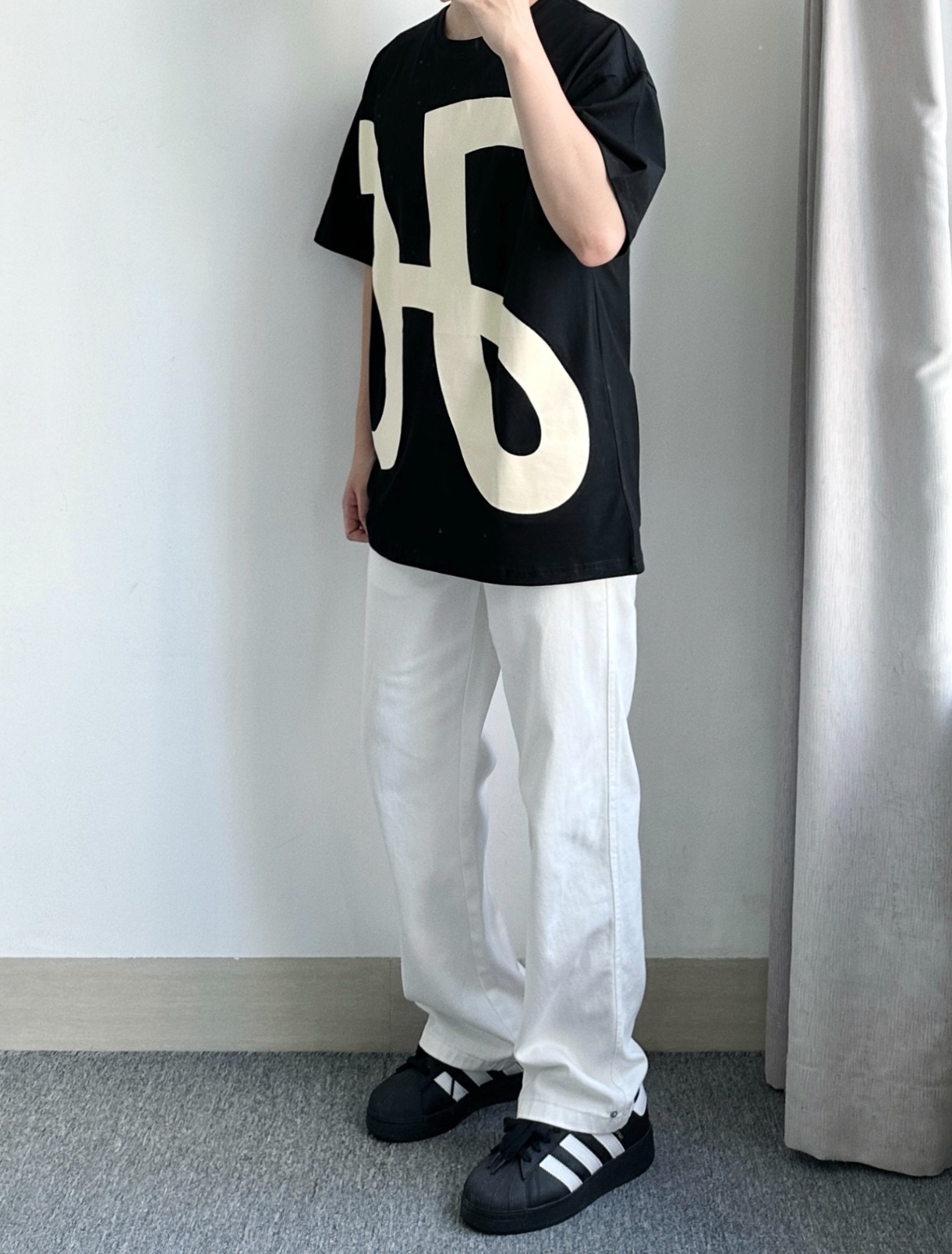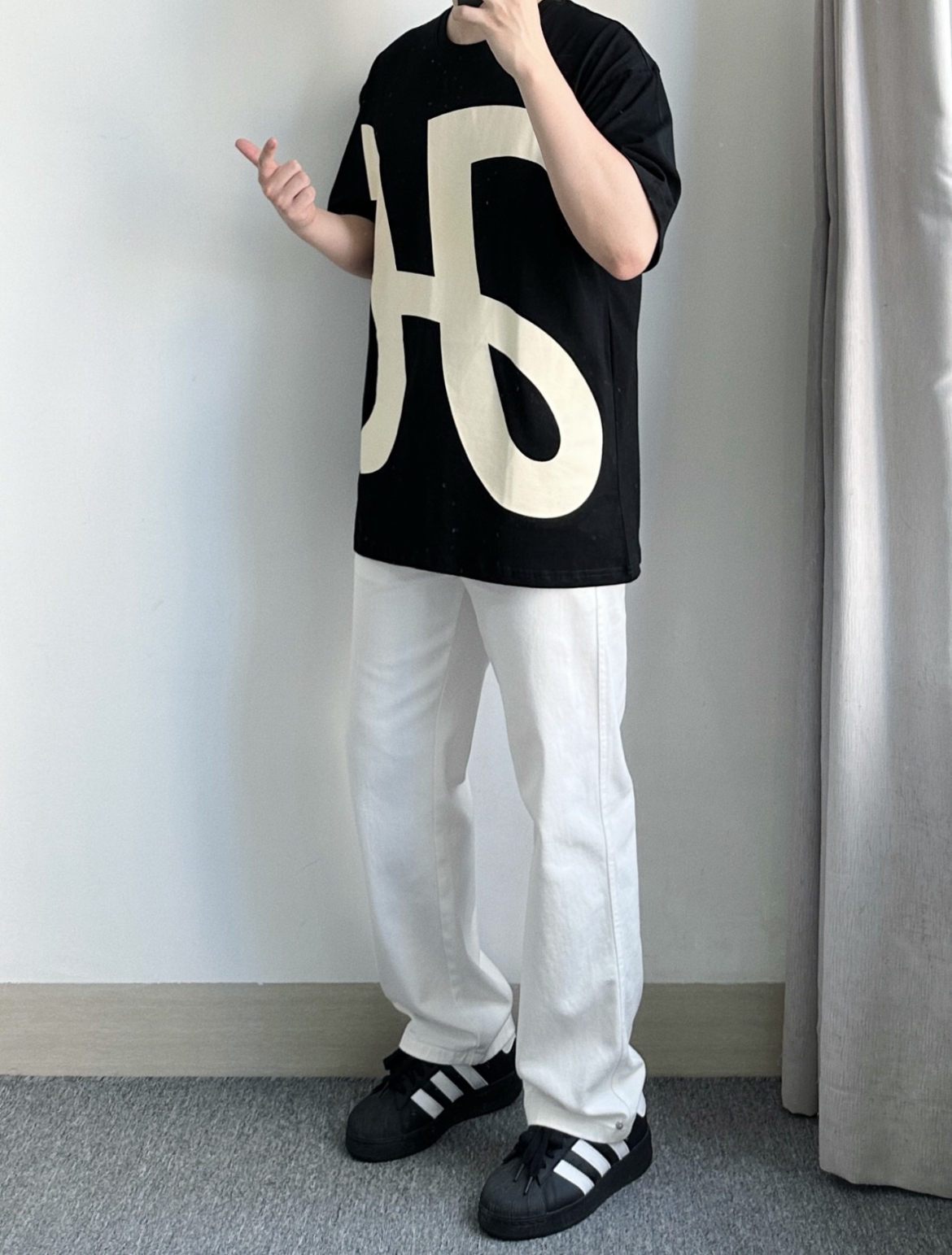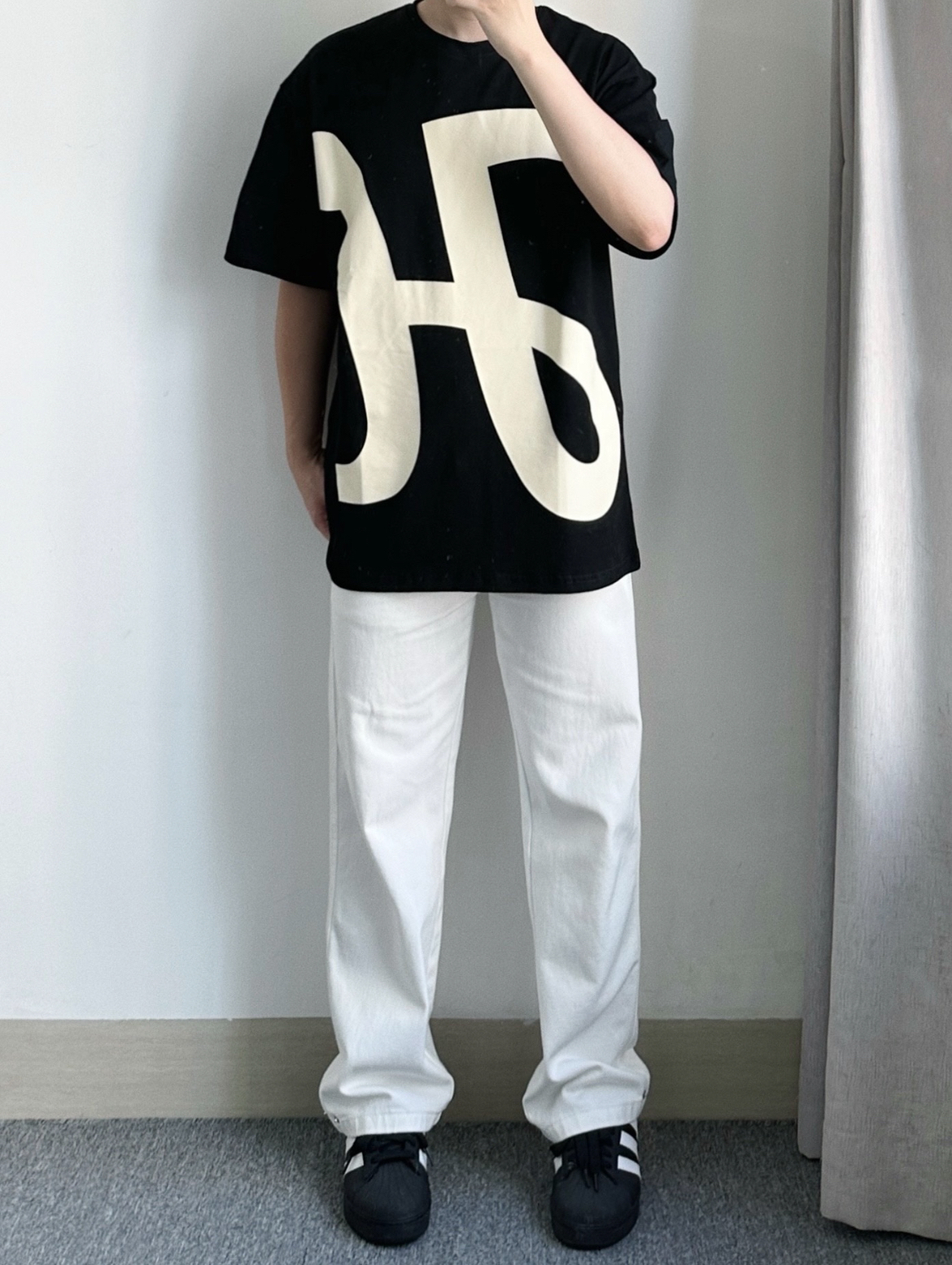 这一件大印花的短袖上身可太有回头率啦! 搭配很有设计感,穿着感挺舒服的,黑色的印花短袖➕白色的牛仔裤整体看起来也很时尚帅气,夏天穿着干净清爽就很好看啦!