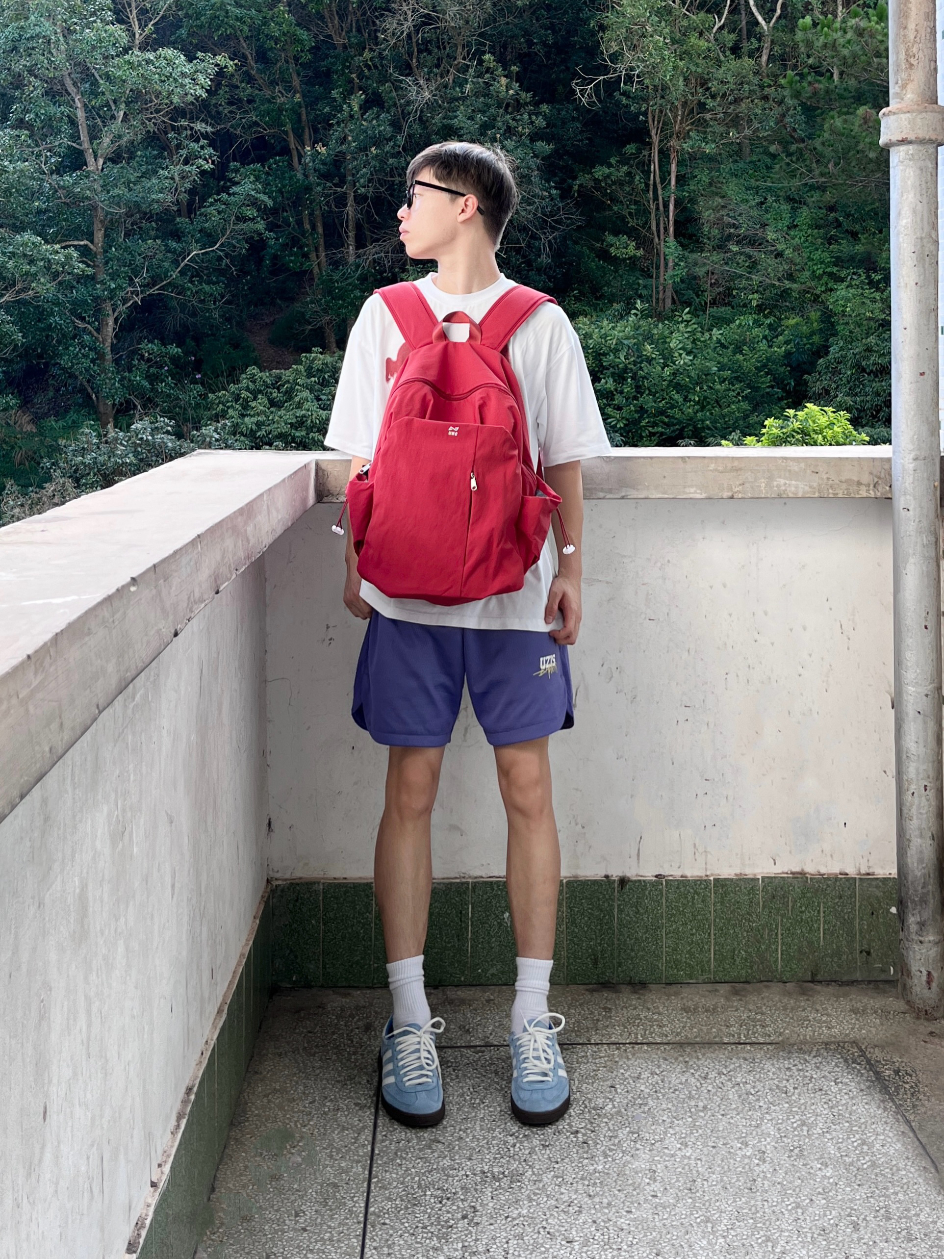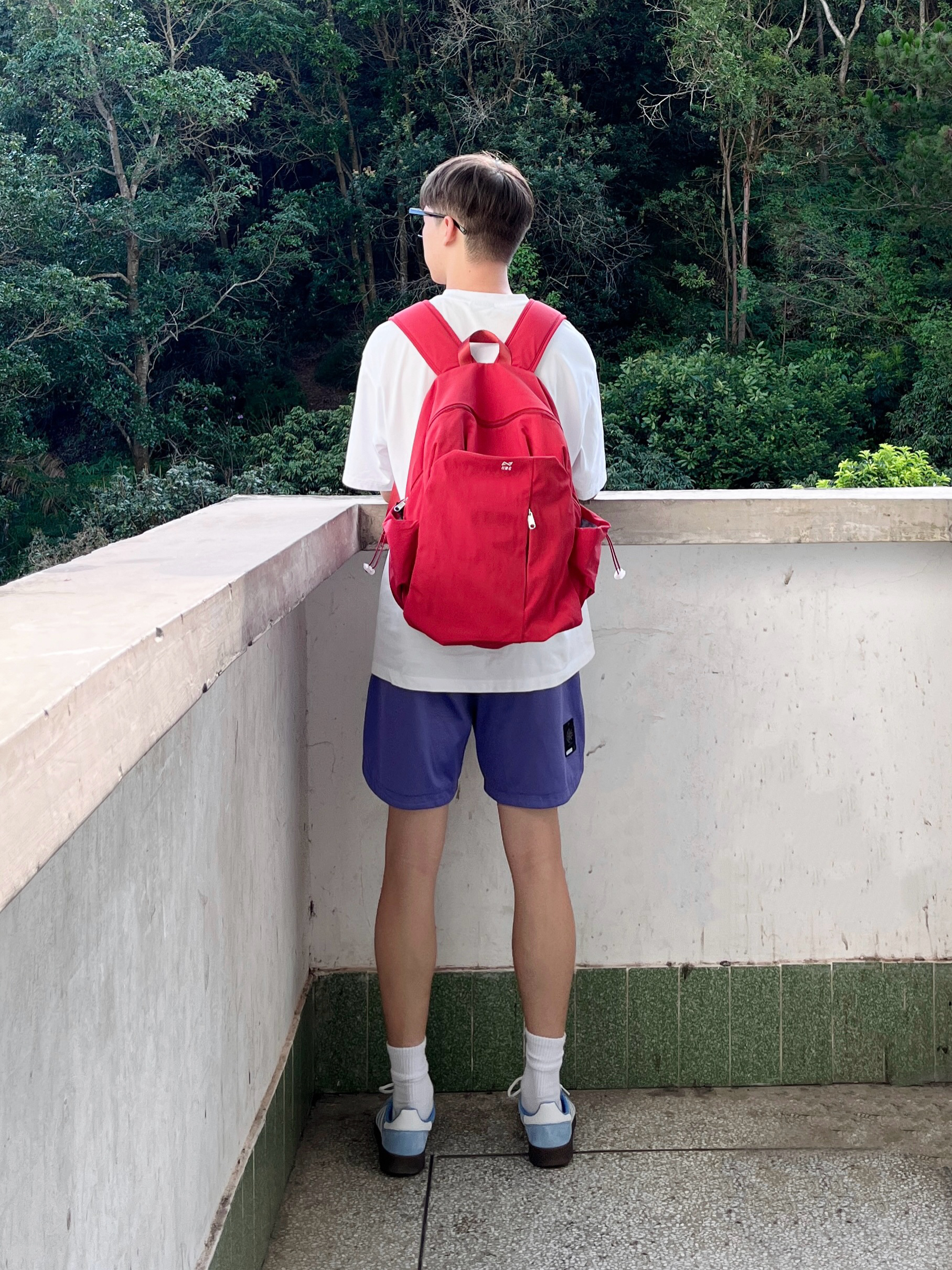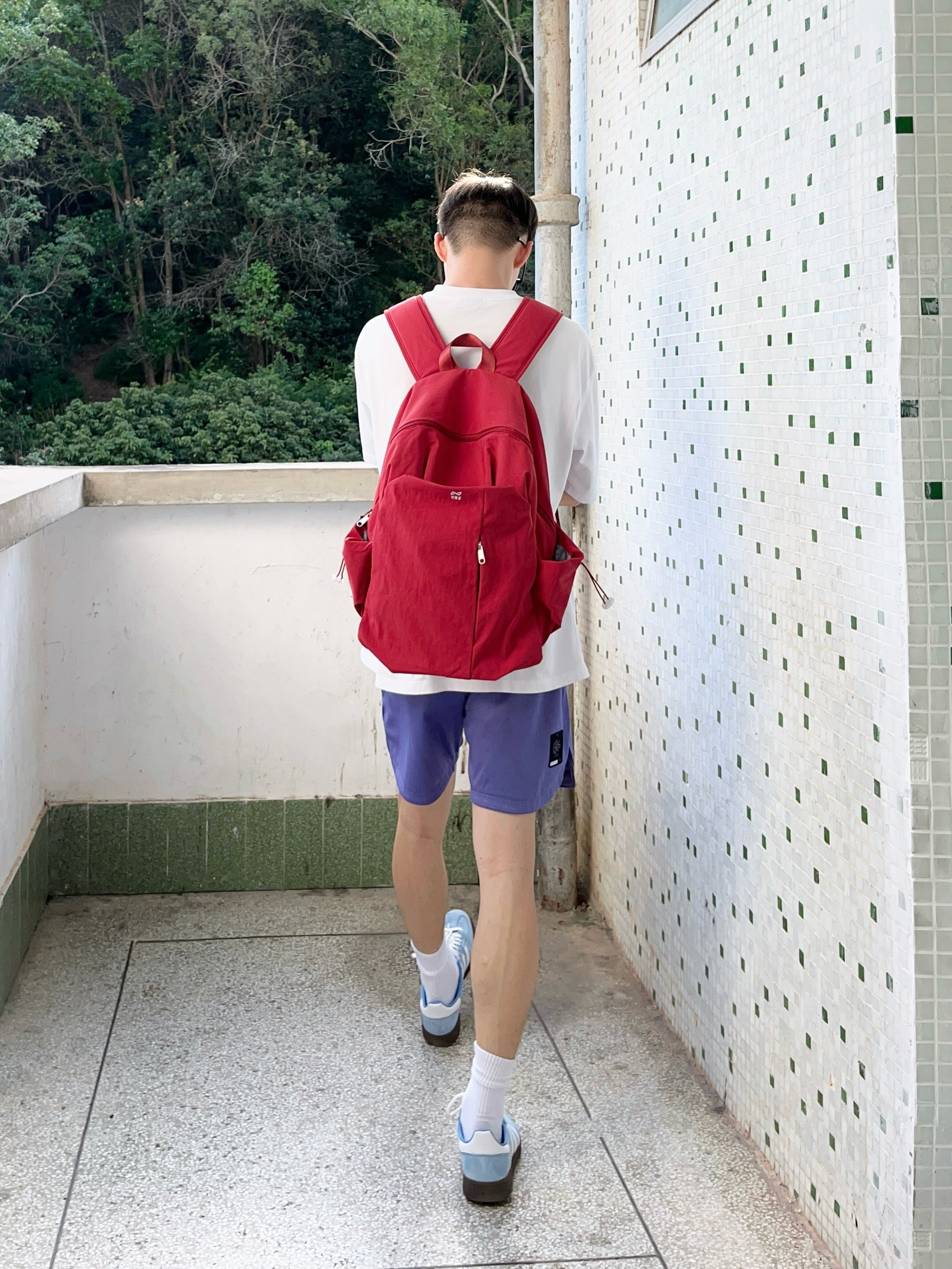 今日份穿搭分享look👀 衣服是白色的简约复古风T恤 搭配一条紫色休闲工装短裤 背的是 轻骑者 家的红色潮流双肩包🎒 颜值简约时尚 内部容量也很大 无论是日常通勤还是运动休闲都很合适 背上去真的少年感满满🥰 最后休闲德训鞋上脚点缀 一套搭配下来 百搭又好看